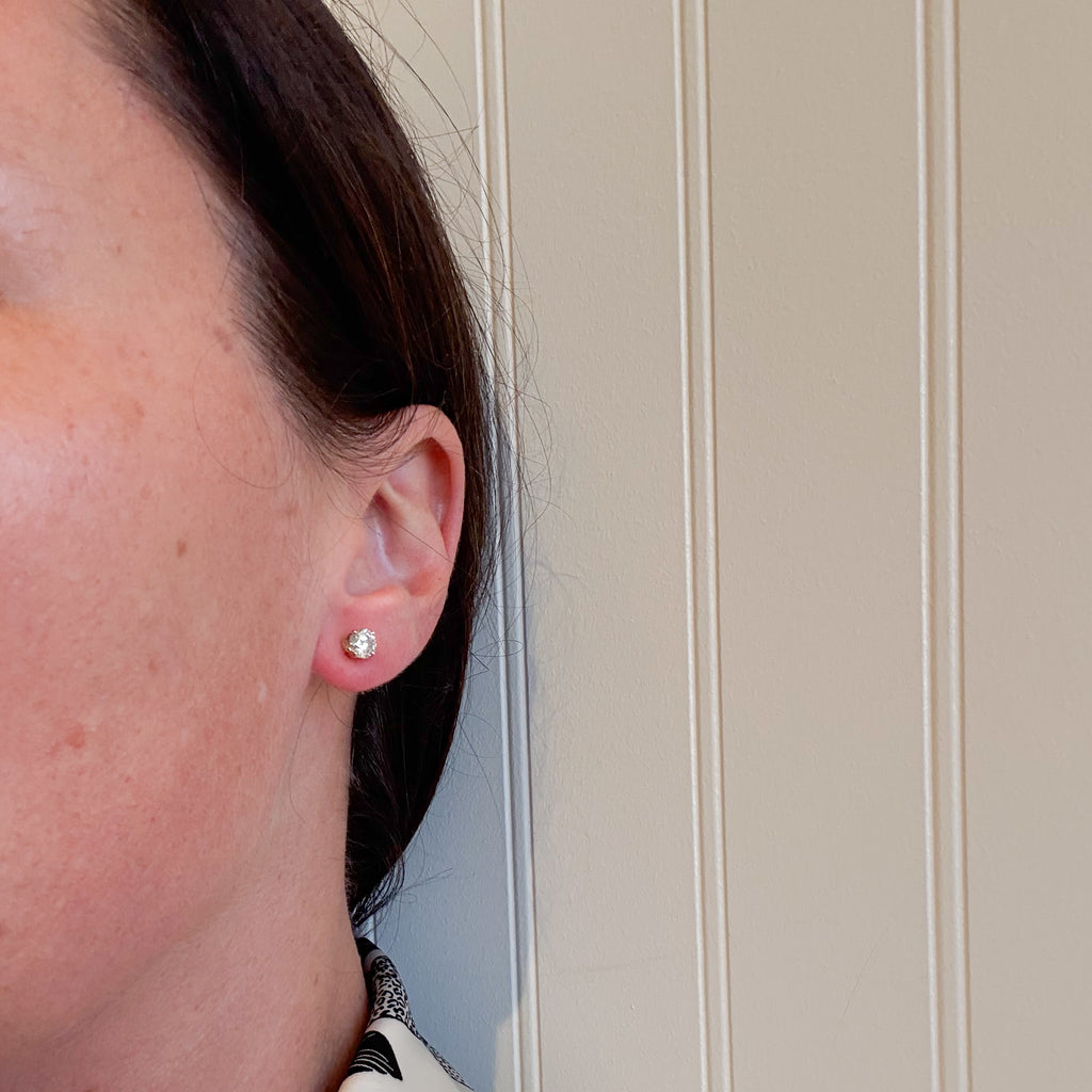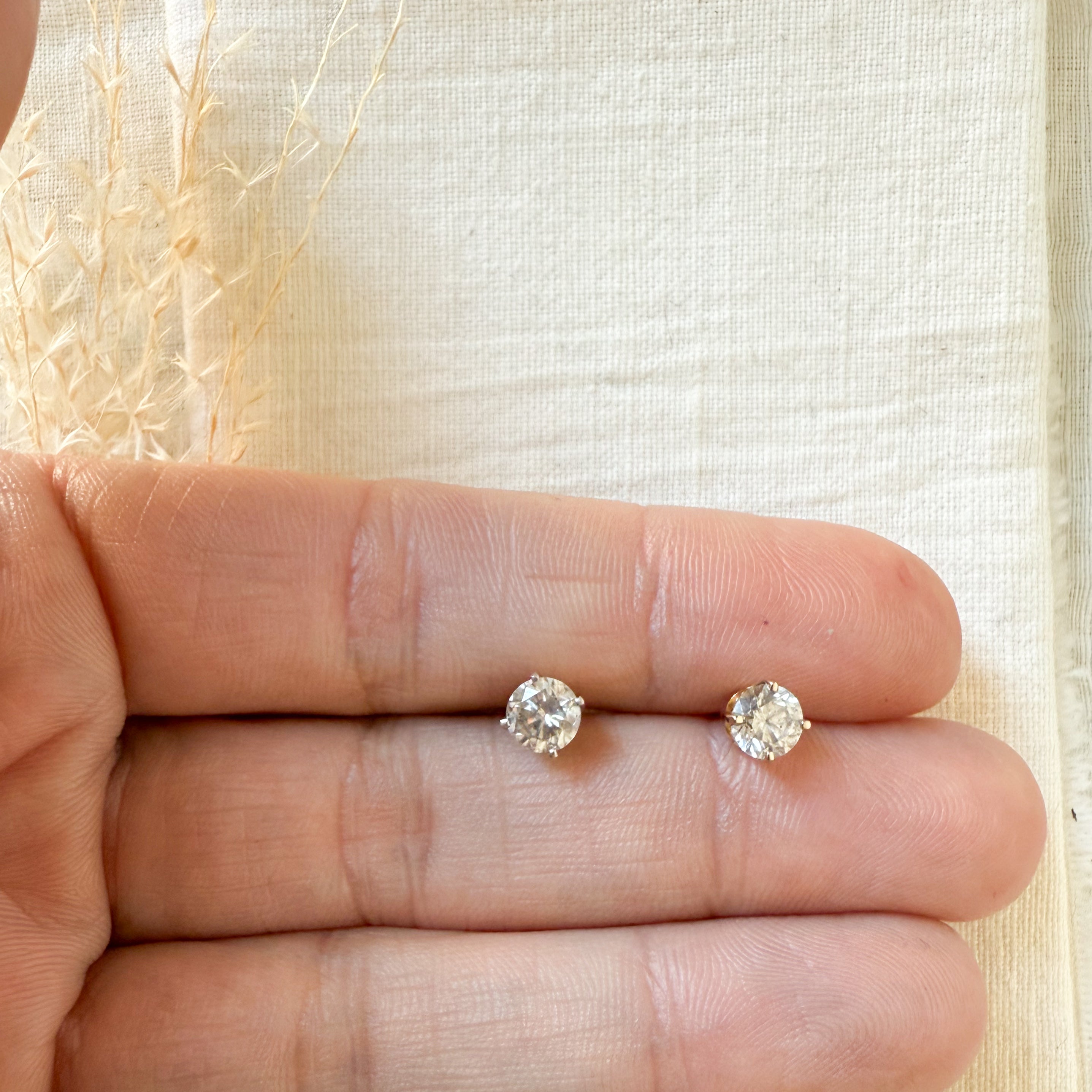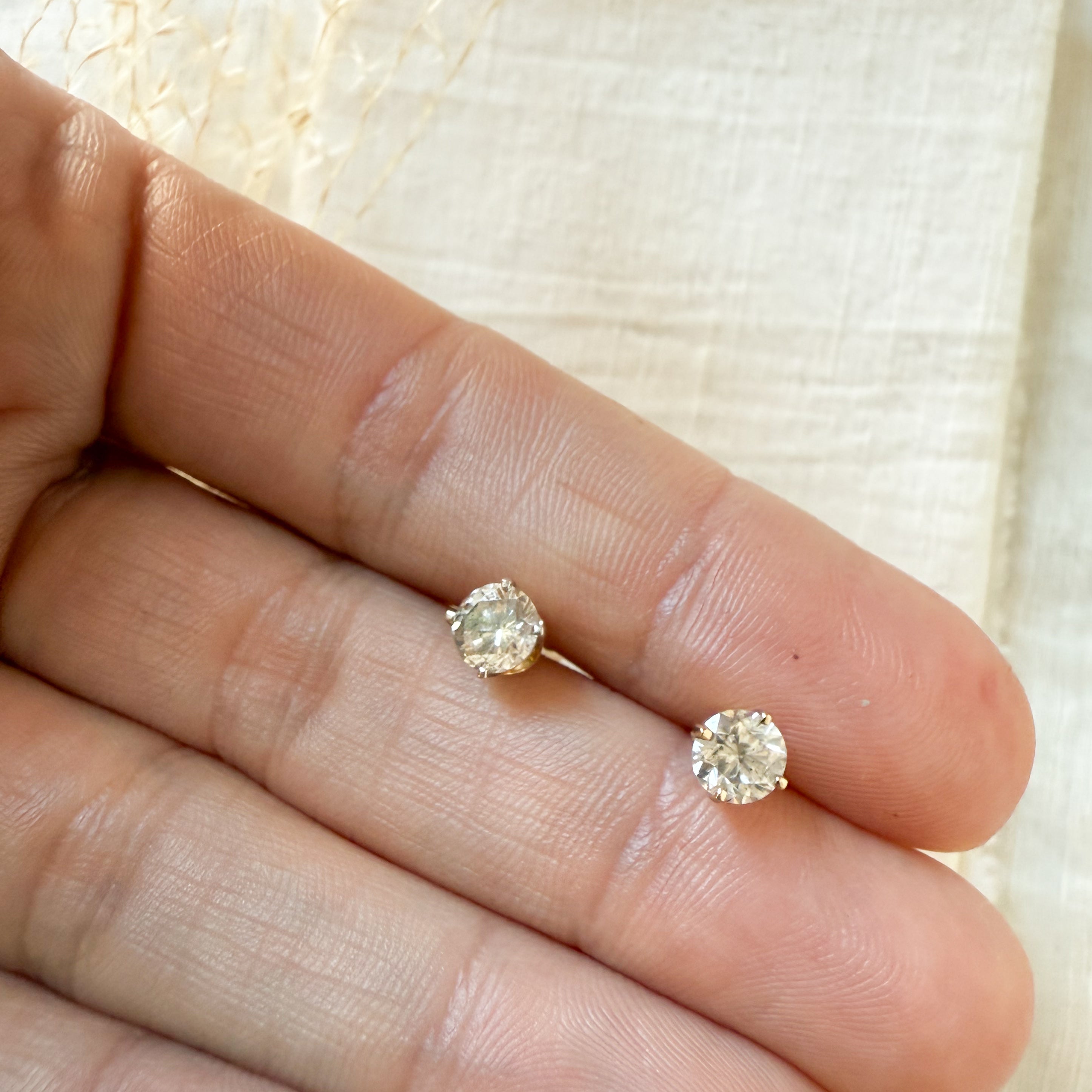 Each earring is four claw set with a round brilliant cut diamond 0.52 ct., 1.04 ct. total weight. The clarity/colour grade is I-1-2/J-K, with medium proportion and finish. Pierced friction backs weighing 1.1 grams.