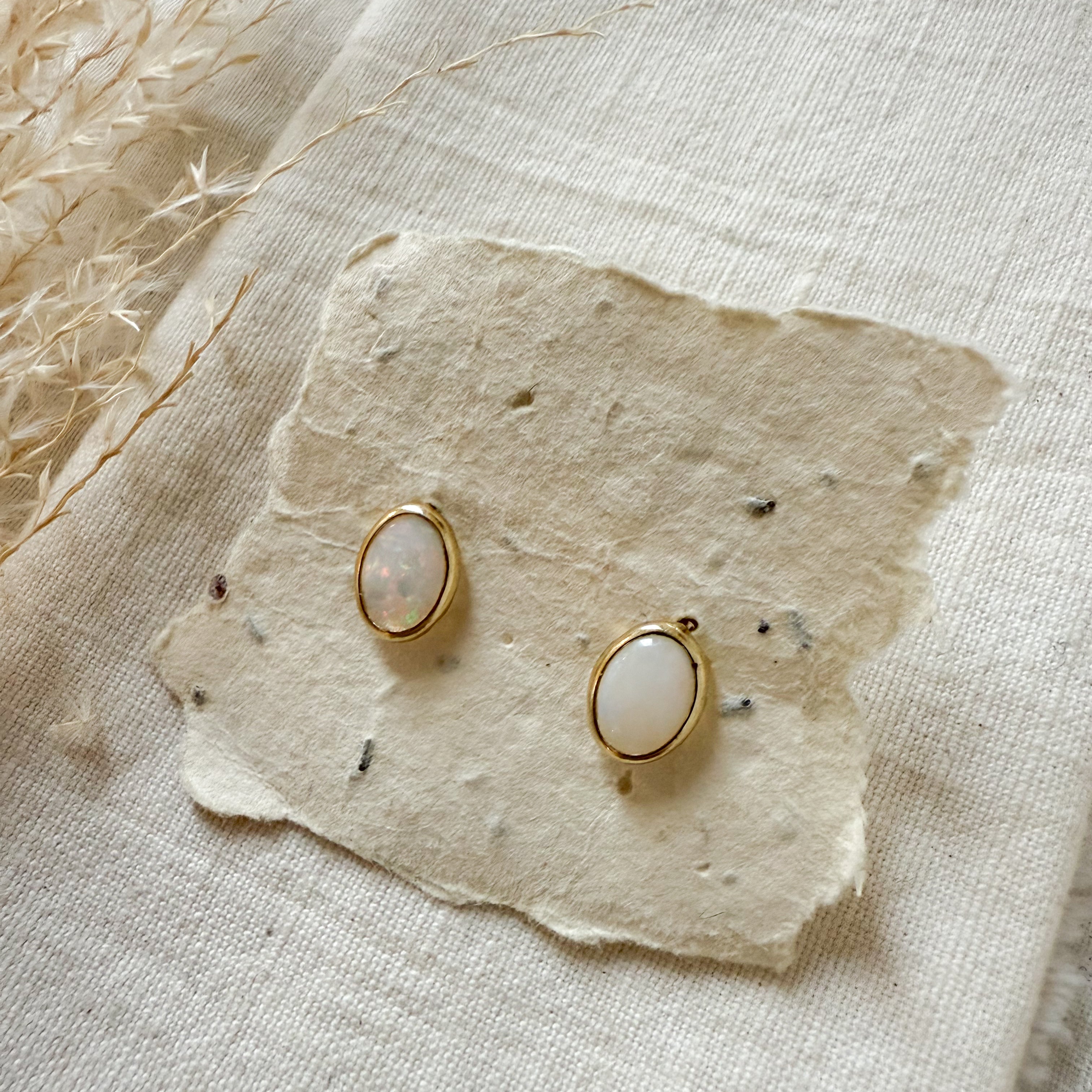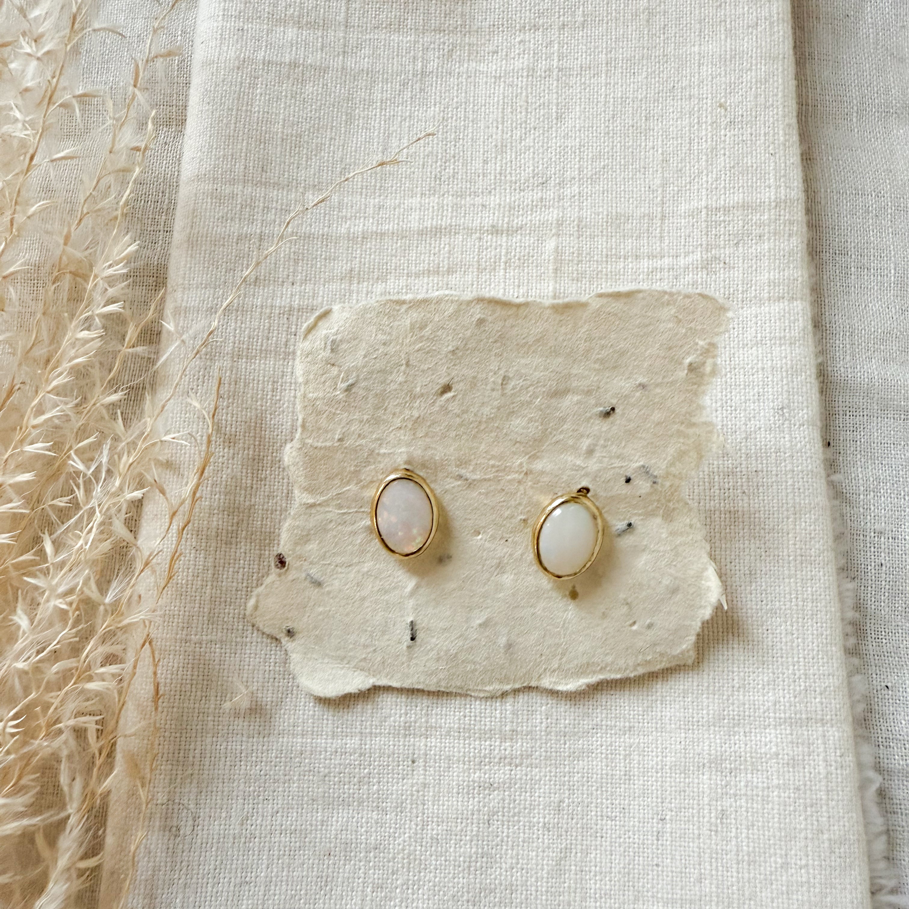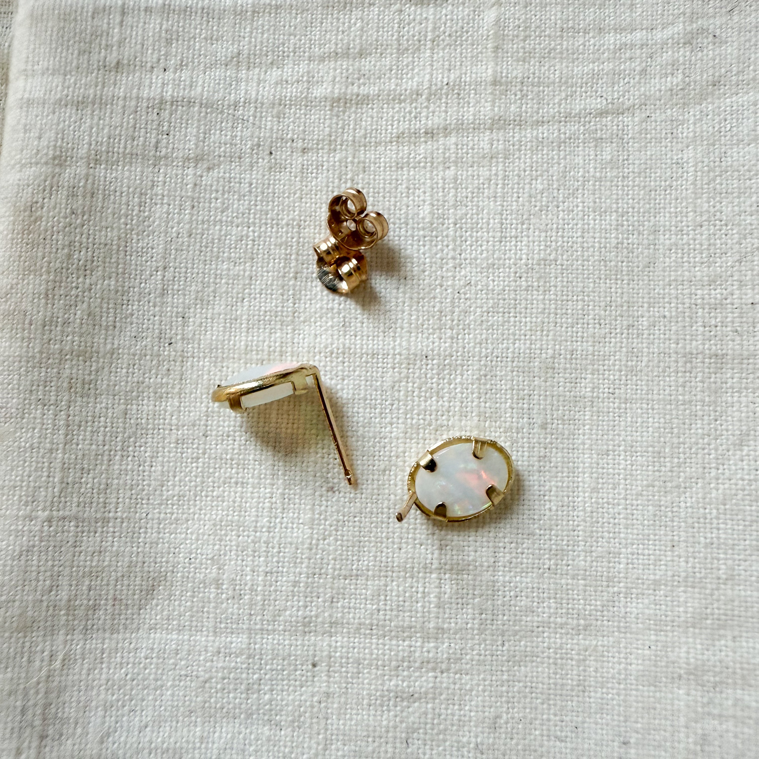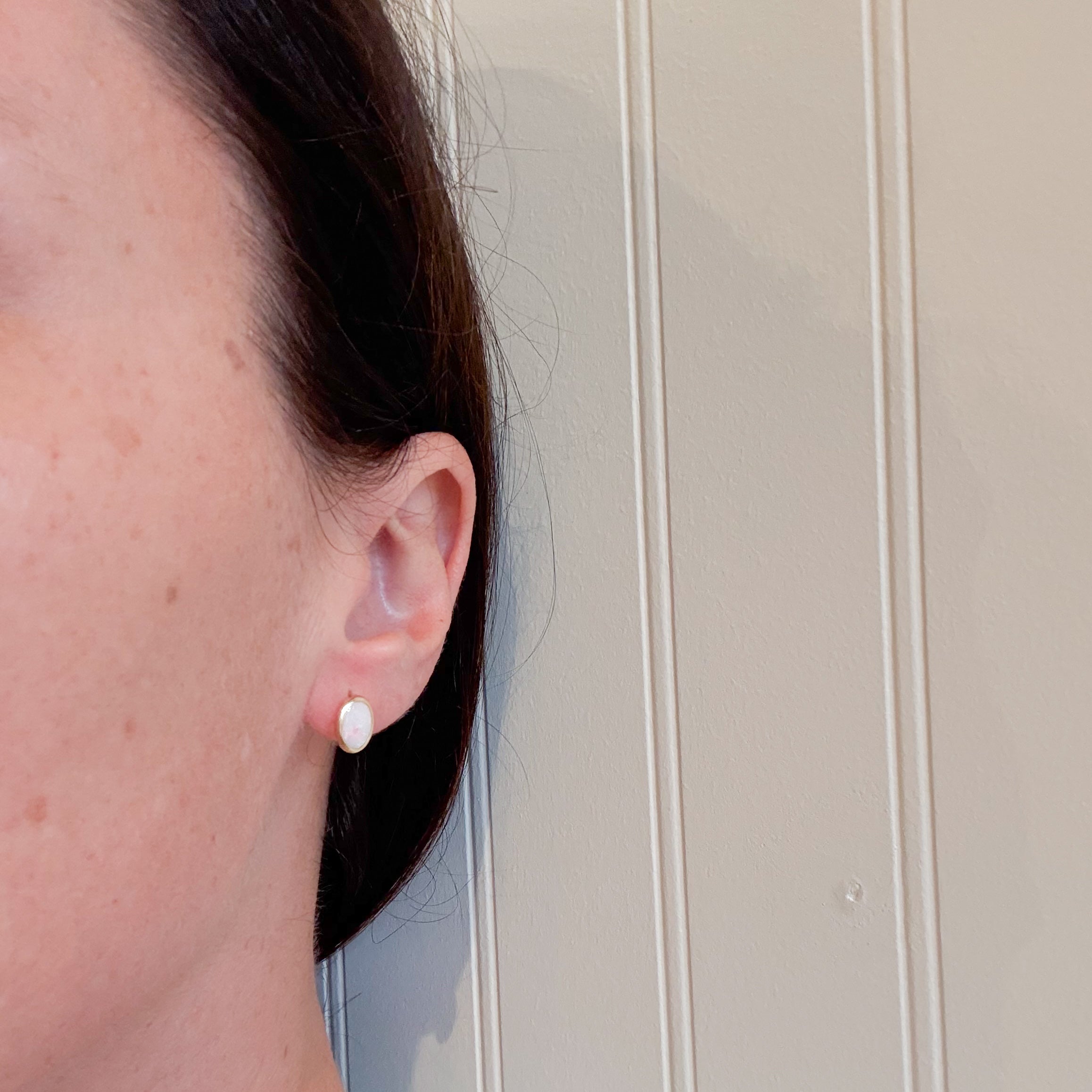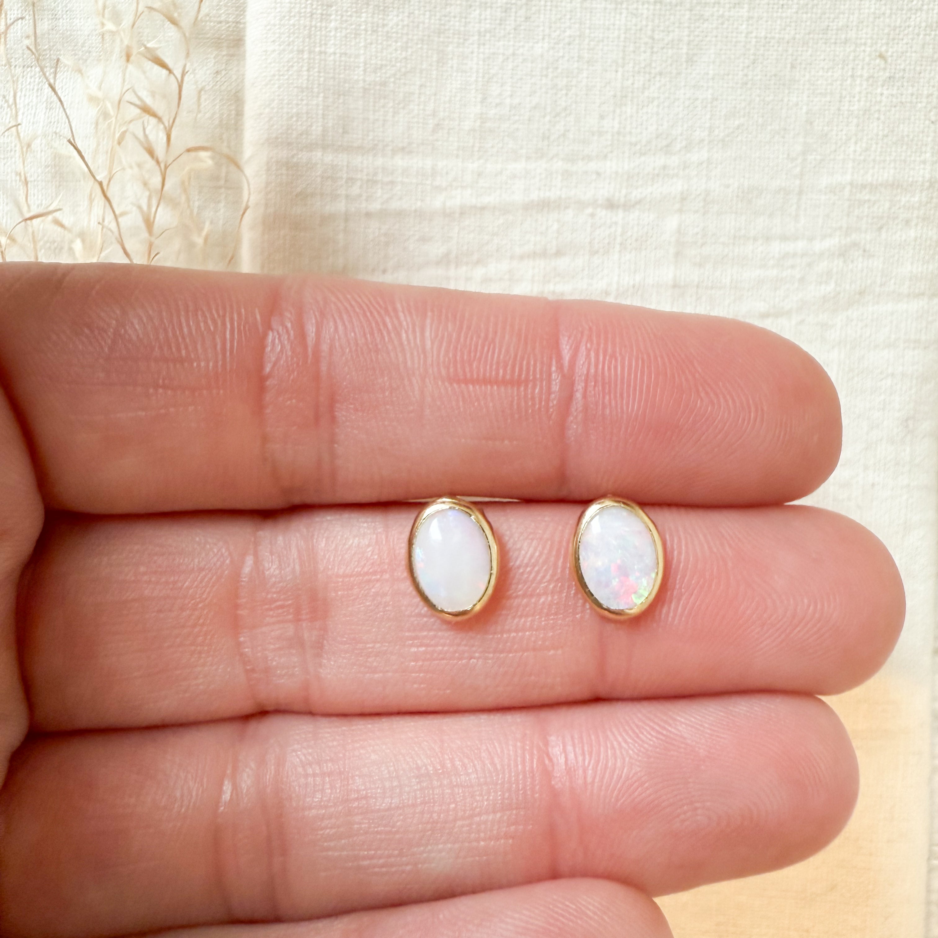 Each bezel back set with a 6 x 4 mm. white opal with good play of colour. The earrings measures .7 x 1 cm. weighing 1 grams. Pierced friction backs