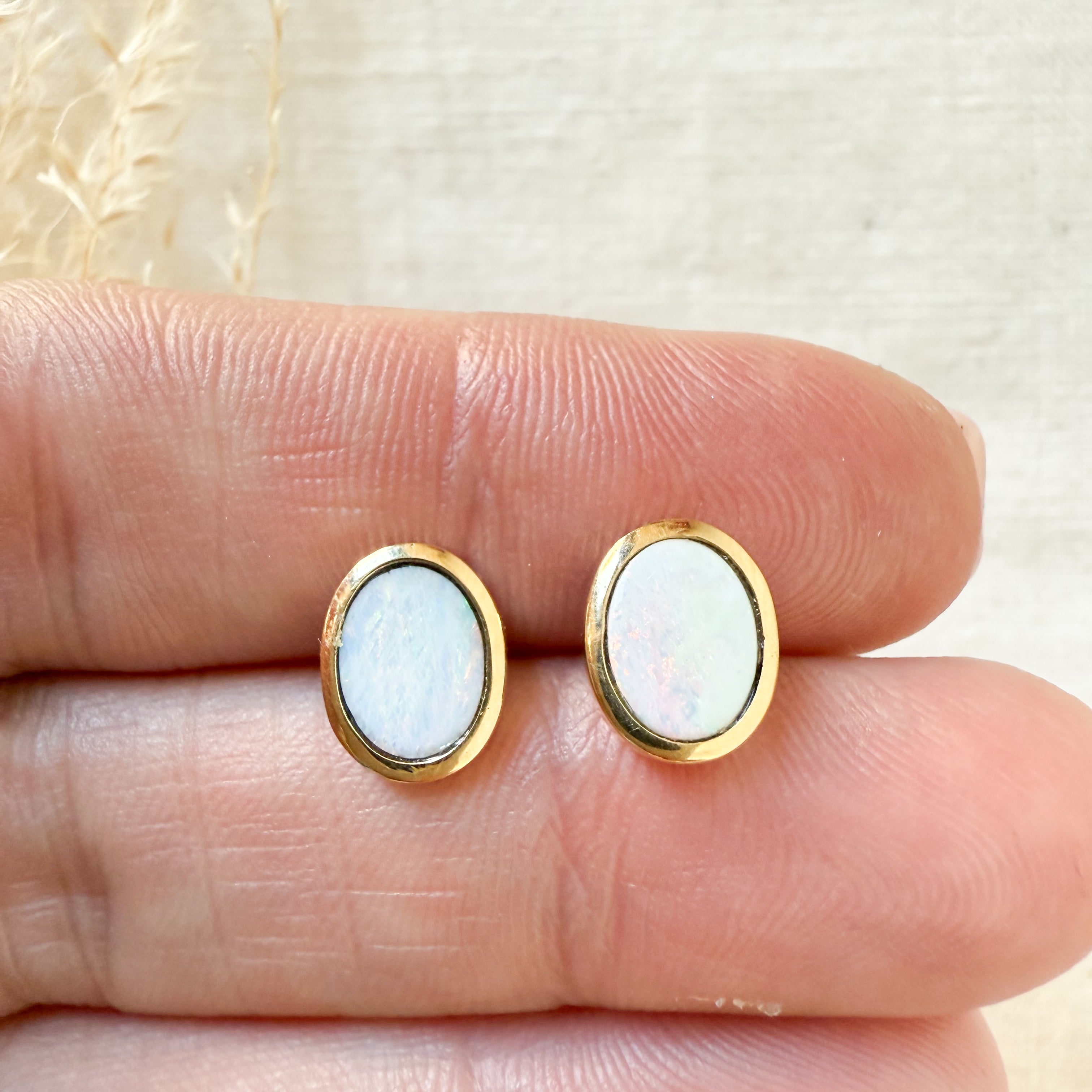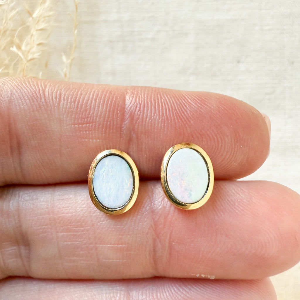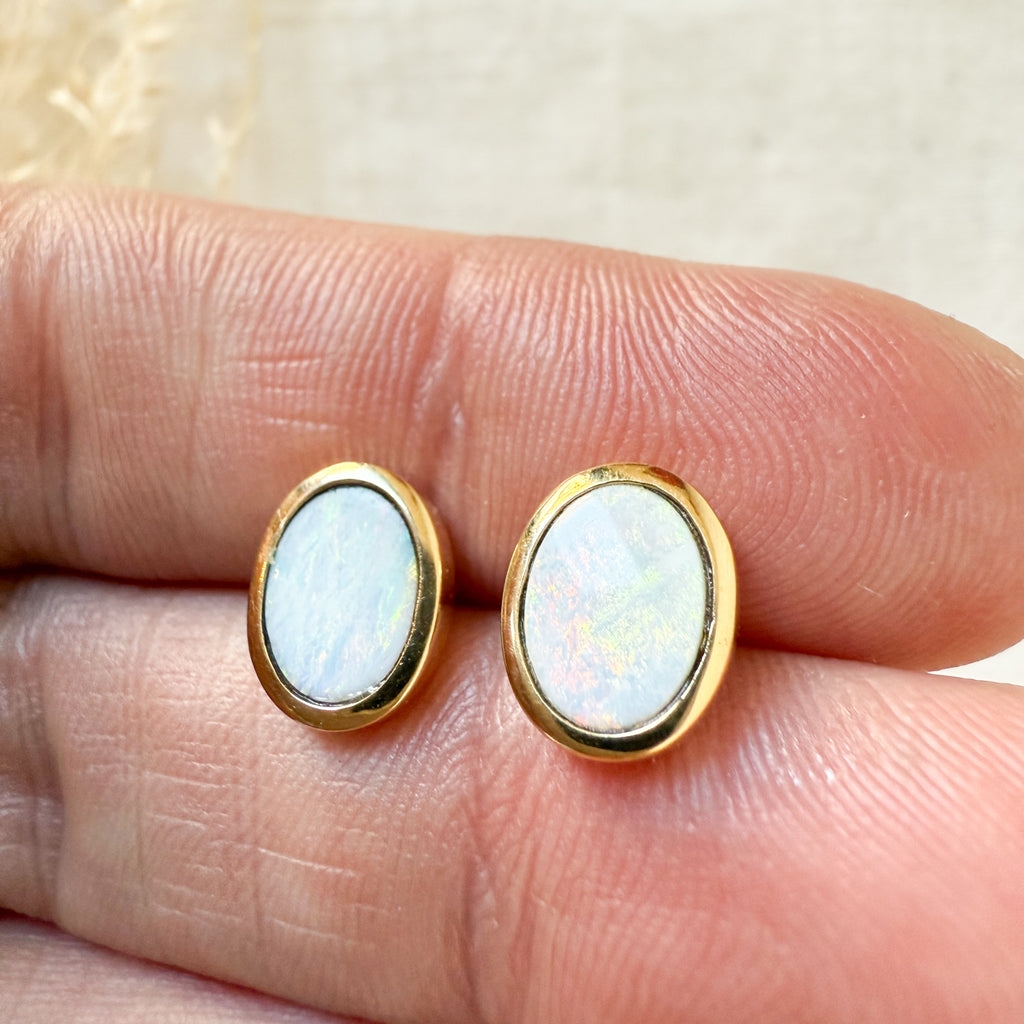 Each set with a oval cabochon white opal 7 x 9 mm. 3.00 cts total weight. Showing reds and greens. Pierced friction backs weighing 2 grams.