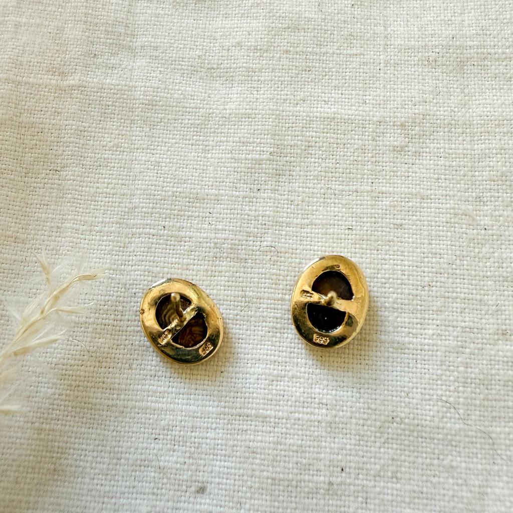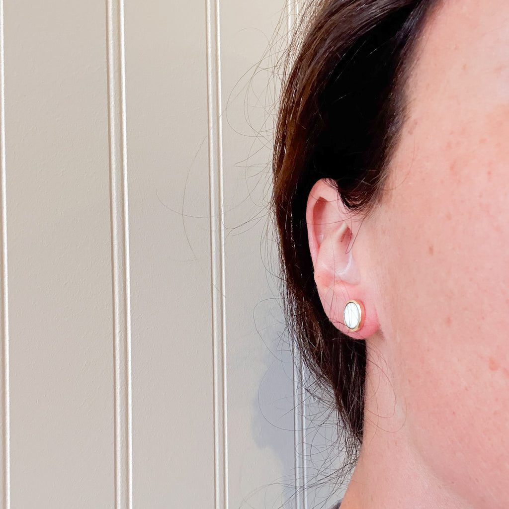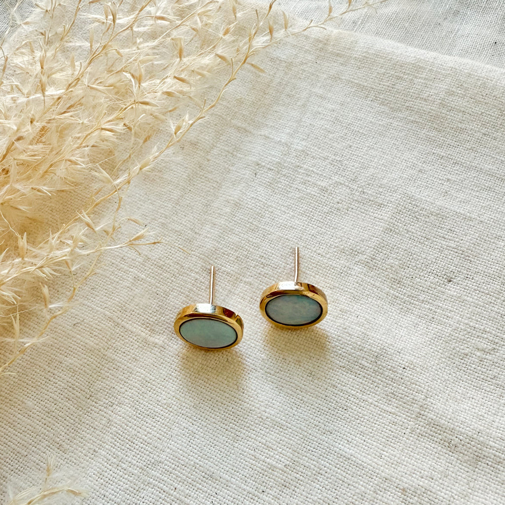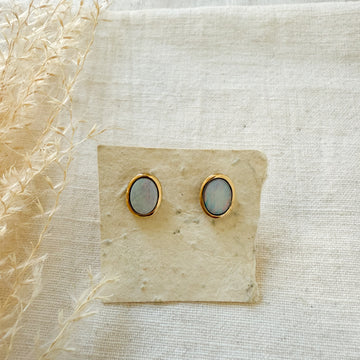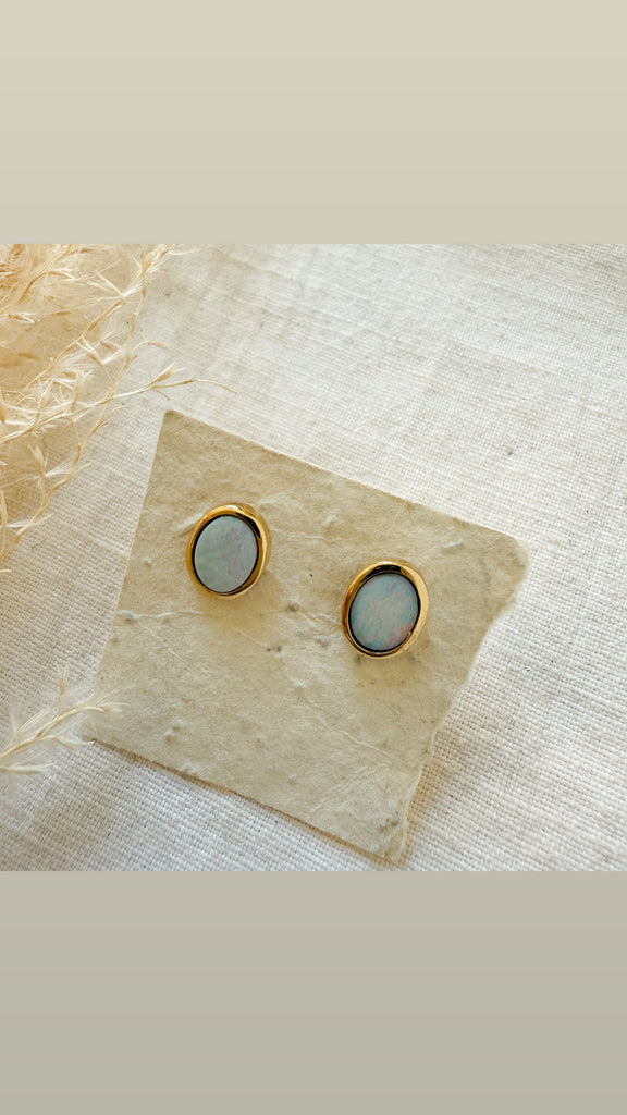 Each set with a oval cabochon white opal 7 x 9 mm. 3.00 cts total weight. Showing reds and greens. Pierced friction backs weighing 2 grams.