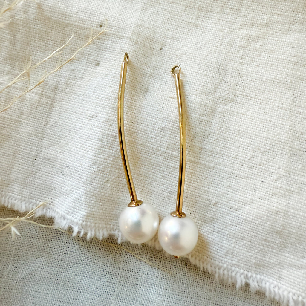 Gold stud tops with freshwater pearl drop enhancers. with 7.5-8 mm. white freshwater pearls. Pierced yellow gold domed tops .5 cm. with a curved tube drop 4 cm long weighing 2.9 grams.