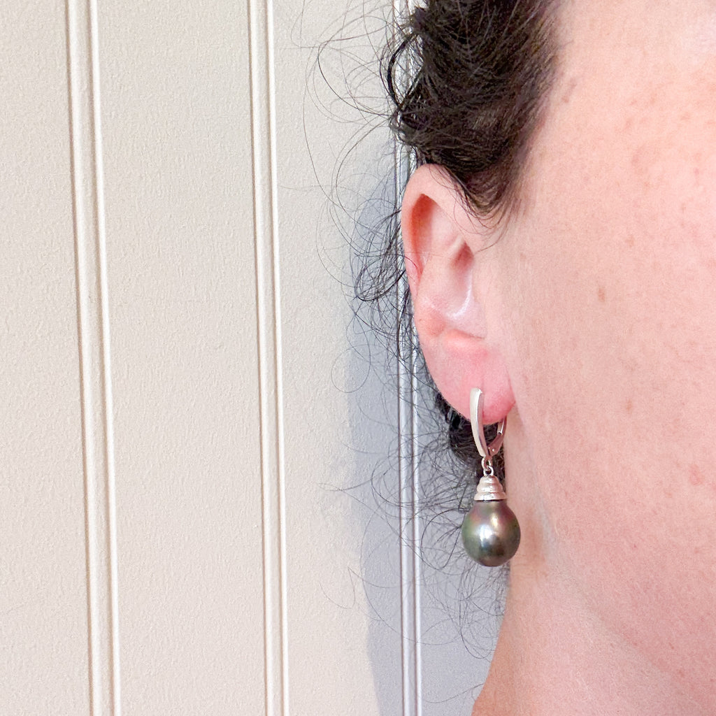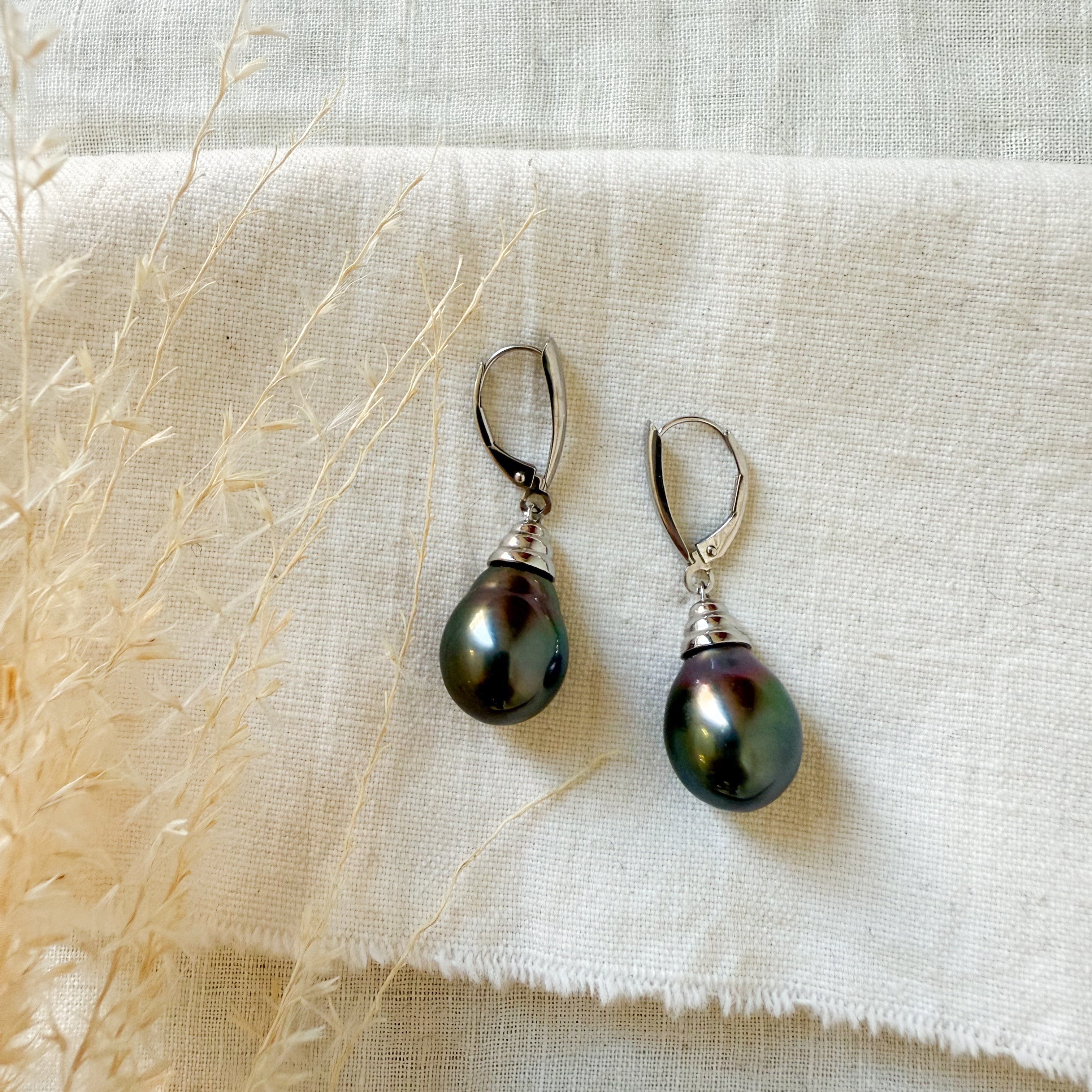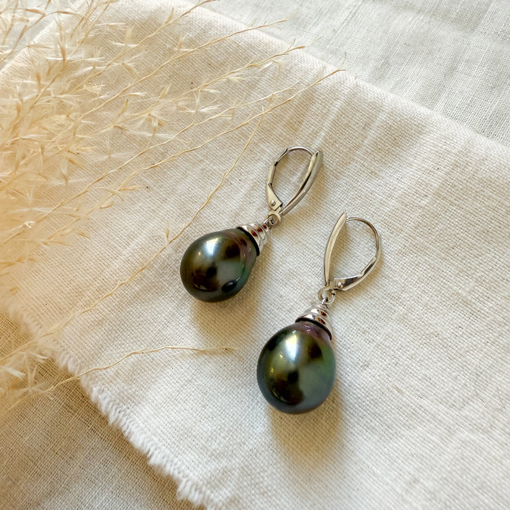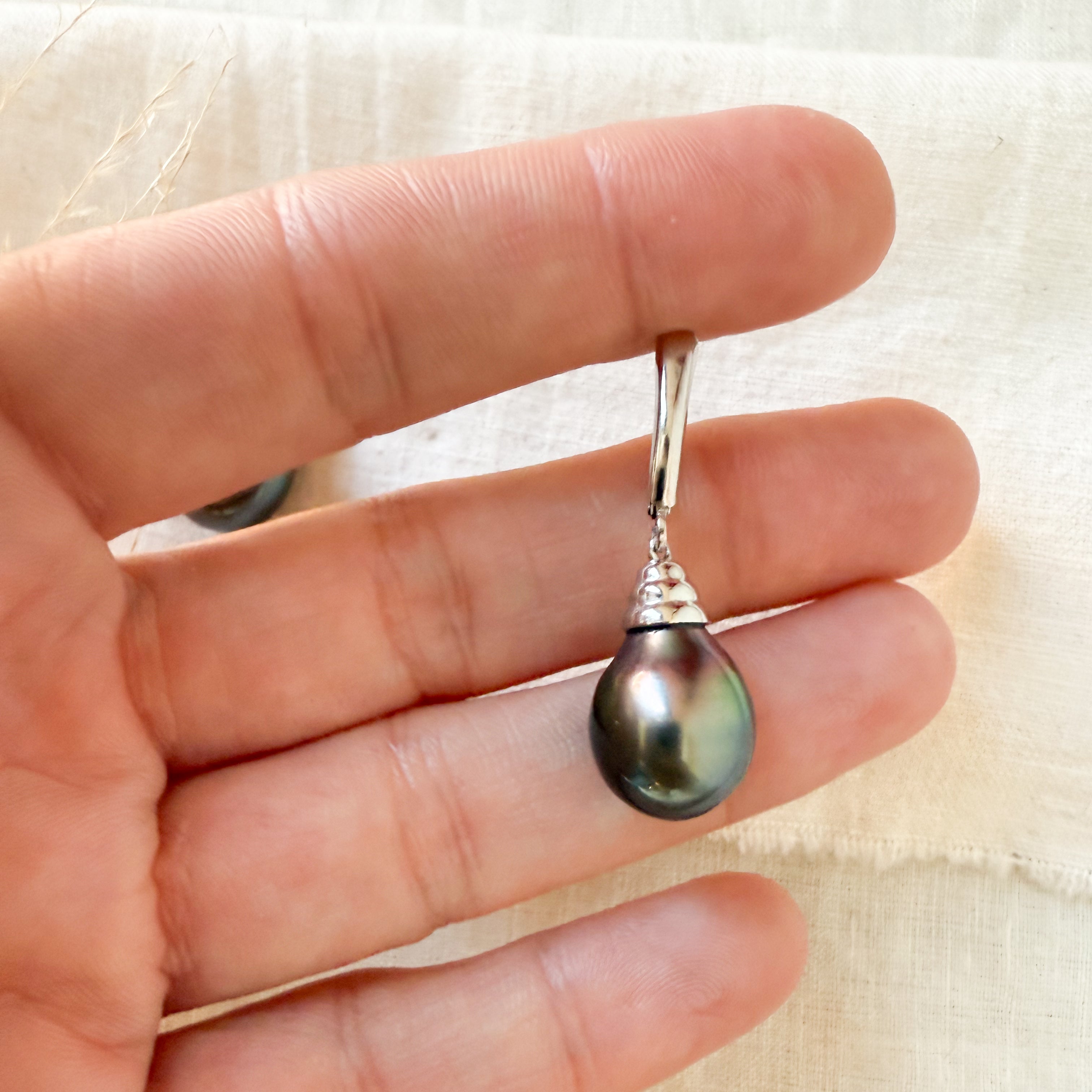 Each earring has a black tahitian tear drop pearl measuring 18 x 10 mm. black tahitian pearl. drop 4 cm. long, 1 cm wide weighing 7.1 grams. Pierced hinged backs