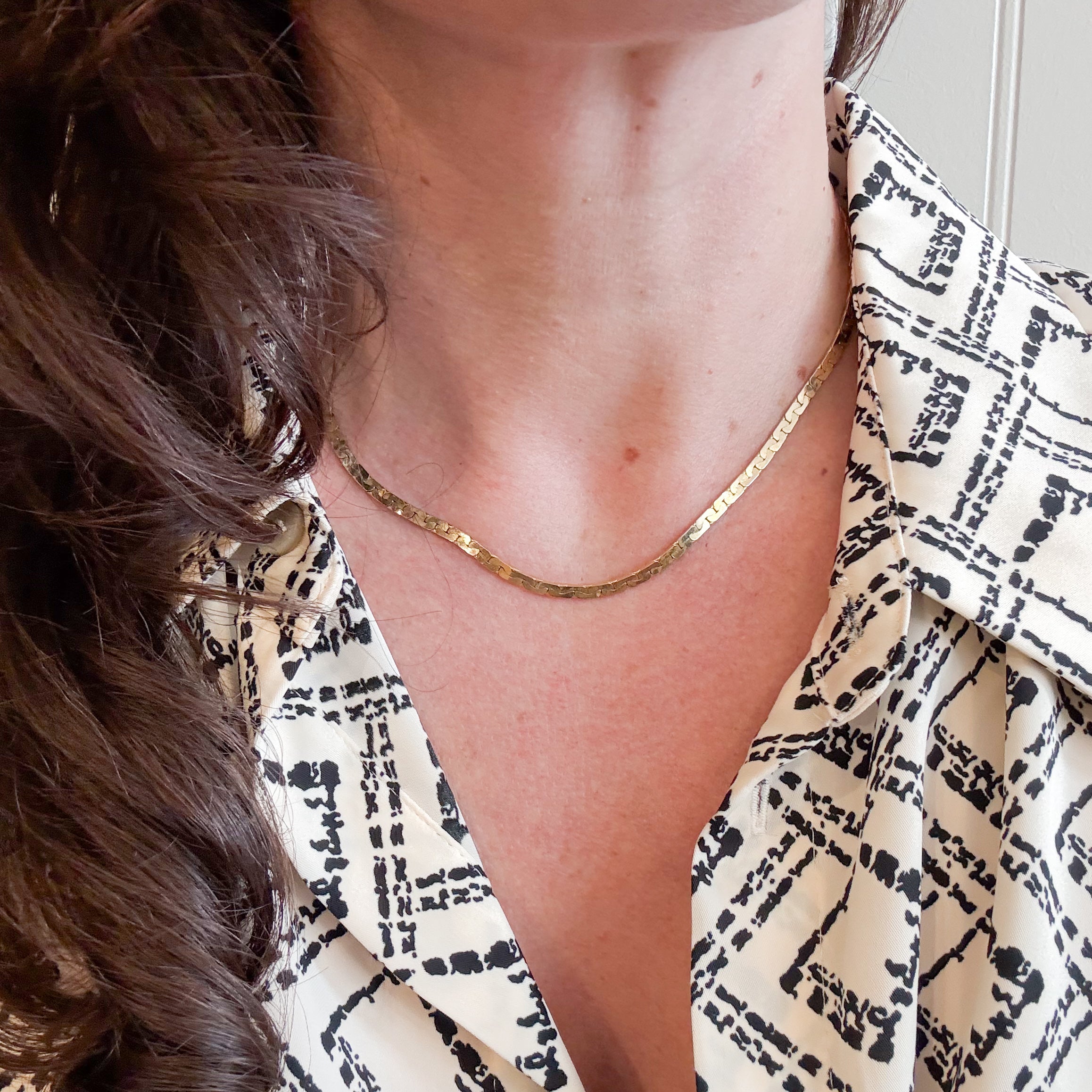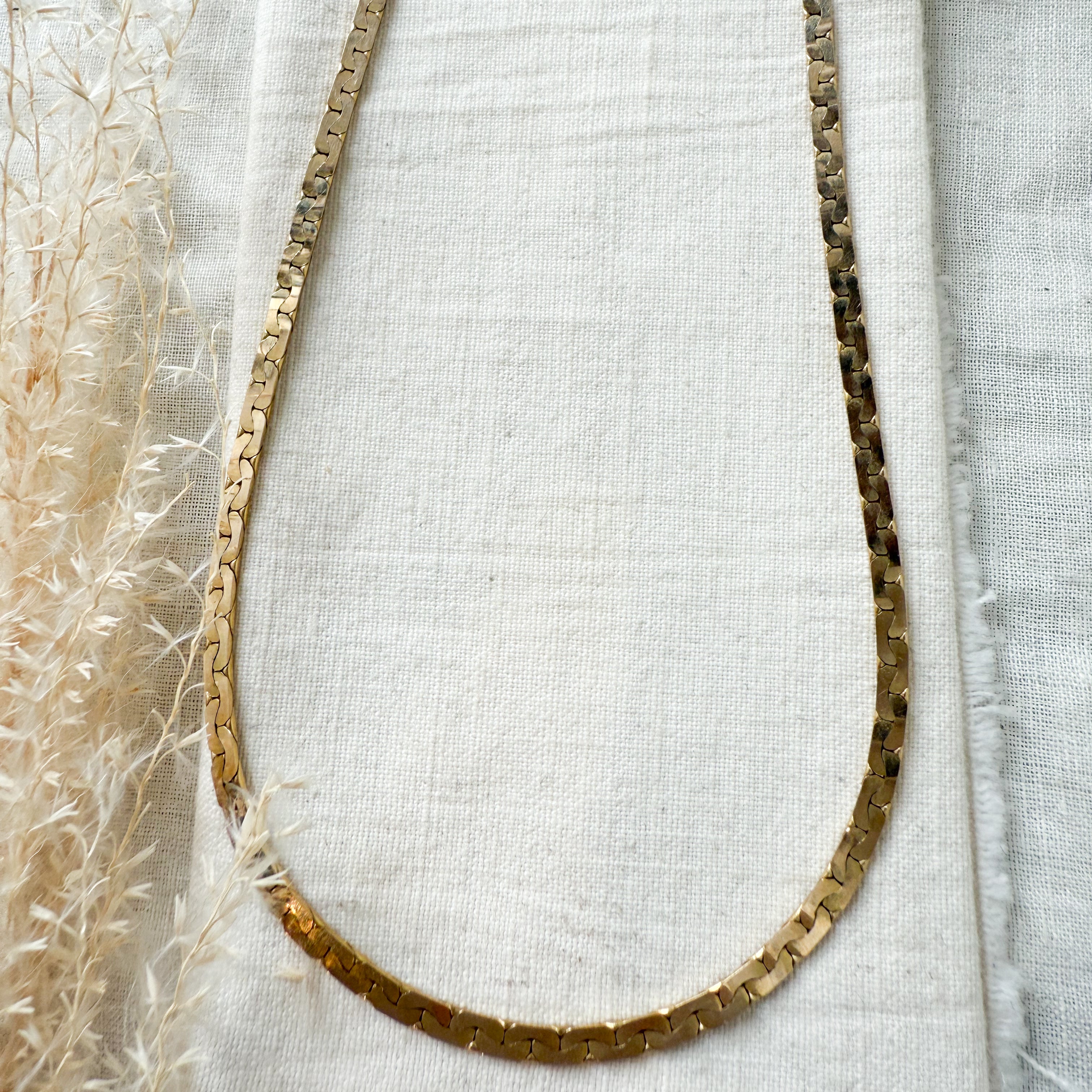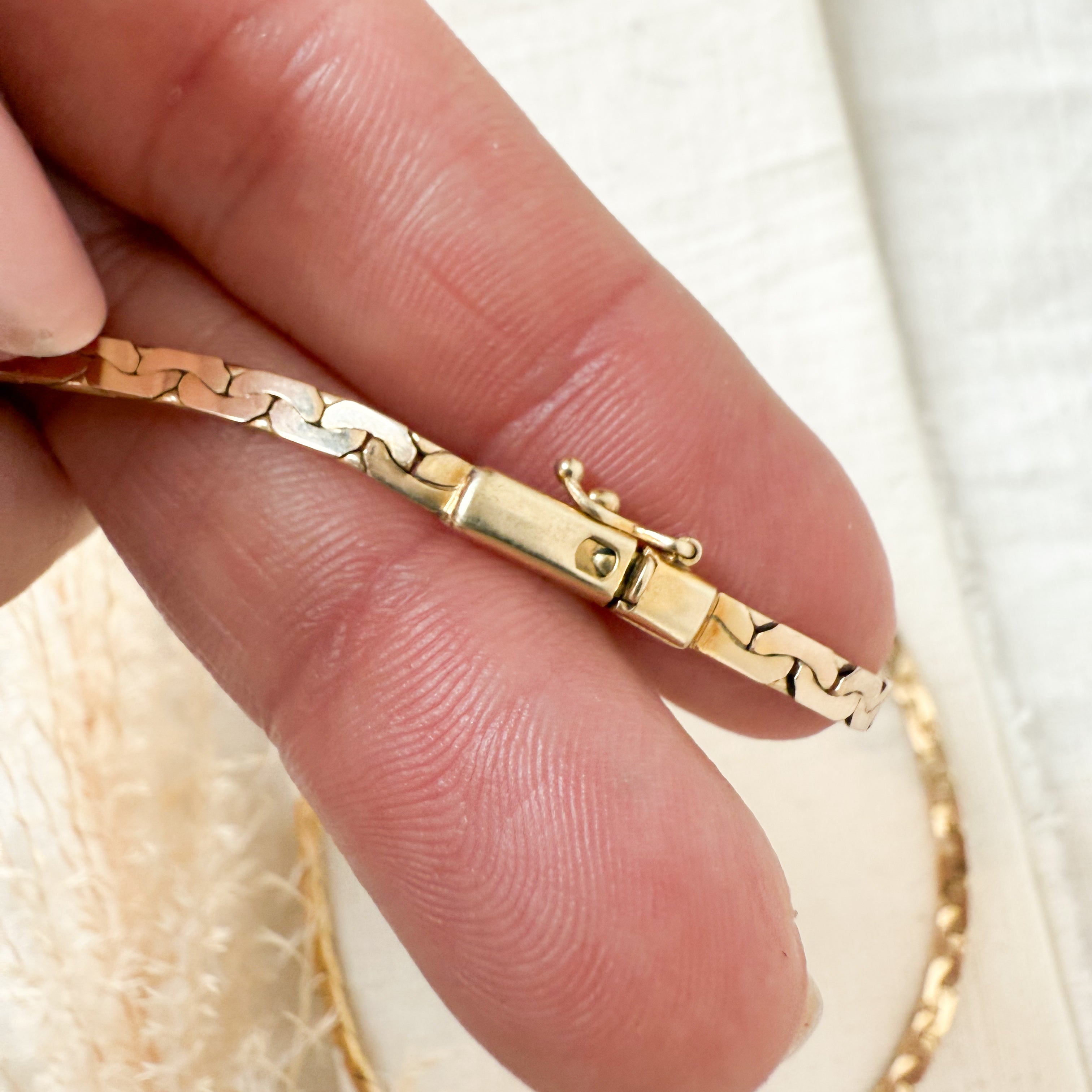 The chain measures 3 mm. wide, 15 inches in length weighing 11.3 grams. Finished with a box clasp and figure 8 safety