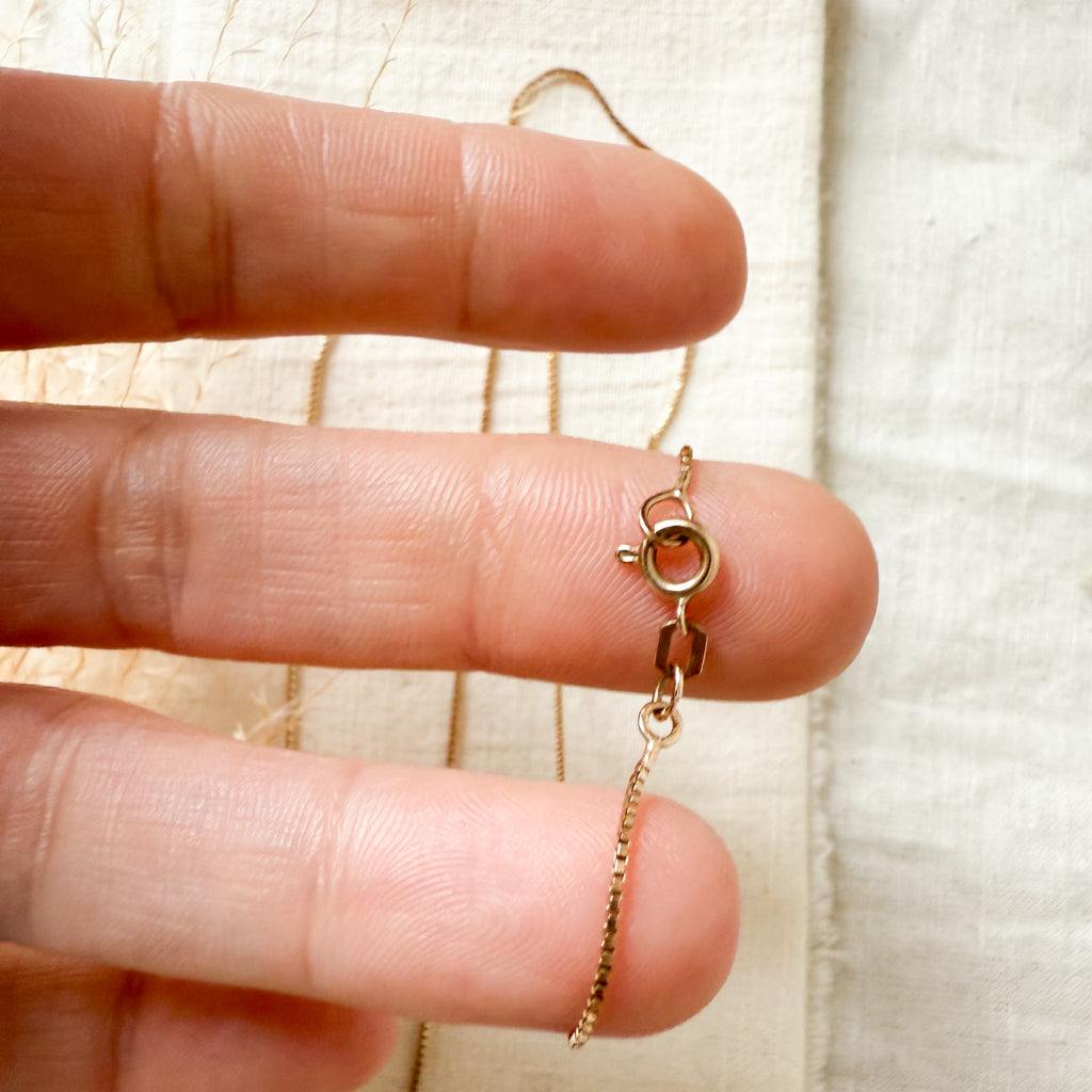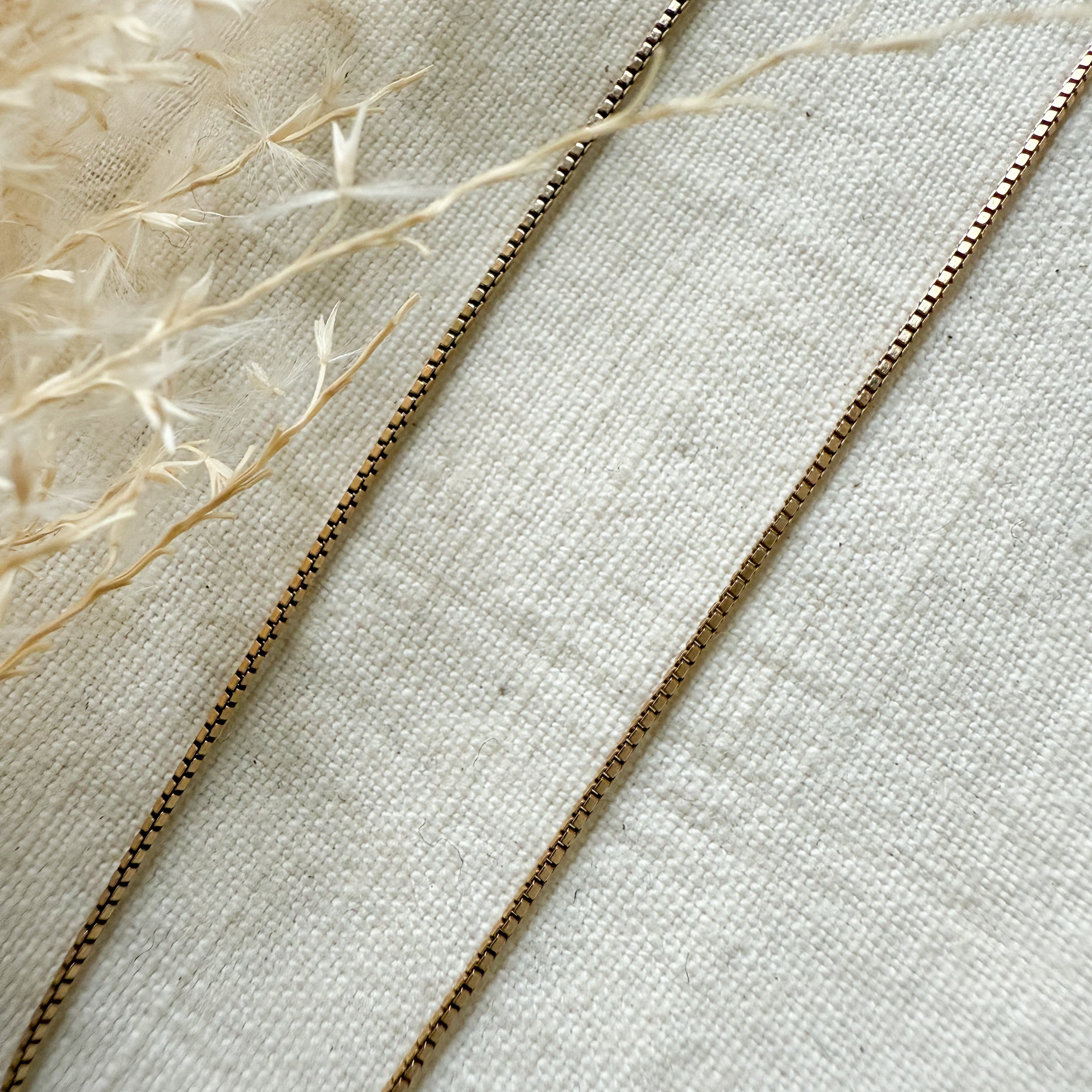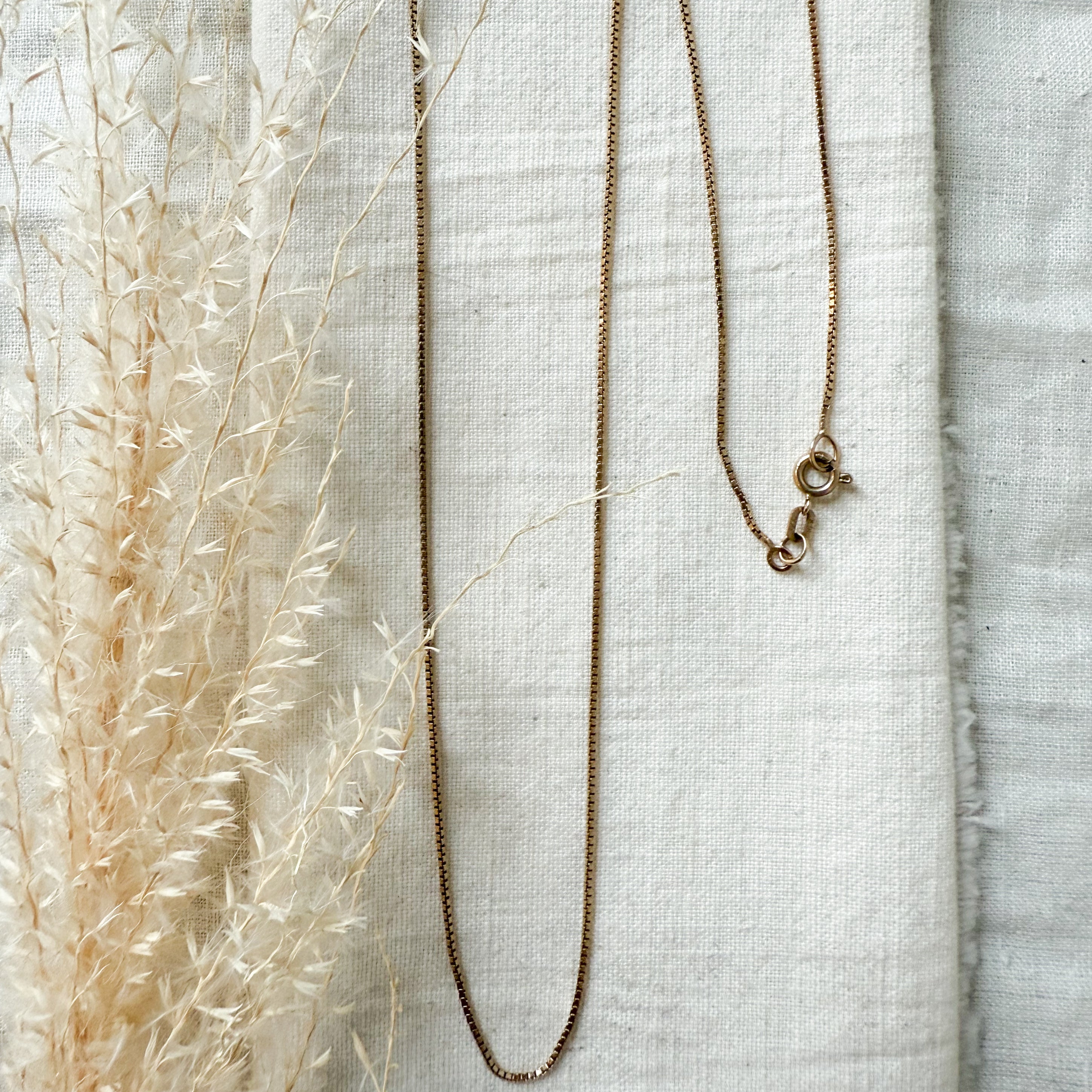 The chain measures 1 mm. wide, 20 inches in length weighing 2.7 grams. Finished with a spring ring clasp.