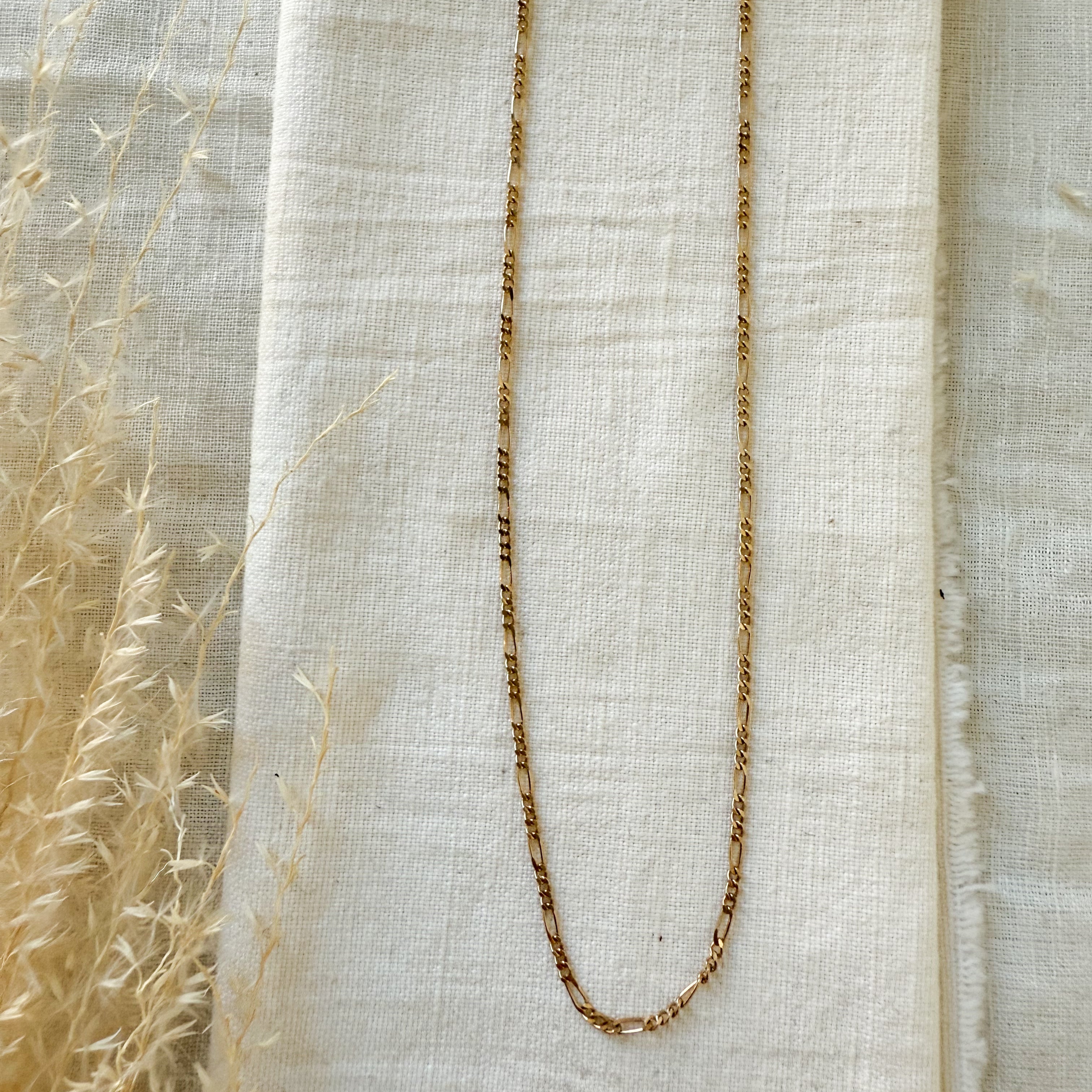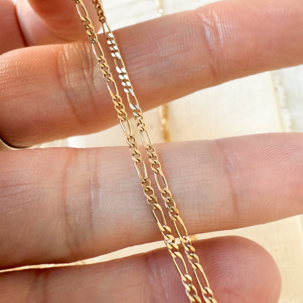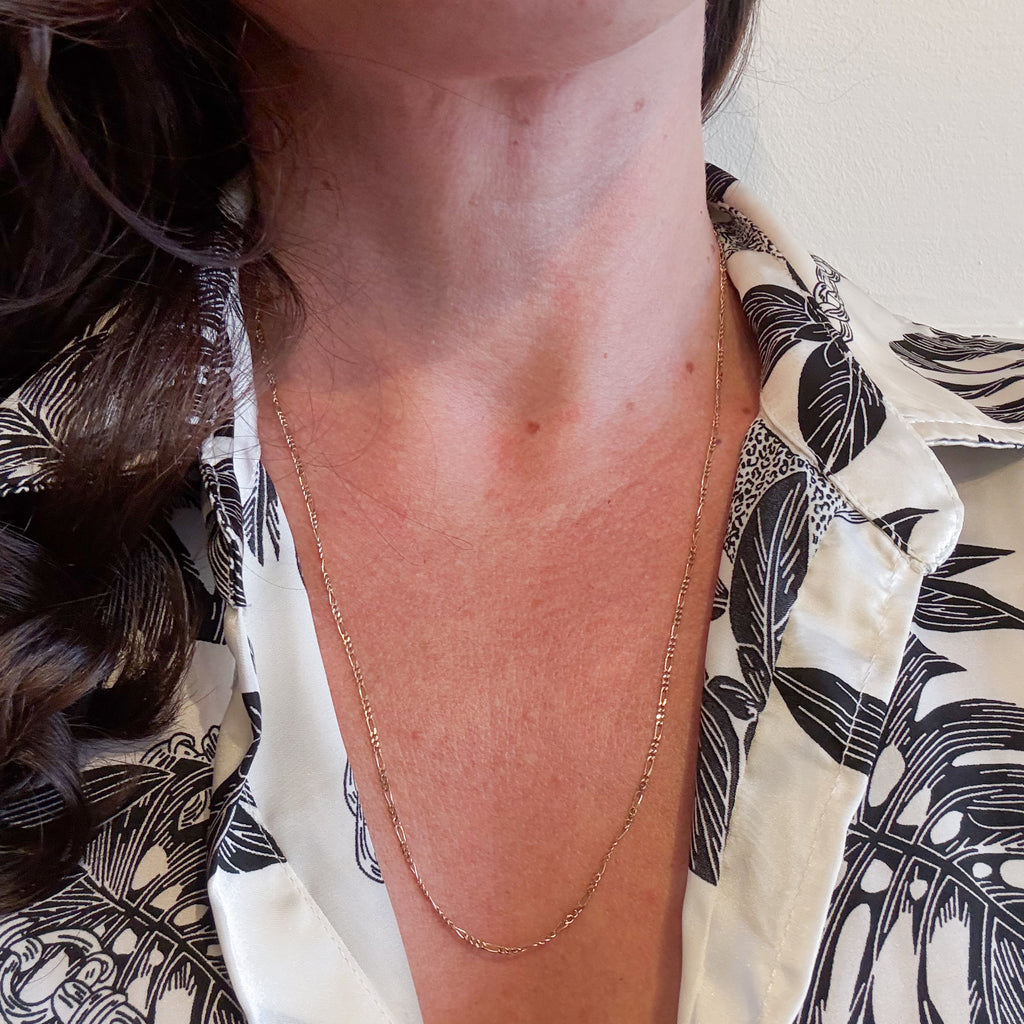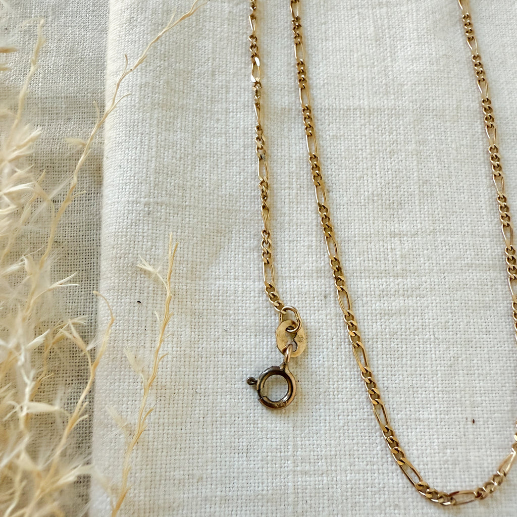 The chain measures 2 mm. wide, 21 inches in length weighing 2.8 grams. Finished with a spring ring clasp.
