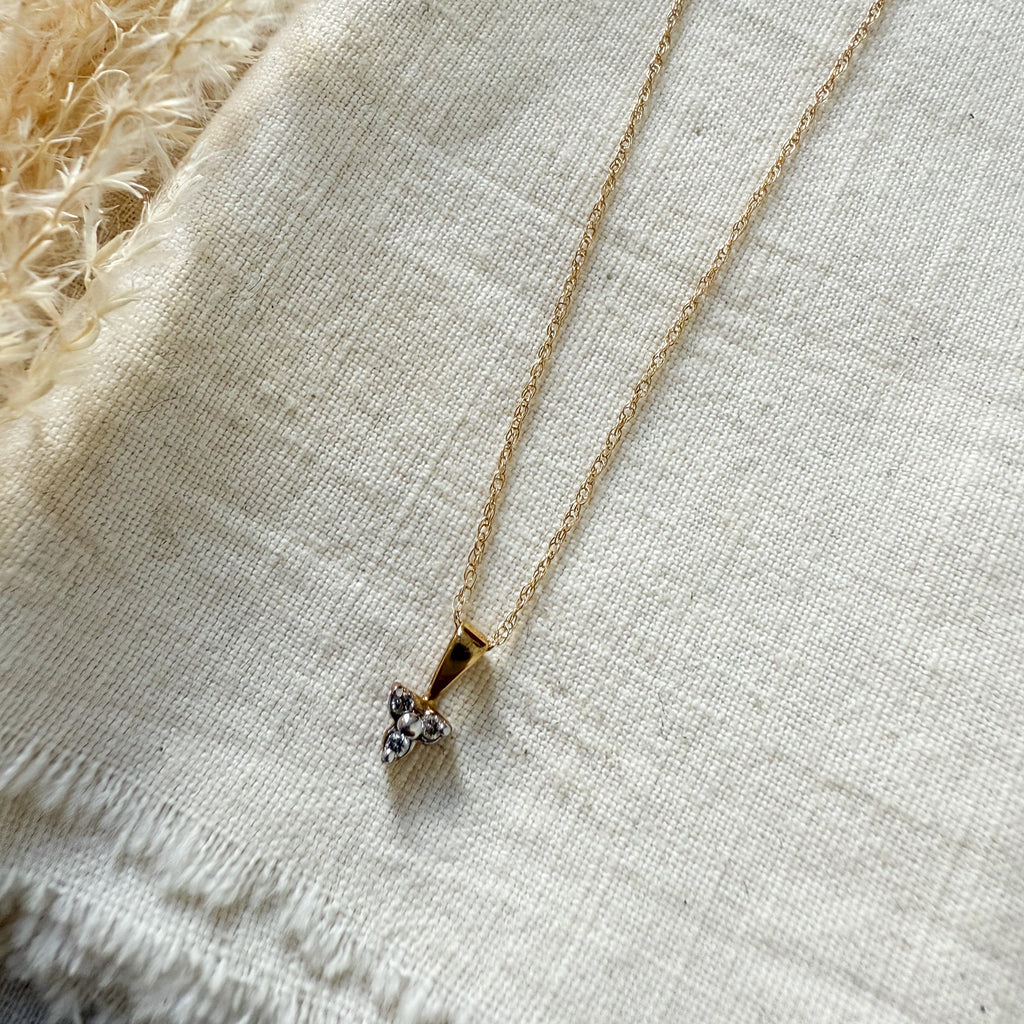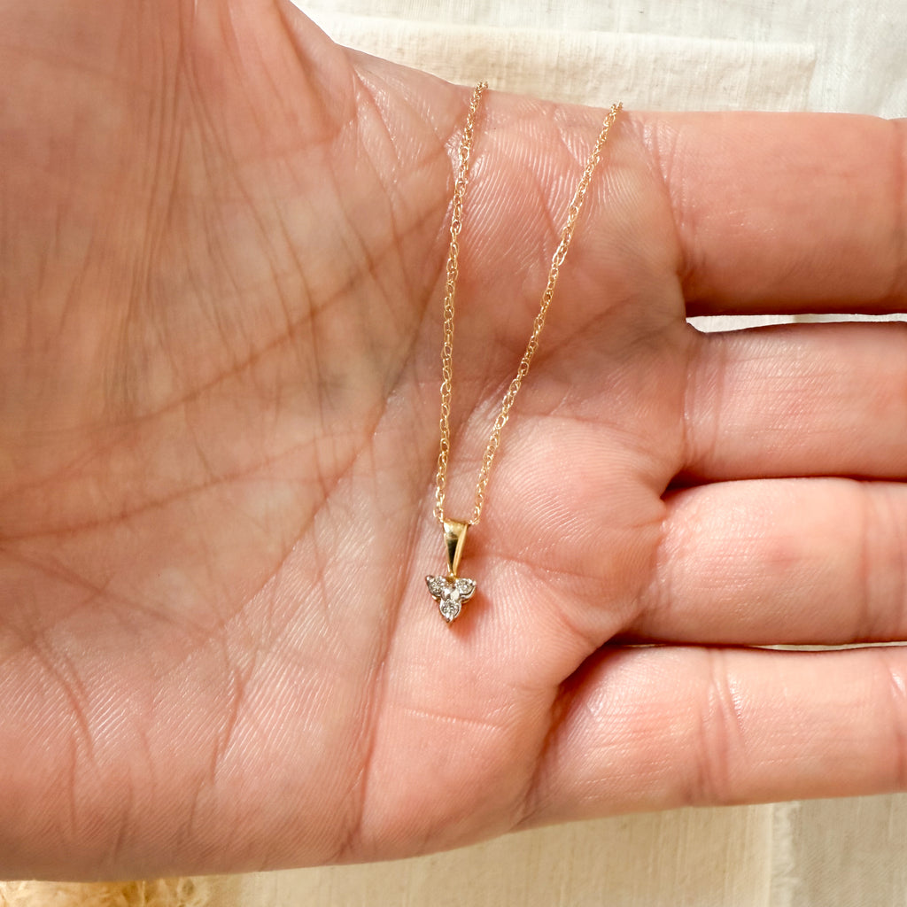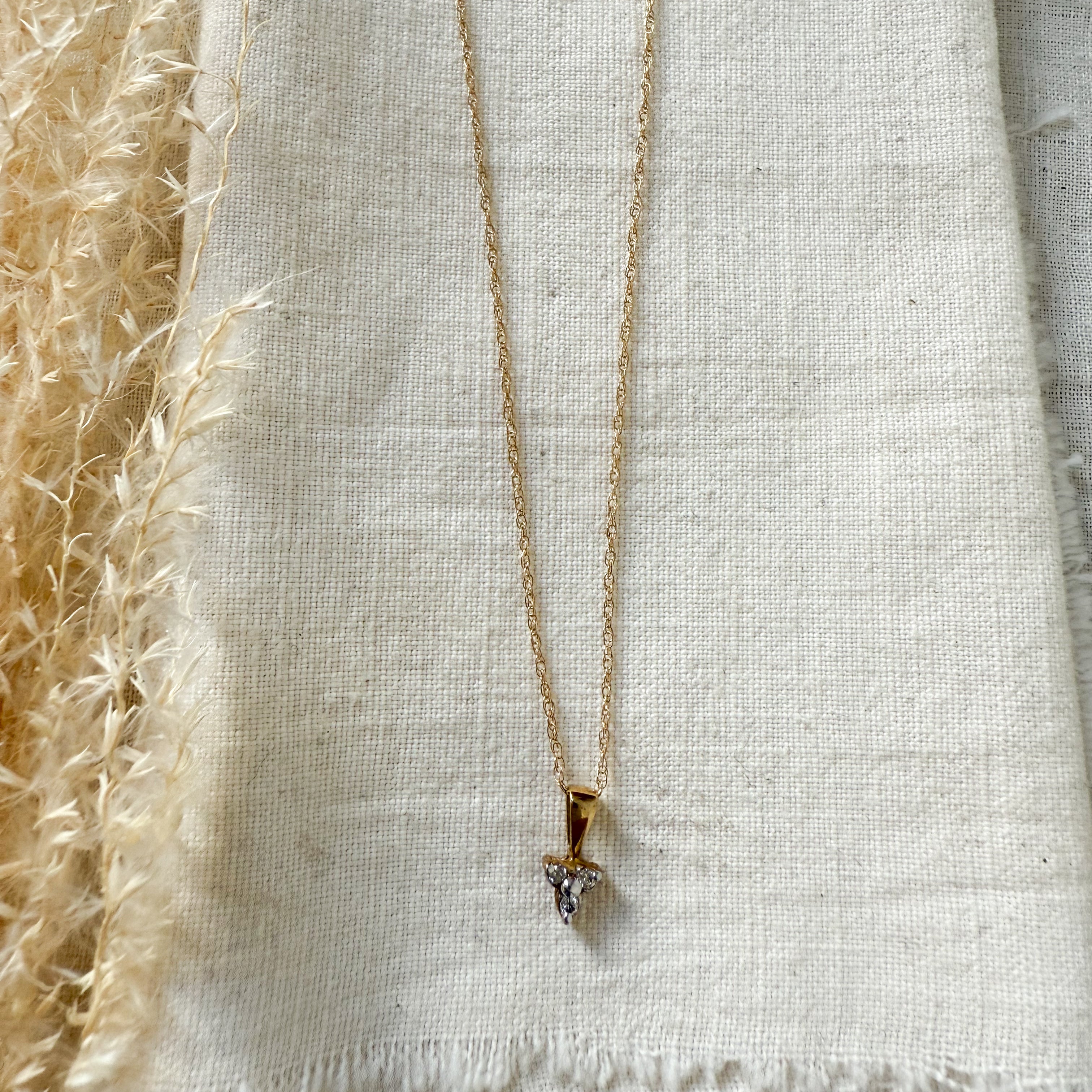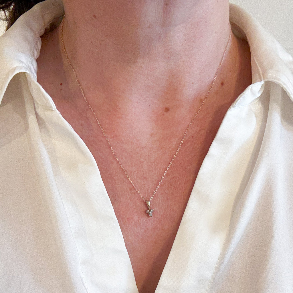 Set with 3 full cut diamonds measuring .01ct total diamond weight. Pendant measures 10mm length, and 5mm width. Weighing 0.4grams.