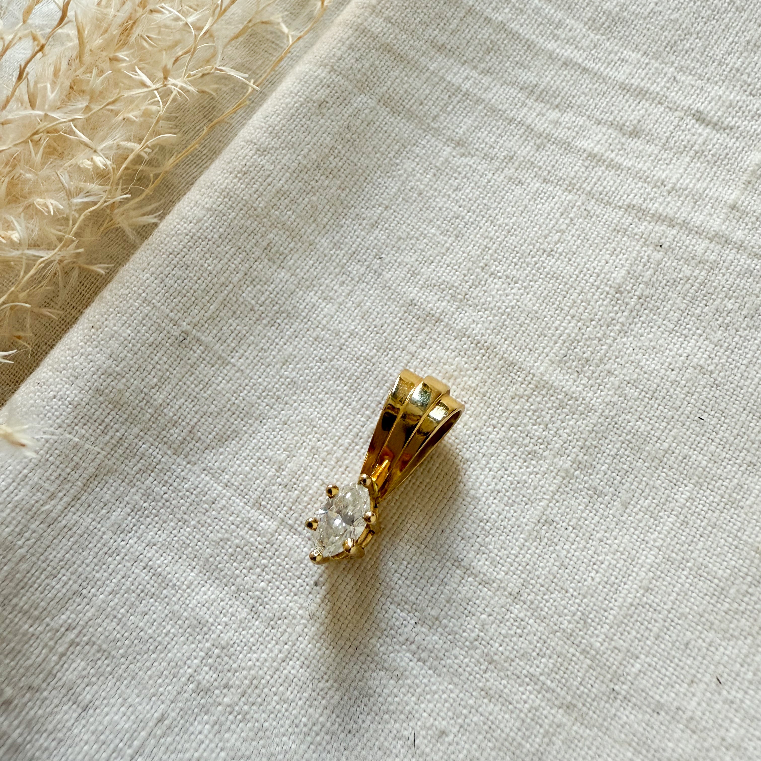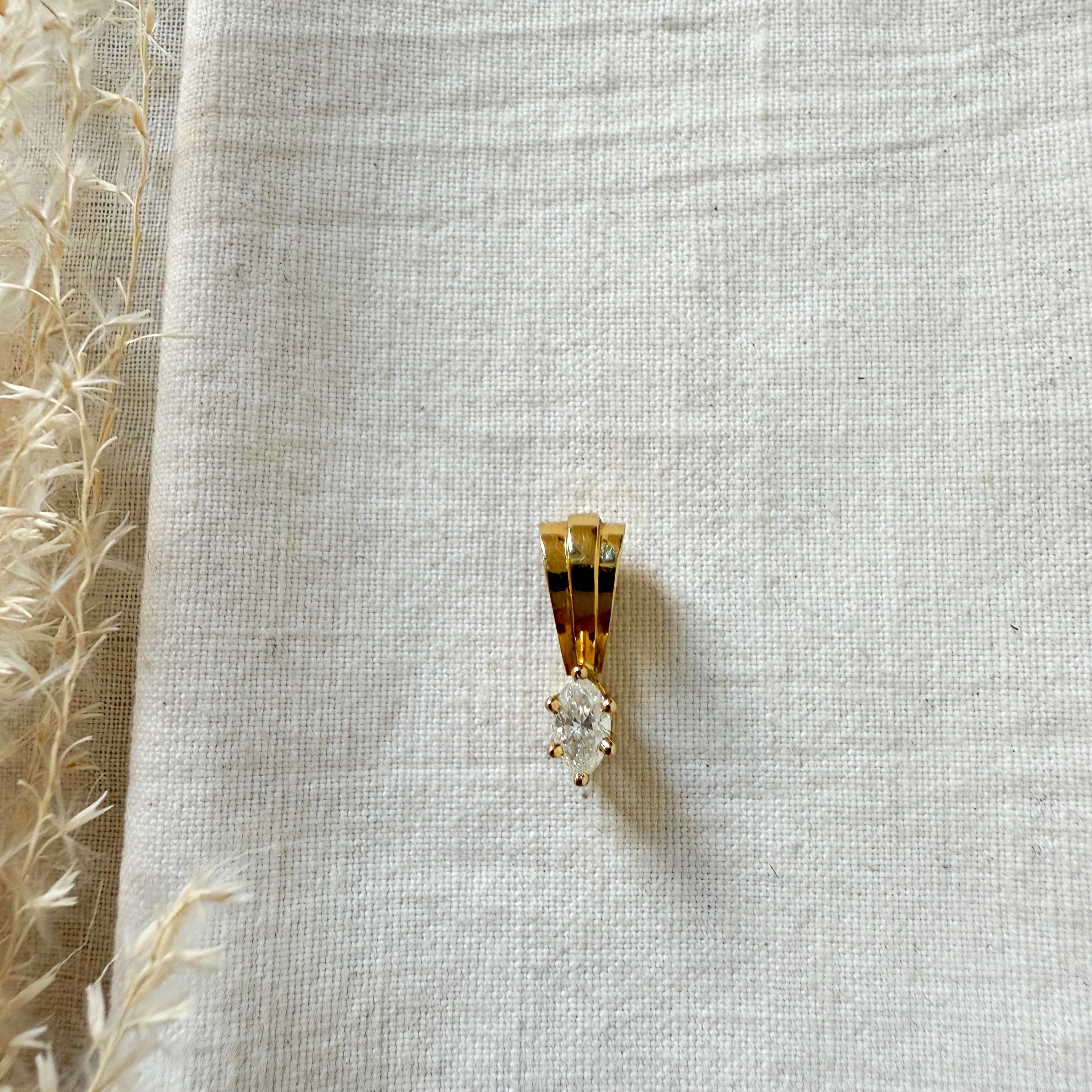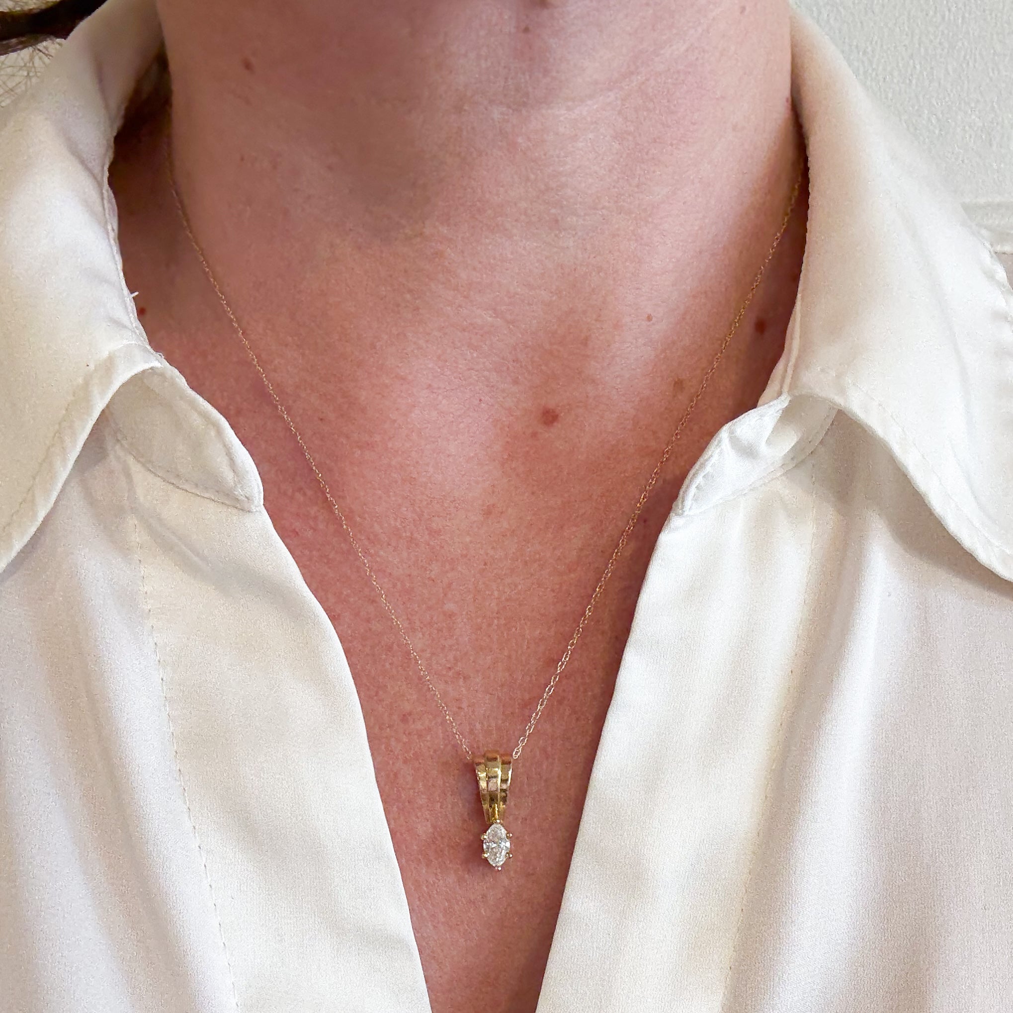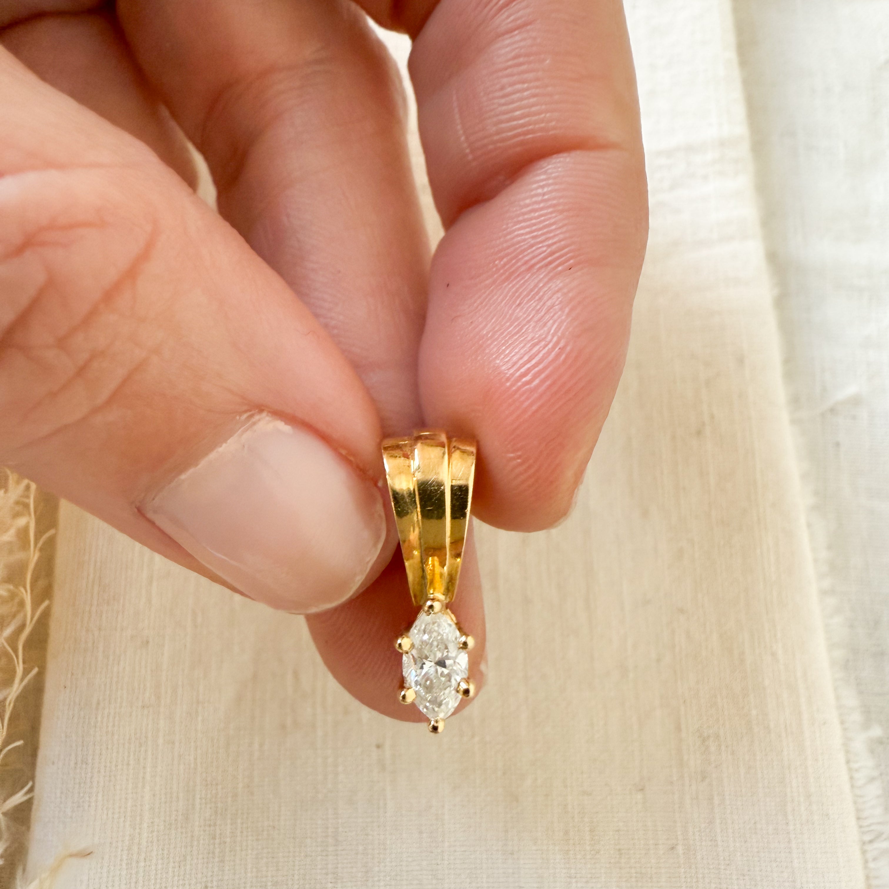 Claw set with a marquise cut diamond 0.45 ct. estimated weight. The clarity/colour grade is VS-2/G-H with good proportion and finish. The pendant measures 2 x .5 cm. The pendant weighs 2.2 grams.