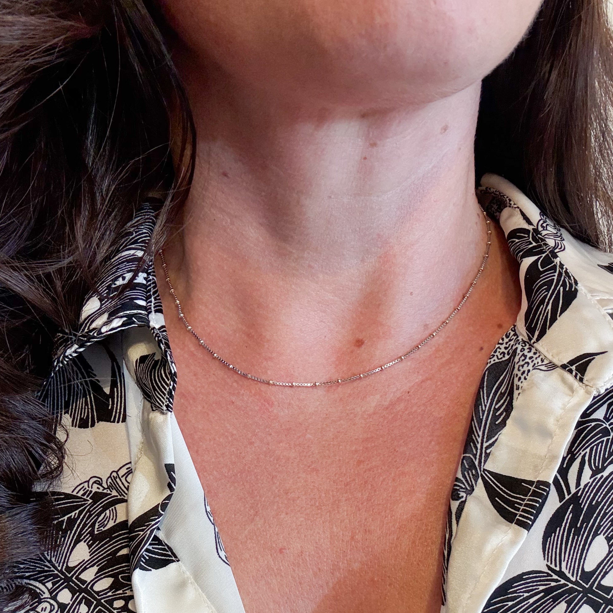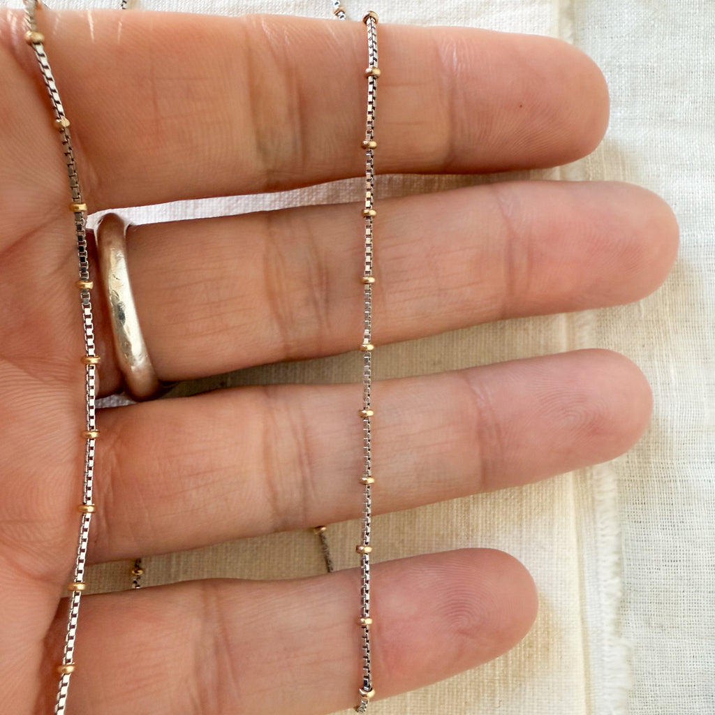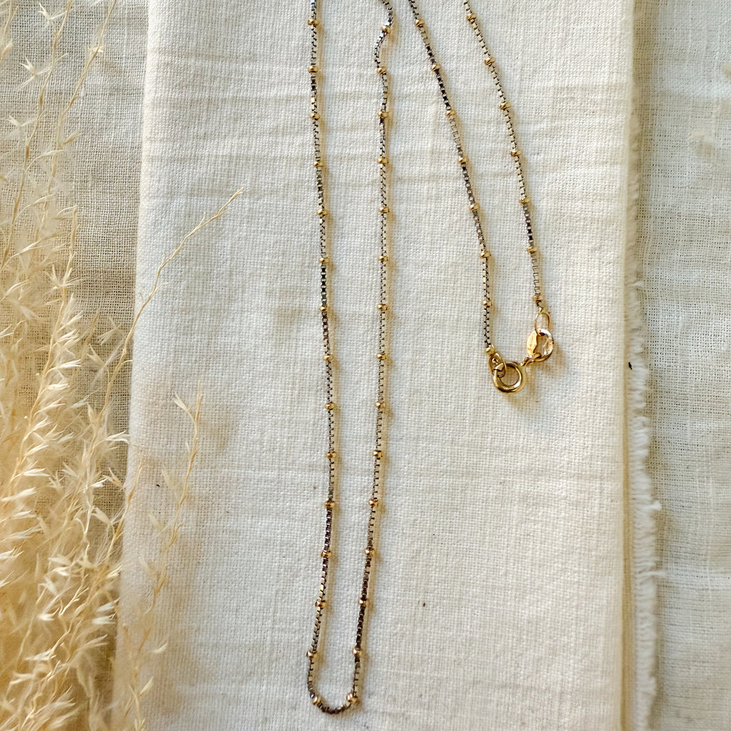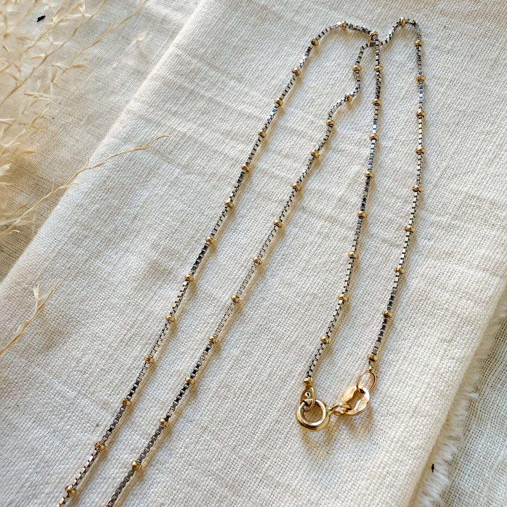 White gold box chain 1.6 mm. with gold ball stations, 16 inches long weighing 2.7 grams finished with a spring ring clasp