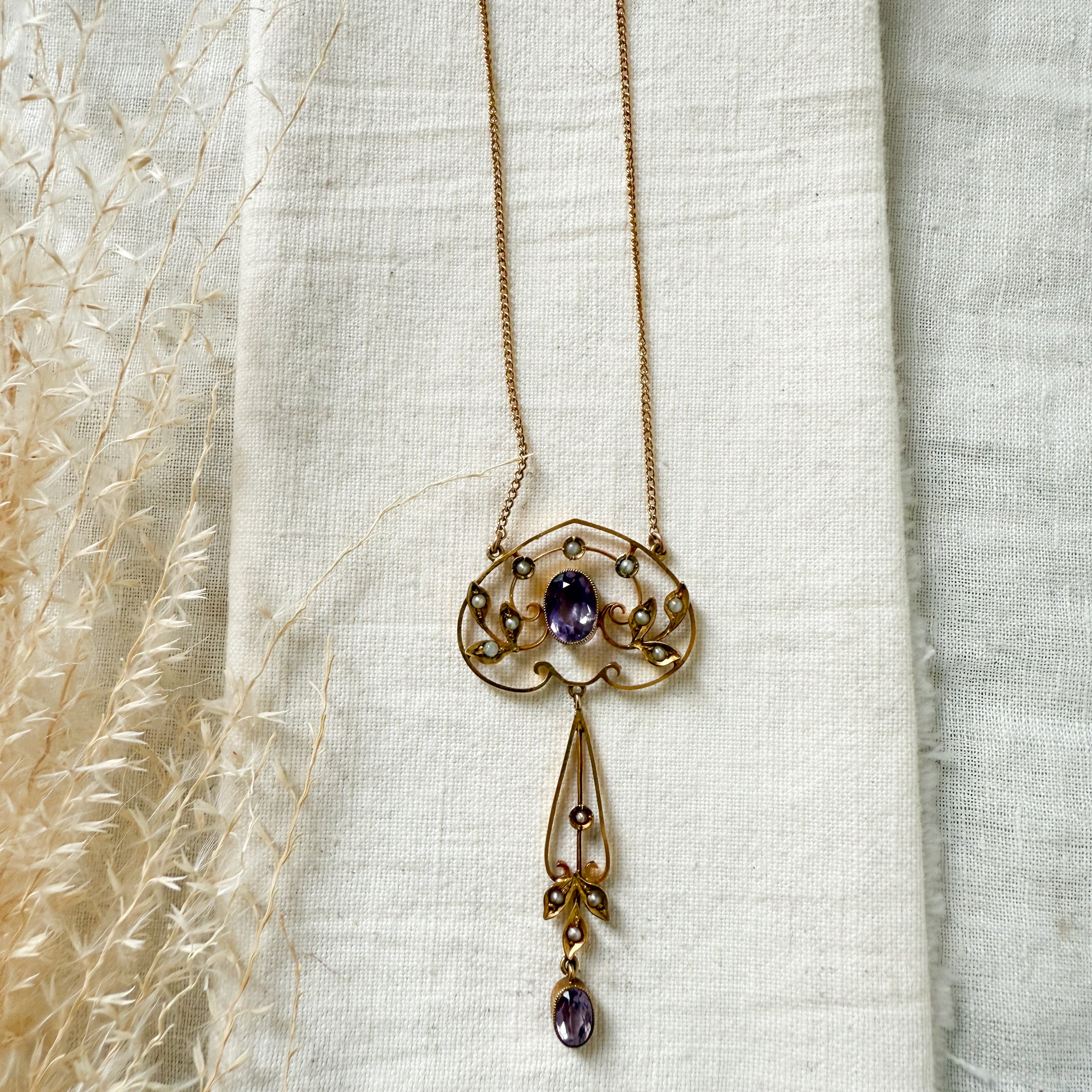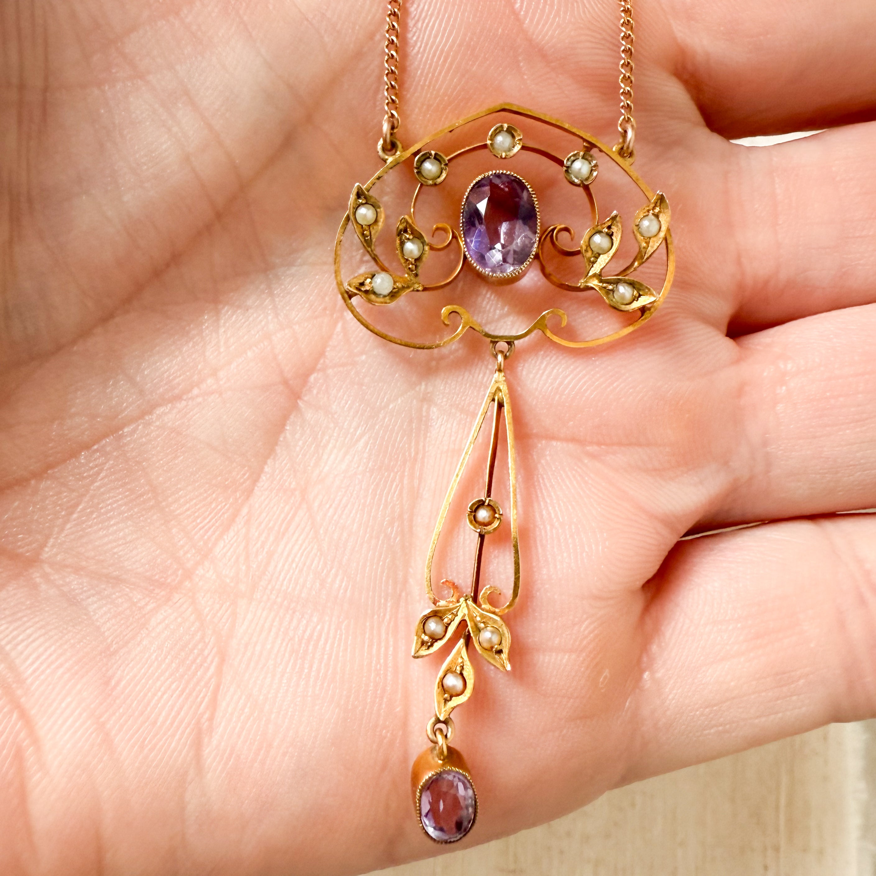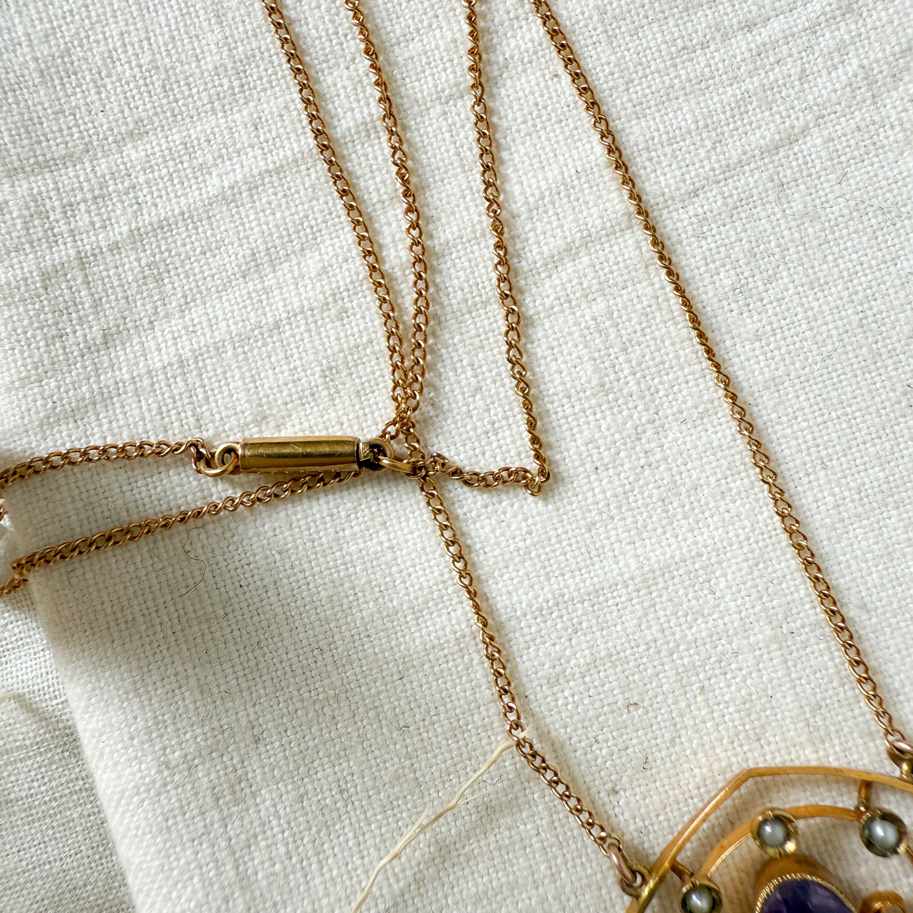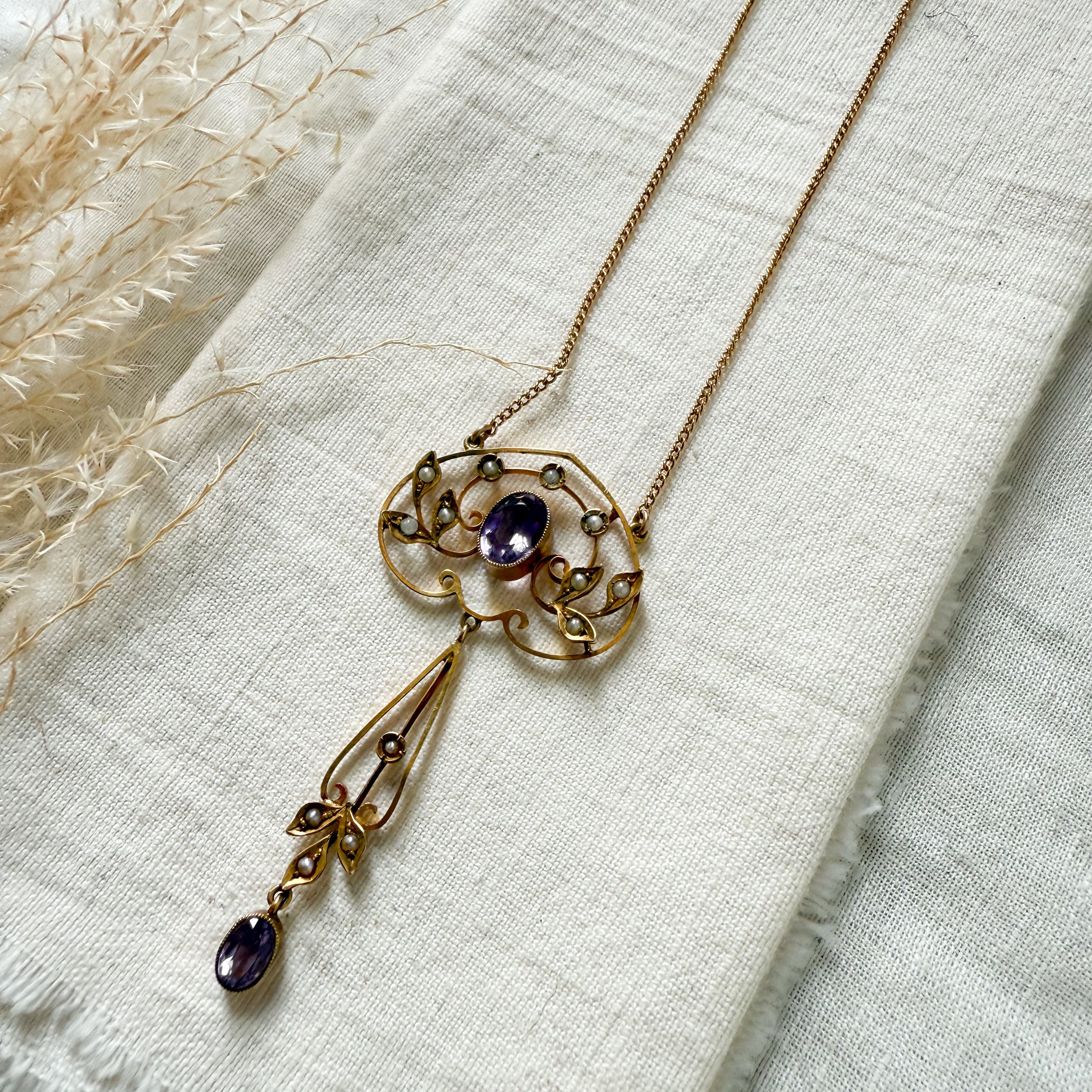 Antique 14k yellow gold amethyst and Edwardian lavalier necklace