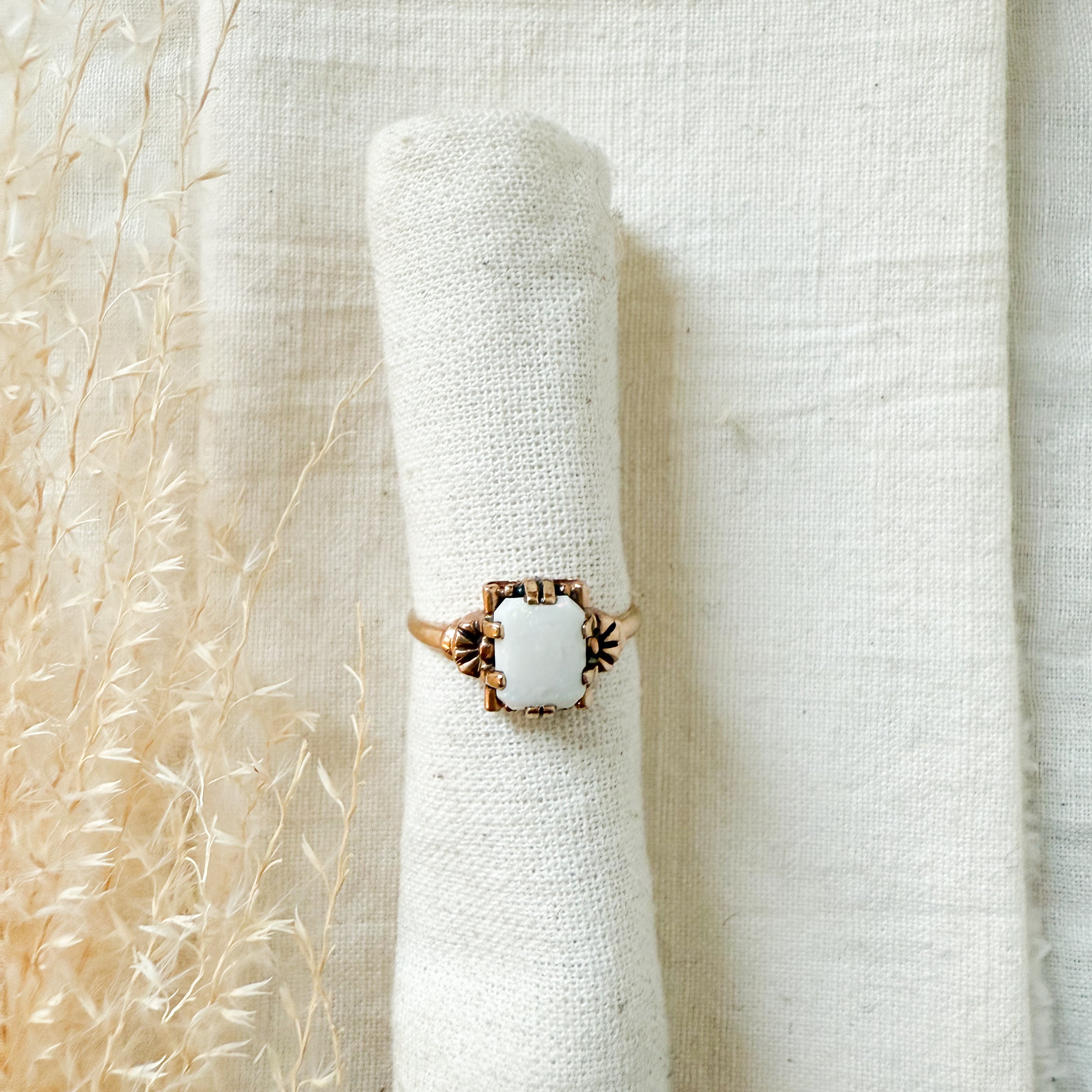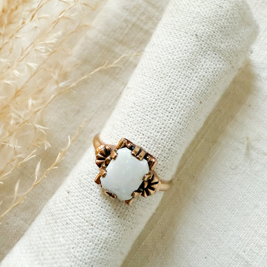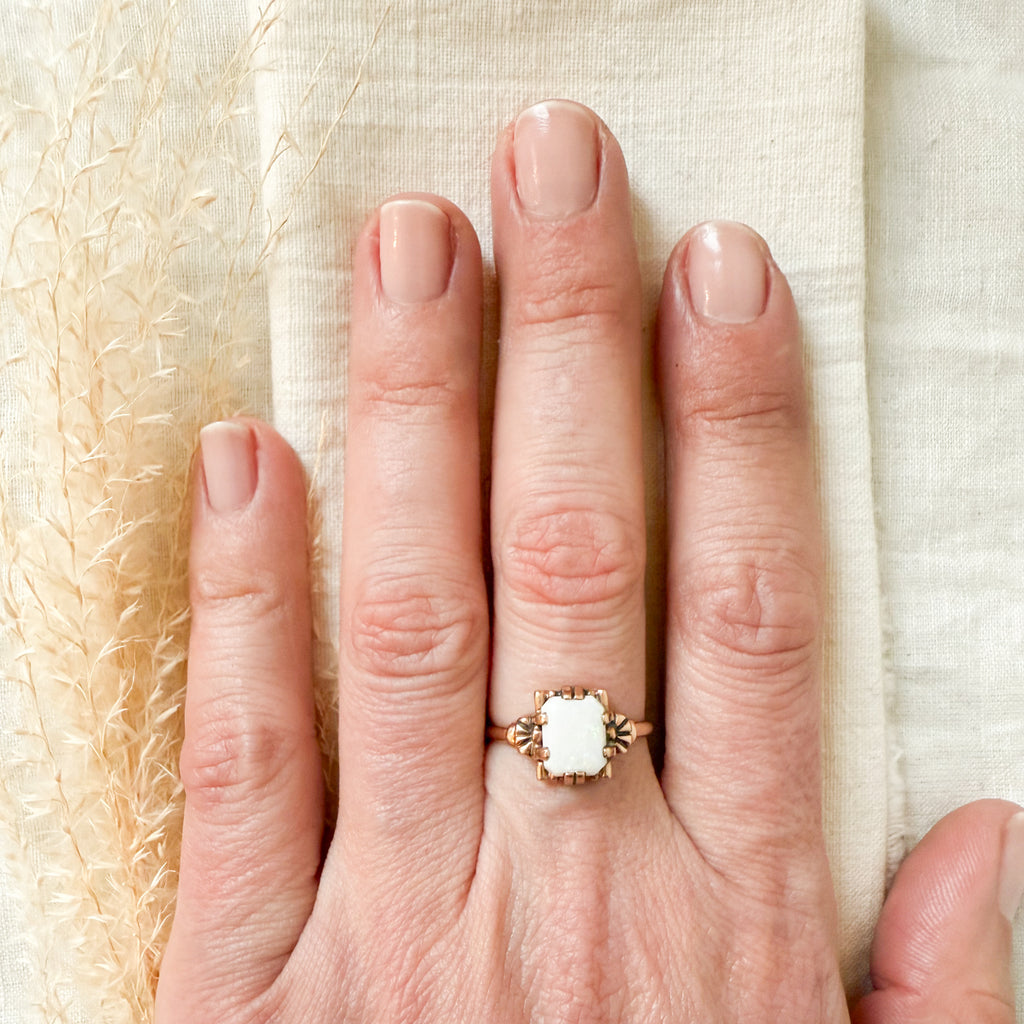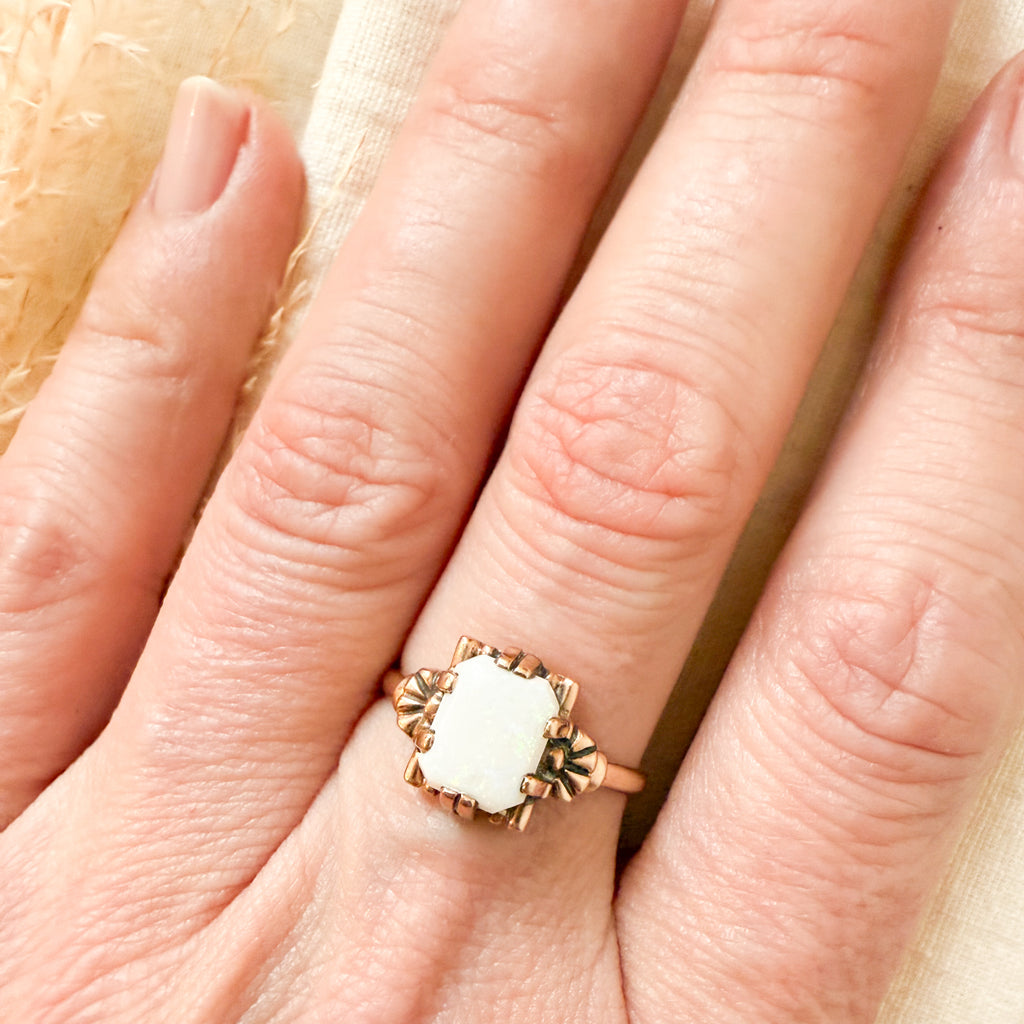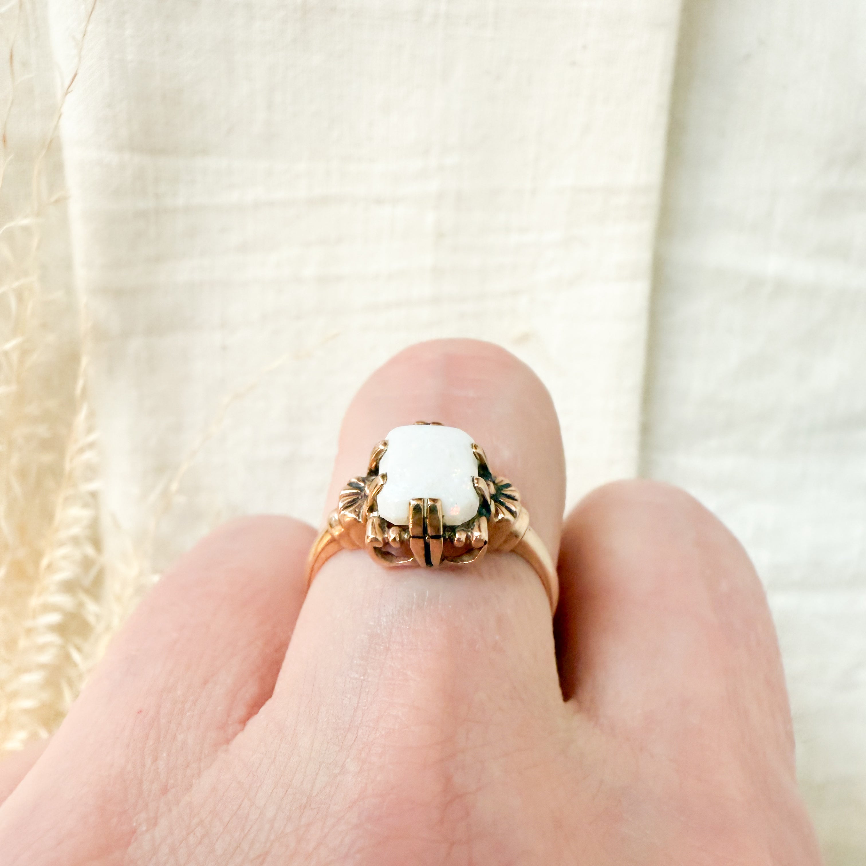 Claw set with a rectangular cabochon natural white opal measuring 8 x 6 mm.light play of colour, floral shoulders. Size 7 3/4, weighing 2.3 grams