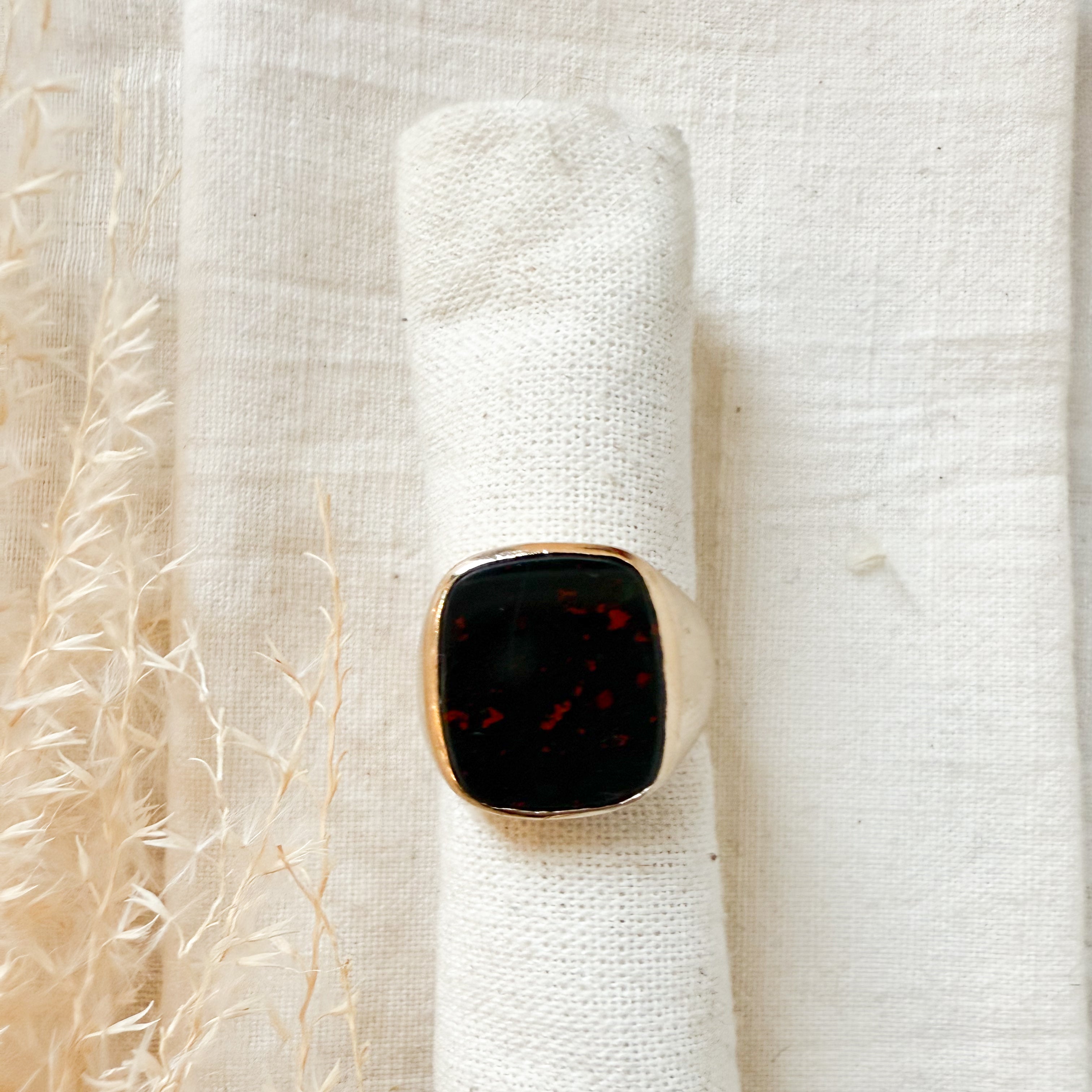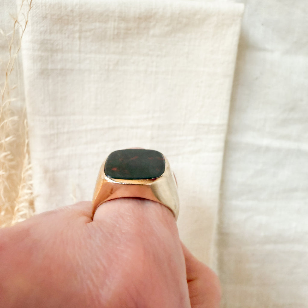Bezel set with a rectangular cushion shape natural bloodstone slab measuring 16 x 14 mm. Size 7 3/4, weighing 8 grams