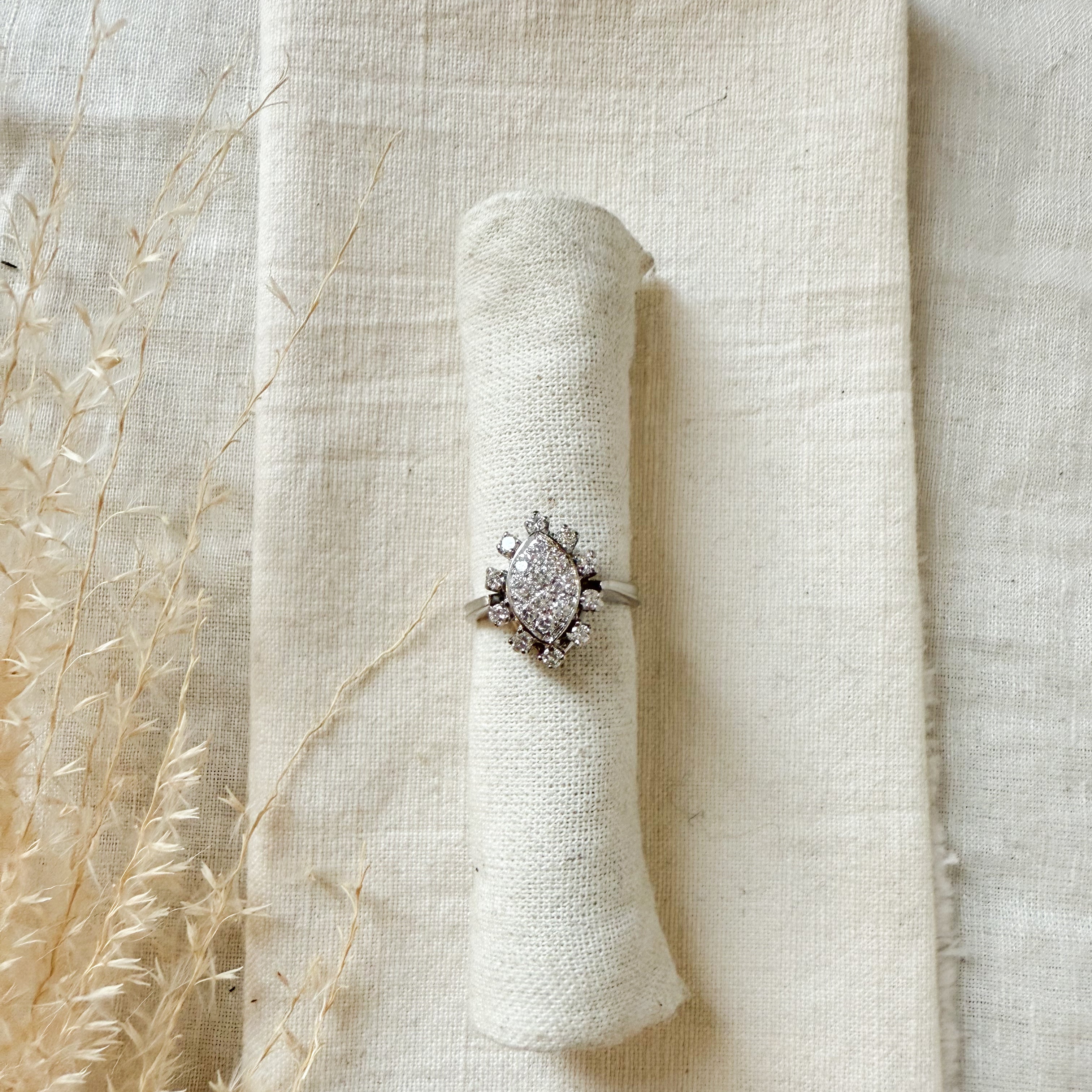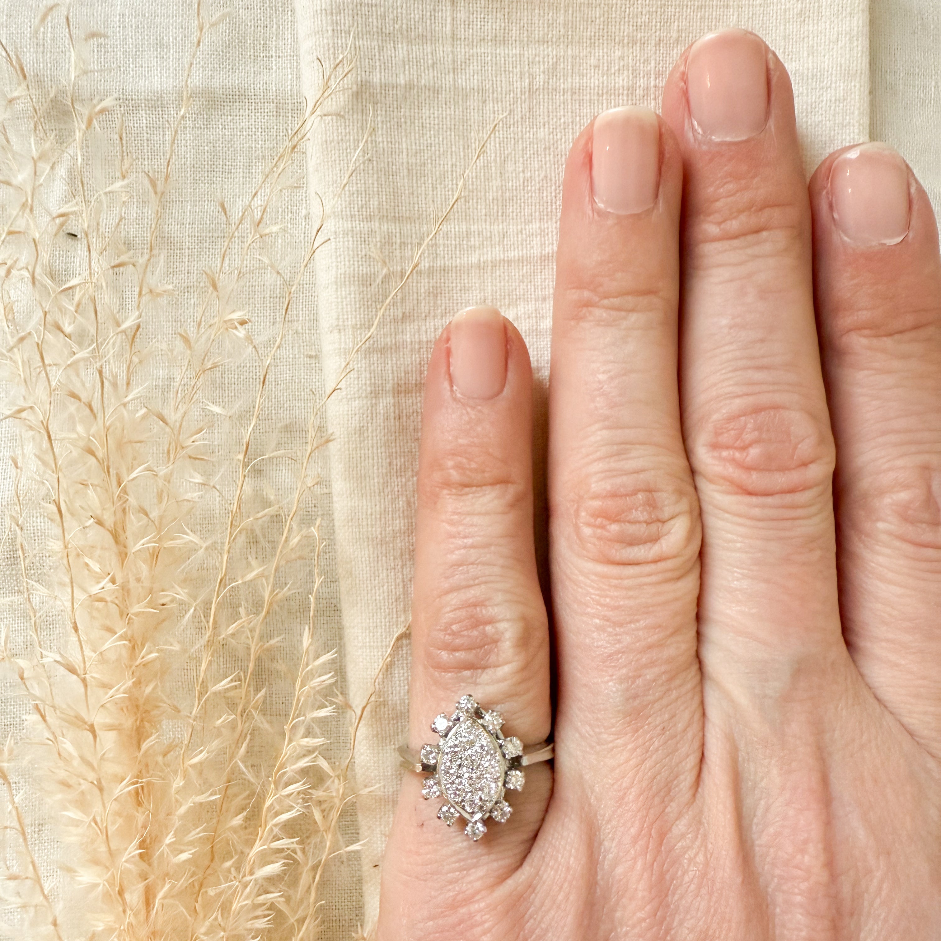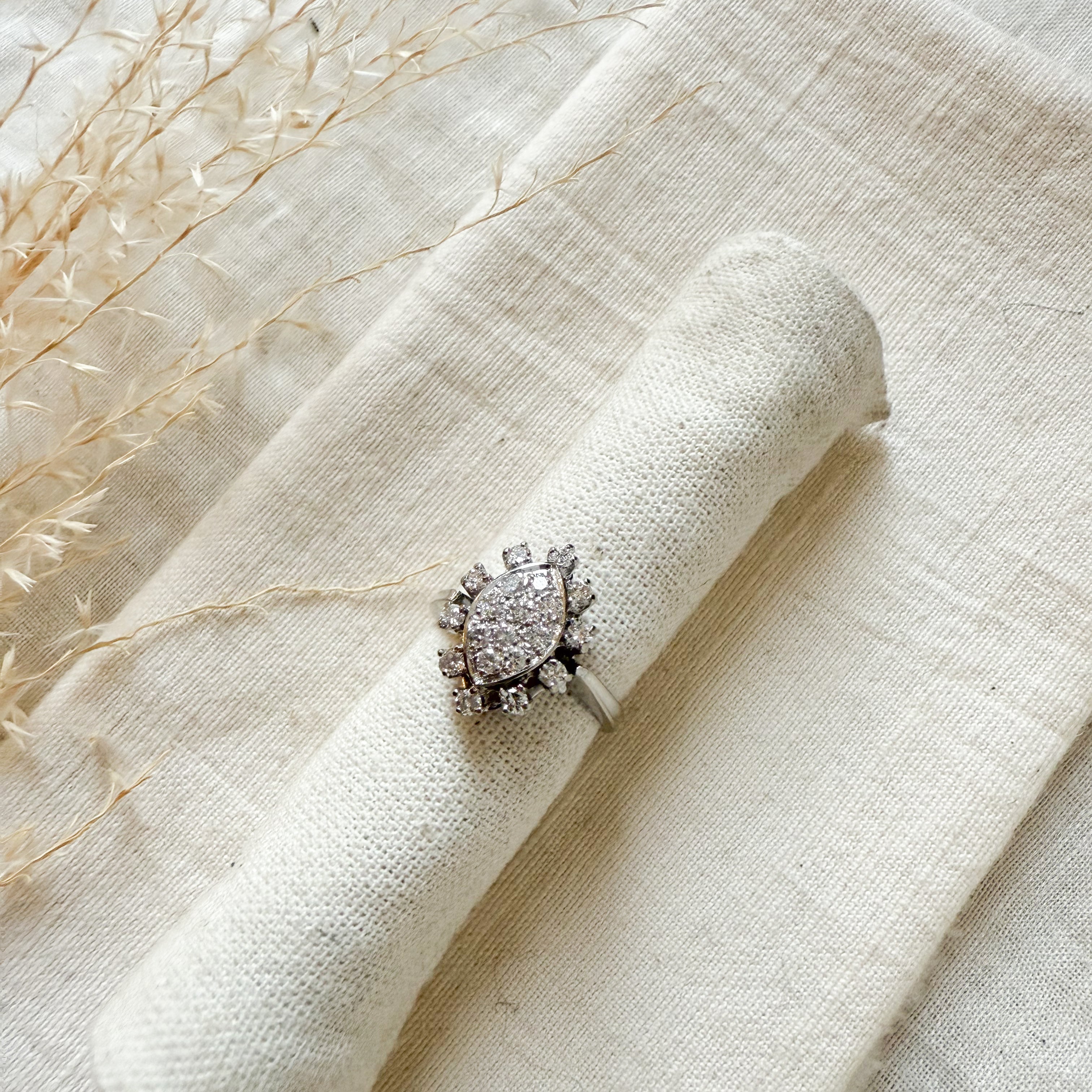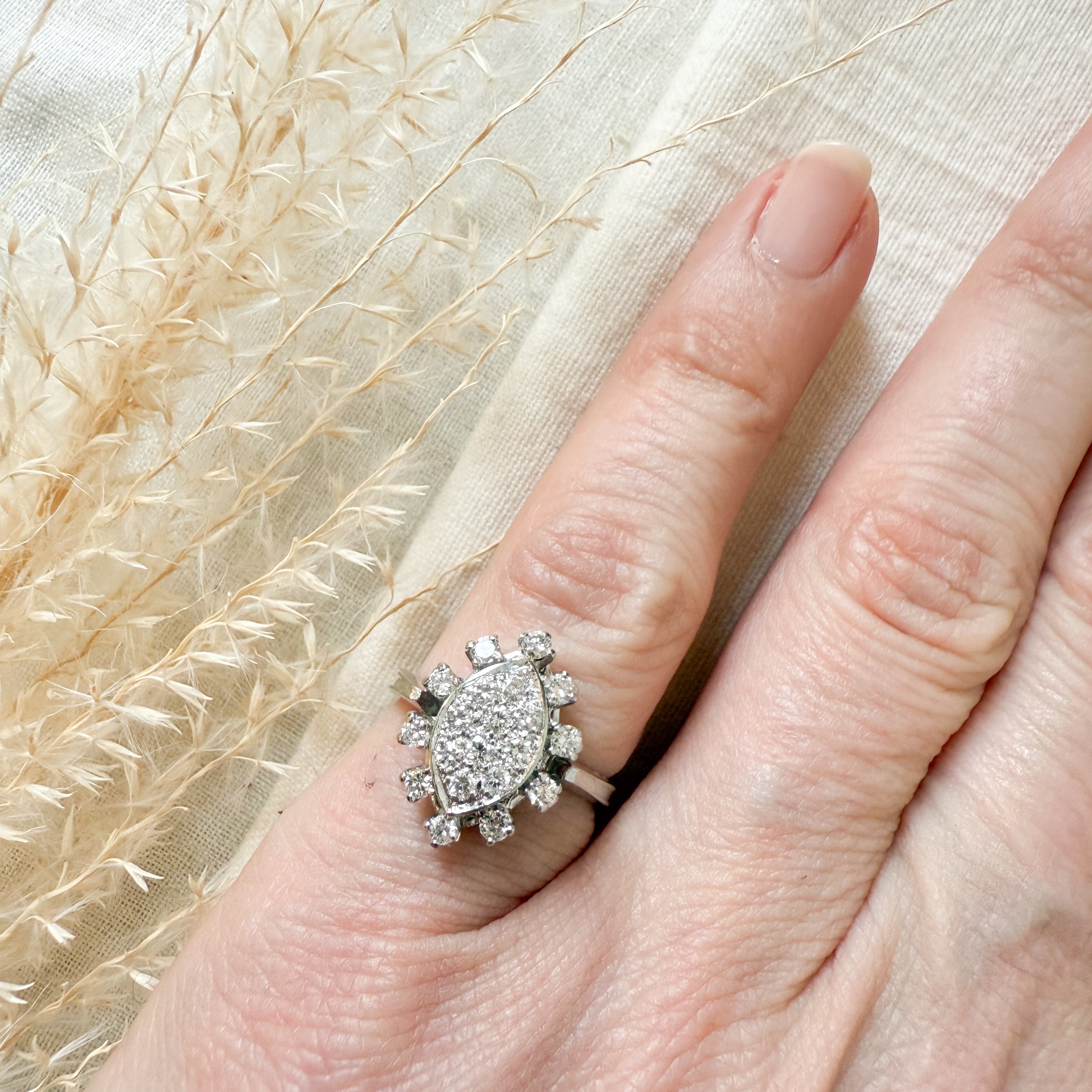 Bead set centre with 10 full cut diamonds and 10 full cut diamonds claw set surrounding it 0.45 ct. estimated total weight. The clarity/colour grade is VS-2/G-H, one diamond is chipped. The ring weighs 3.4 grams. Size 4 3/4.