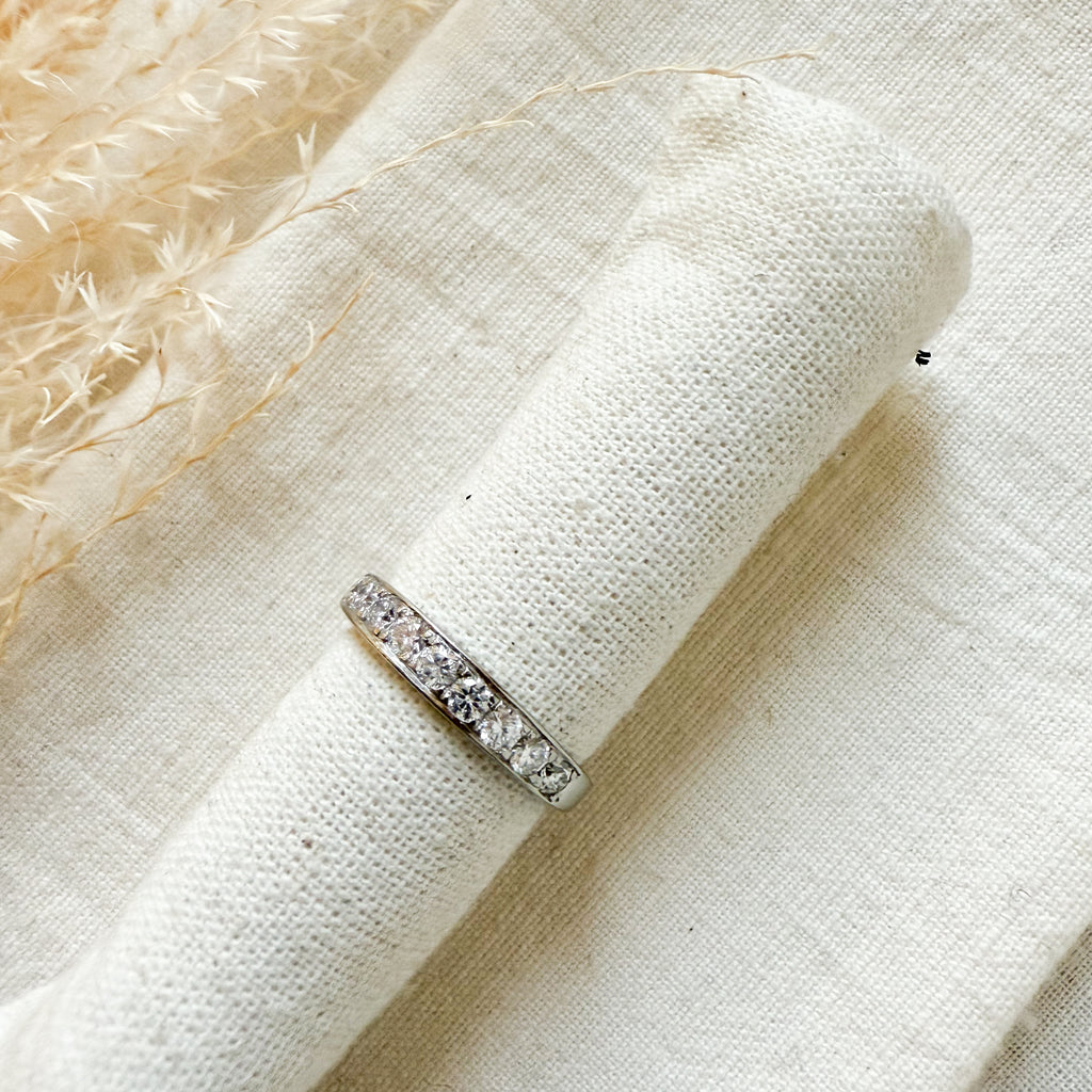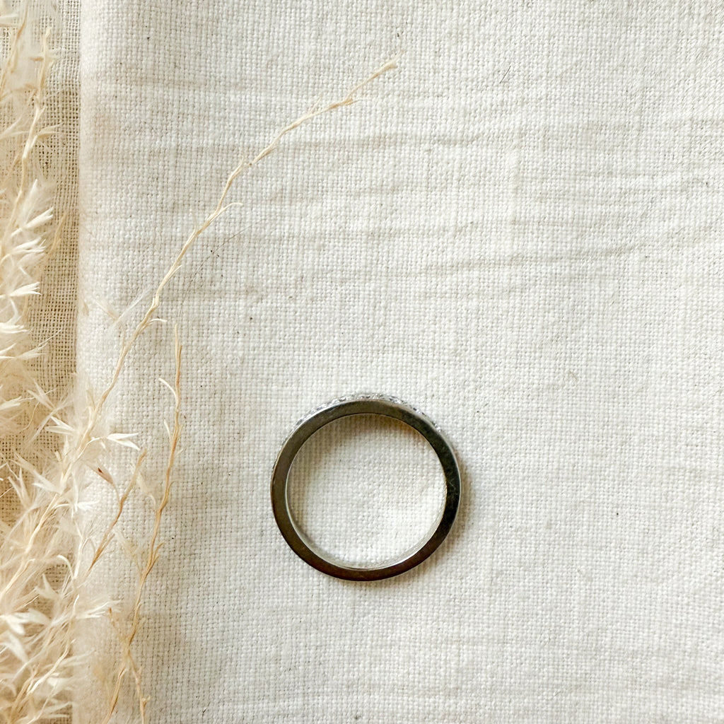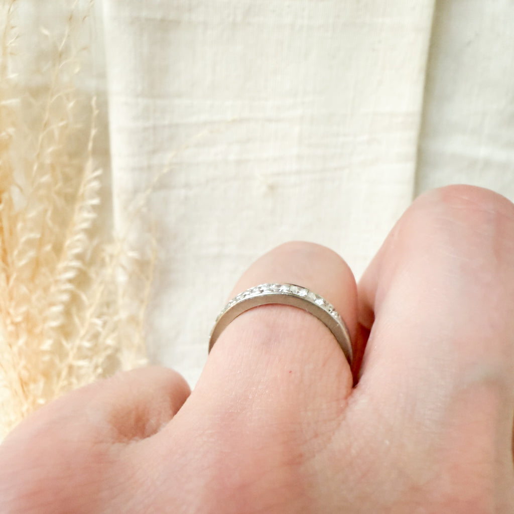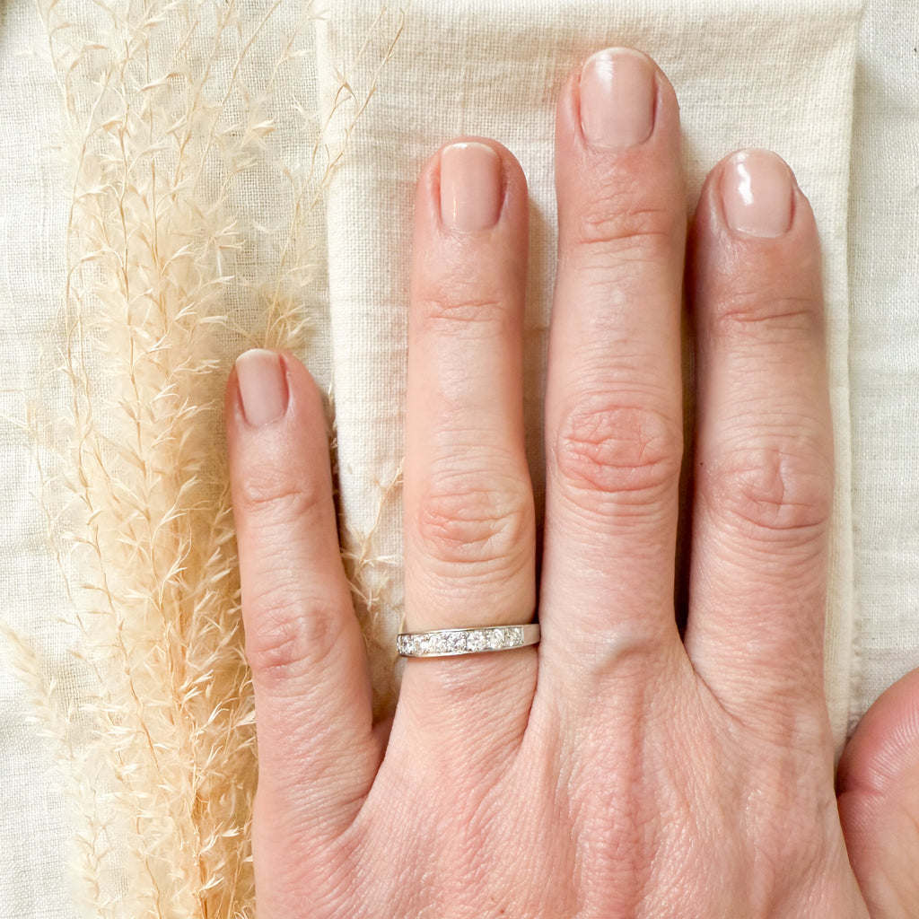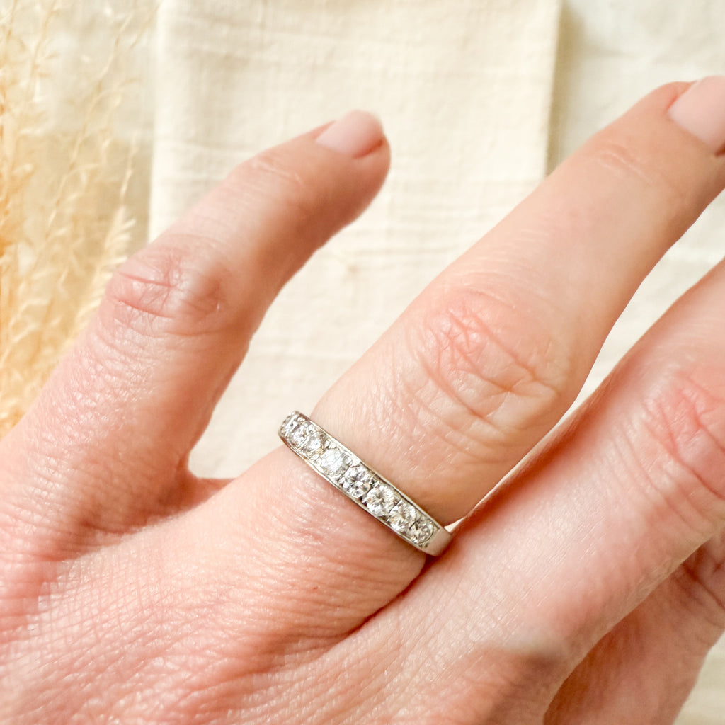 Bead set with 9 full cut diamonds .36 ct estimated total weight. The clarity/colour grade of the diamonds is VS-2-SI-1/G-H with good proportion and finish. The ring weighs 2.2 grams, size 5.