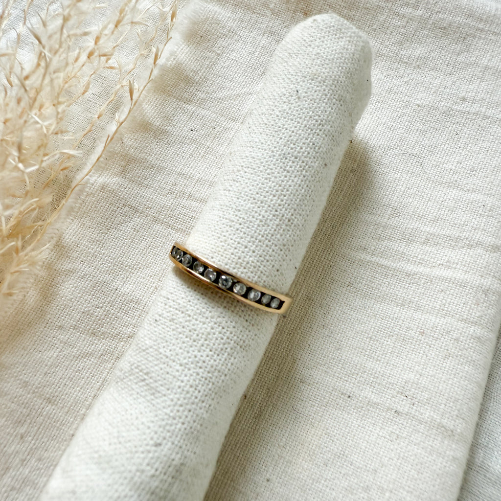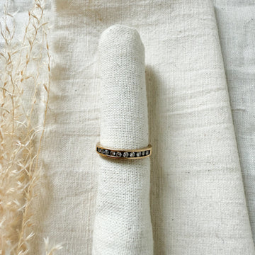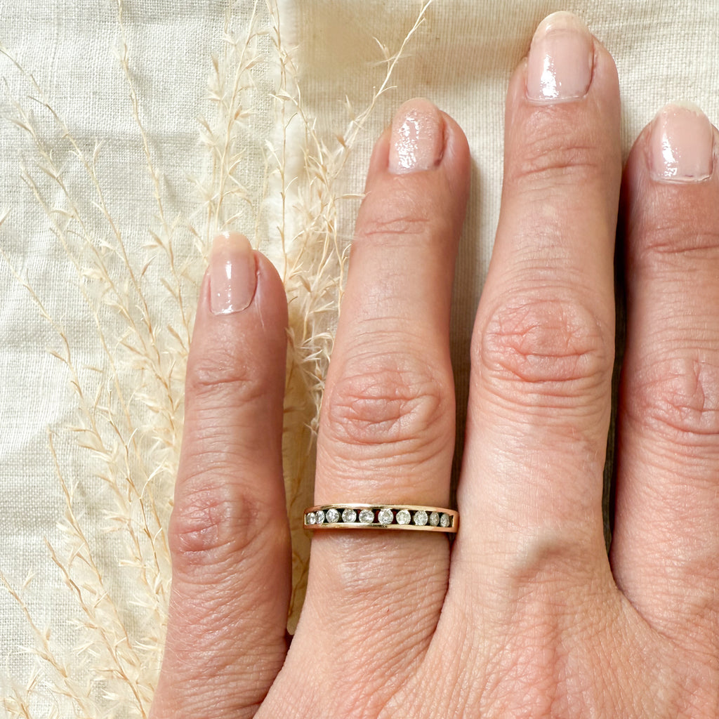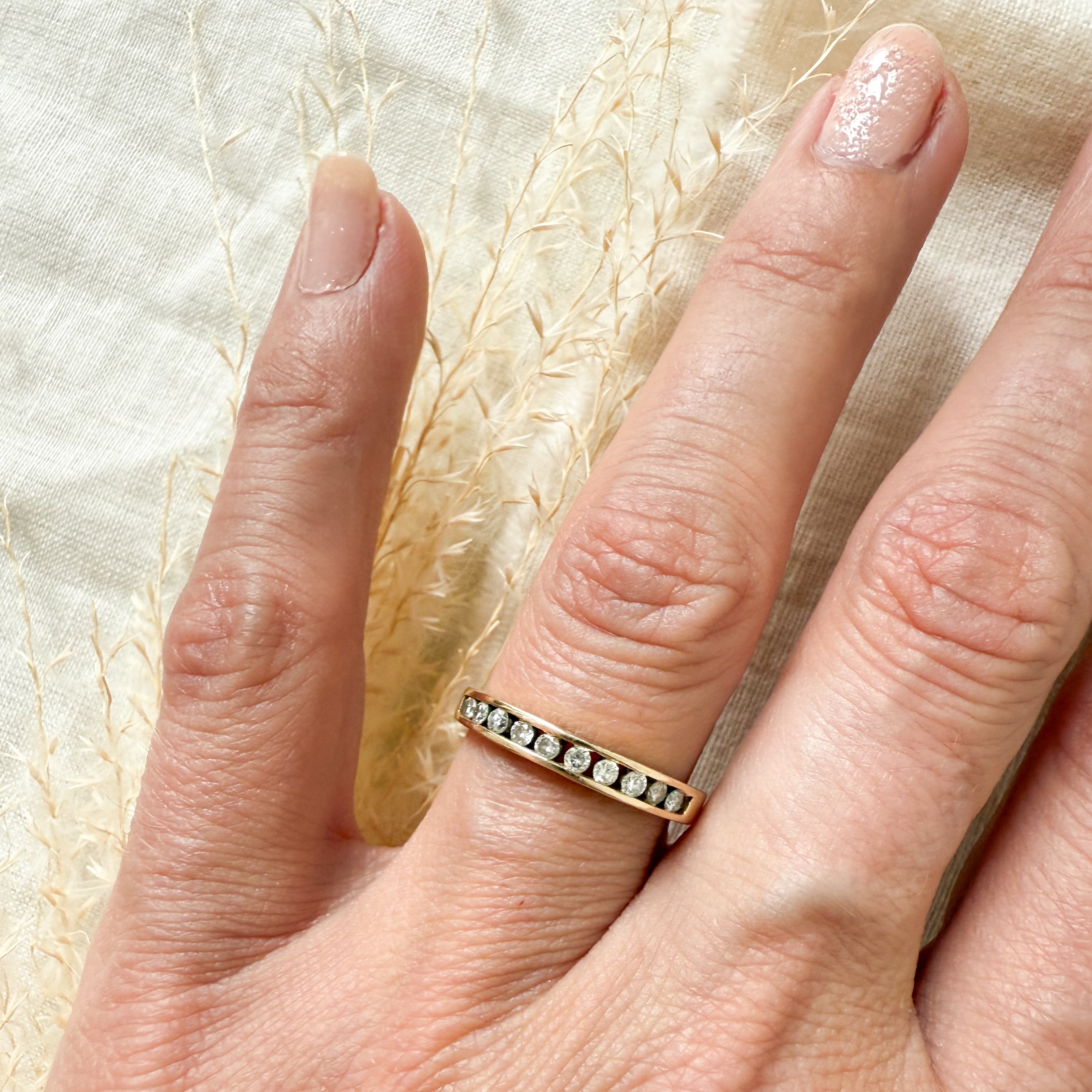 Channel set with 10 round brilliant cut diamonds, 0..20 ct. estimated total weight. The clarity/colour grade SI-2/I-J with good proportion and finish. Size 6 3/4 weighing 2.3 grams.