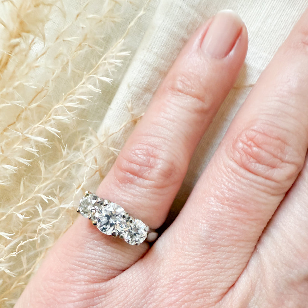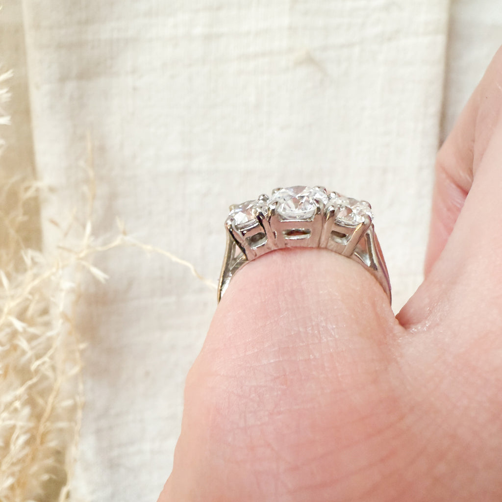 Claw set with three round 39 brilliant cut diamonds 1 x 0.70 ct. in the centre and 2 x 0.40 ct. sides, 1.40 ct. estimated total weight. The clarity/colour grade of the diamonds is VS-1/F-G with good proportion and finish, size 5, weighing 5.4 grams.