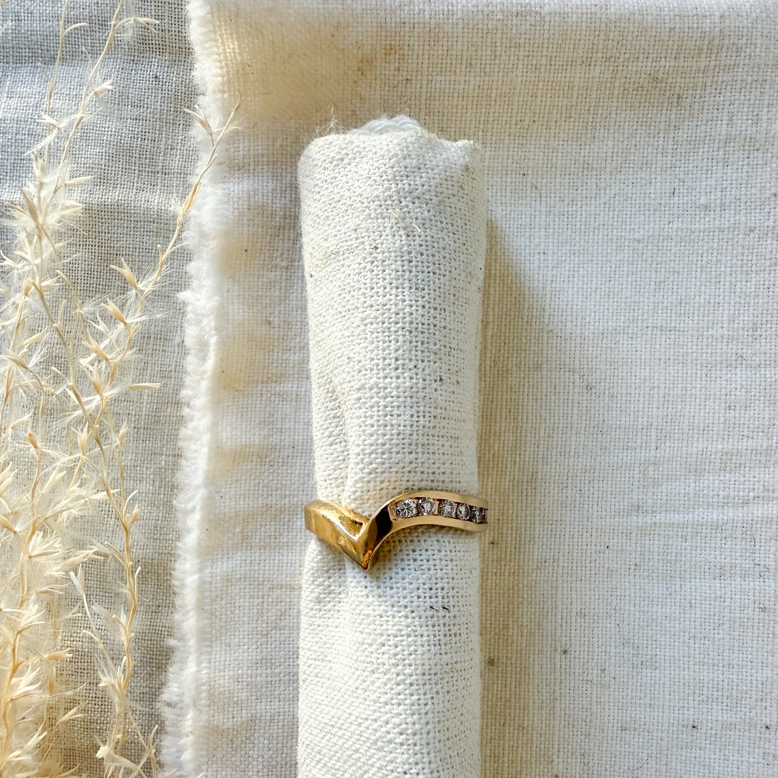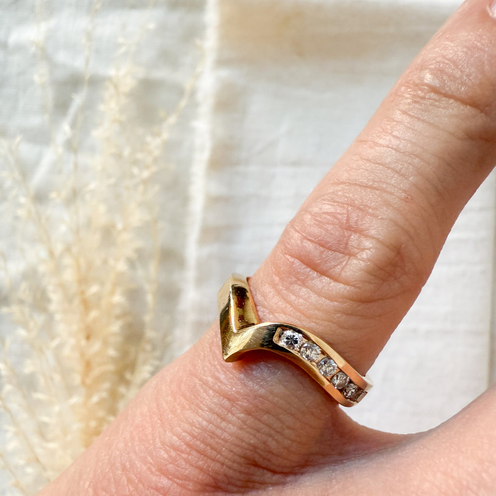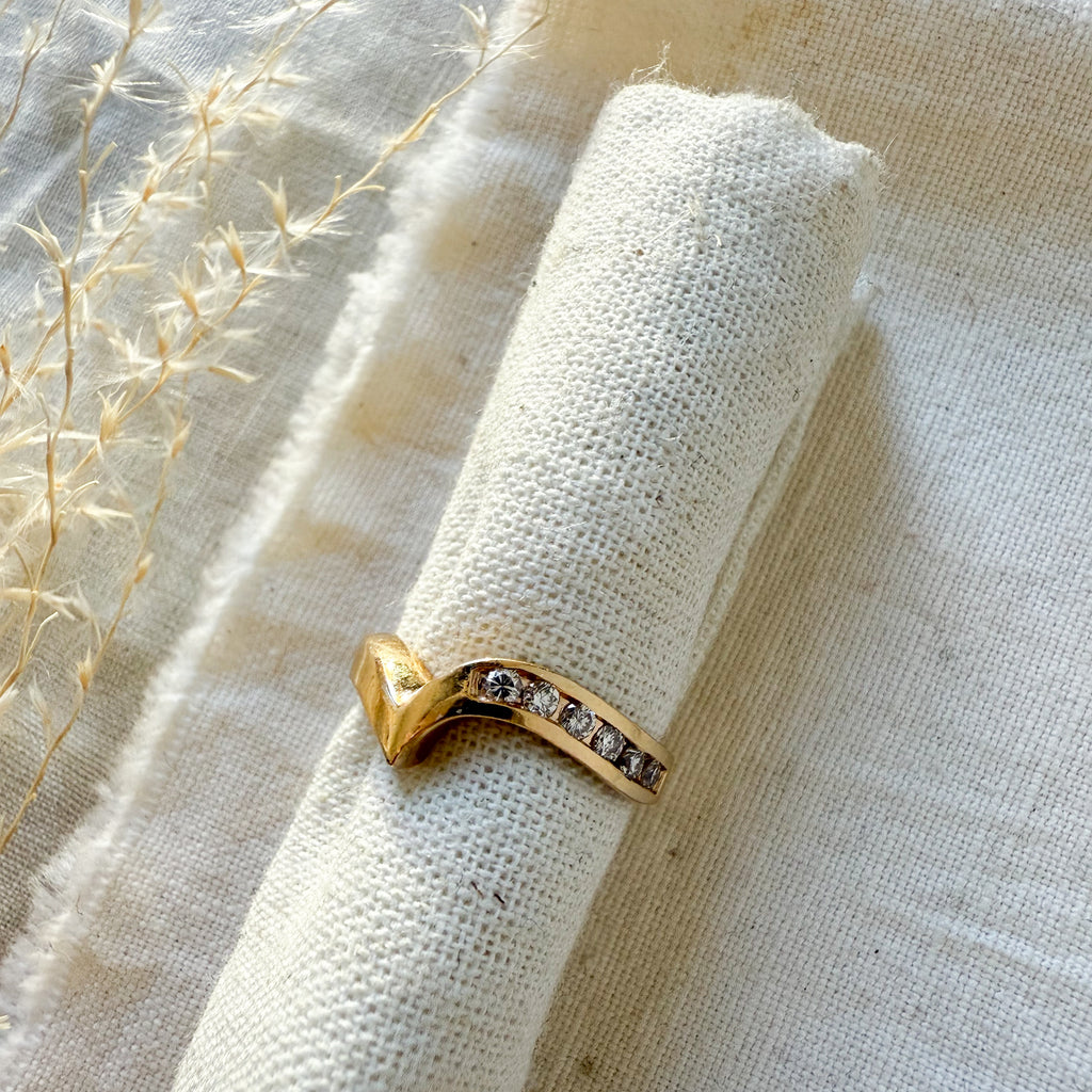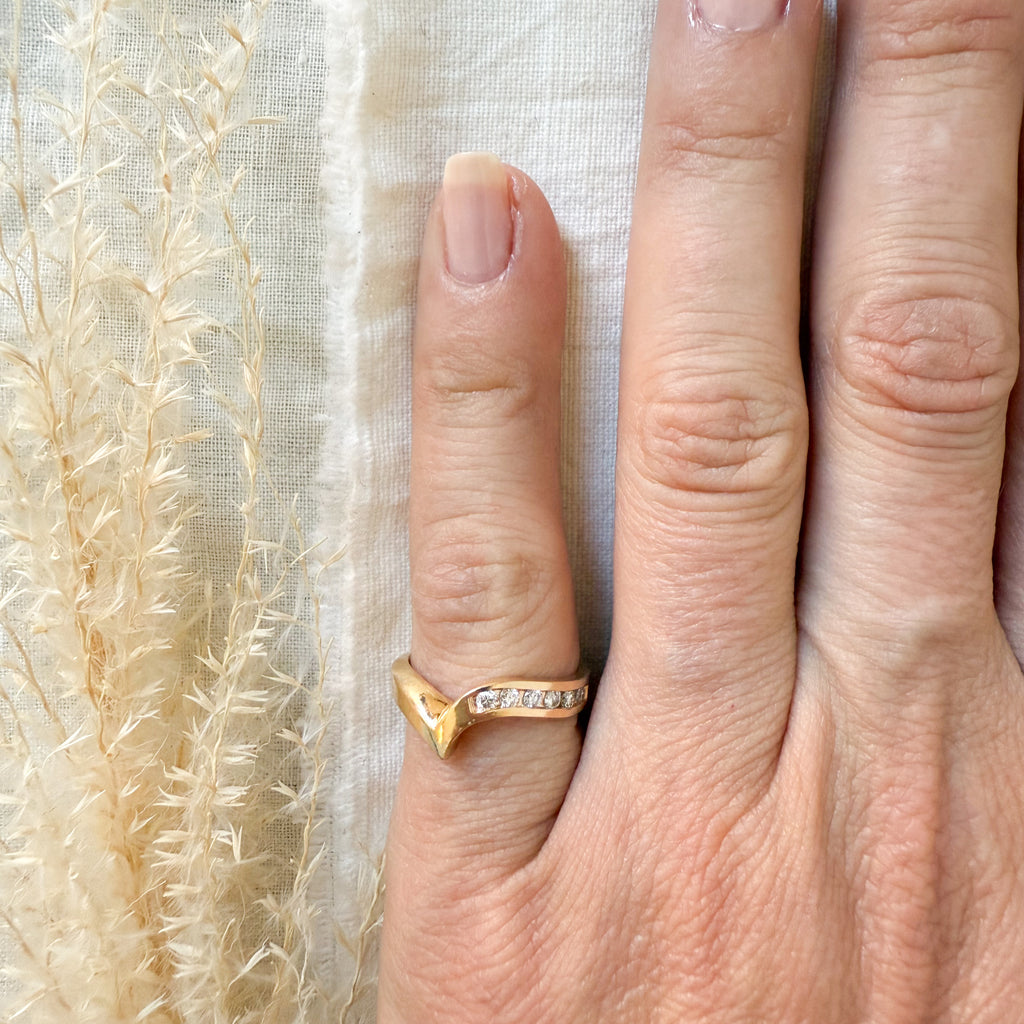 Channel set with 6 full cut diamonds 0.12 ct. estimated total weight. The clarity/colour grade of the diamonds is VS-2/G-H with good proportion and finish. The ring weighs 2.2 grams. Size 5.