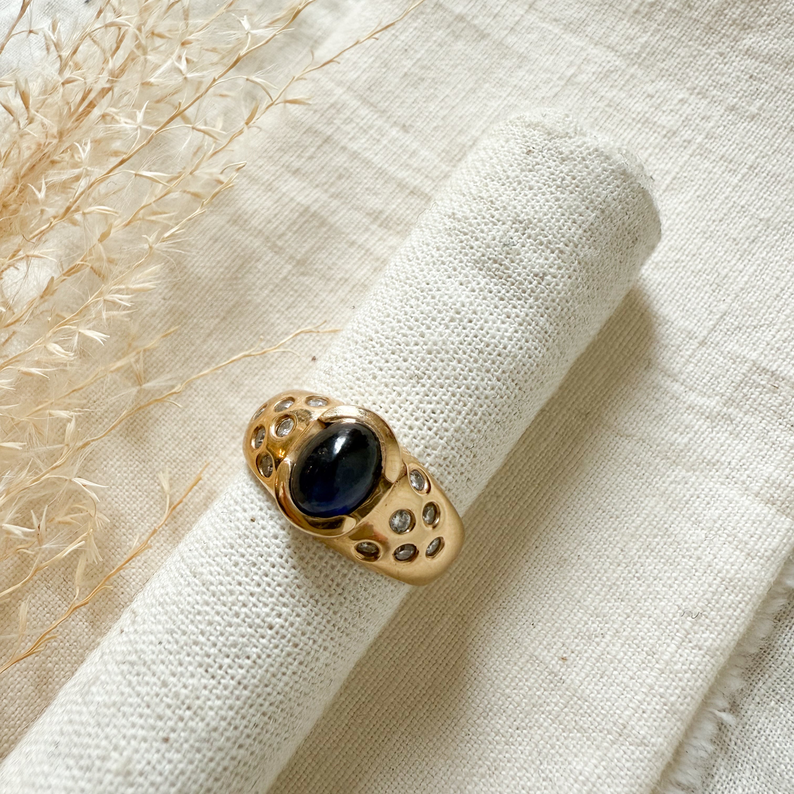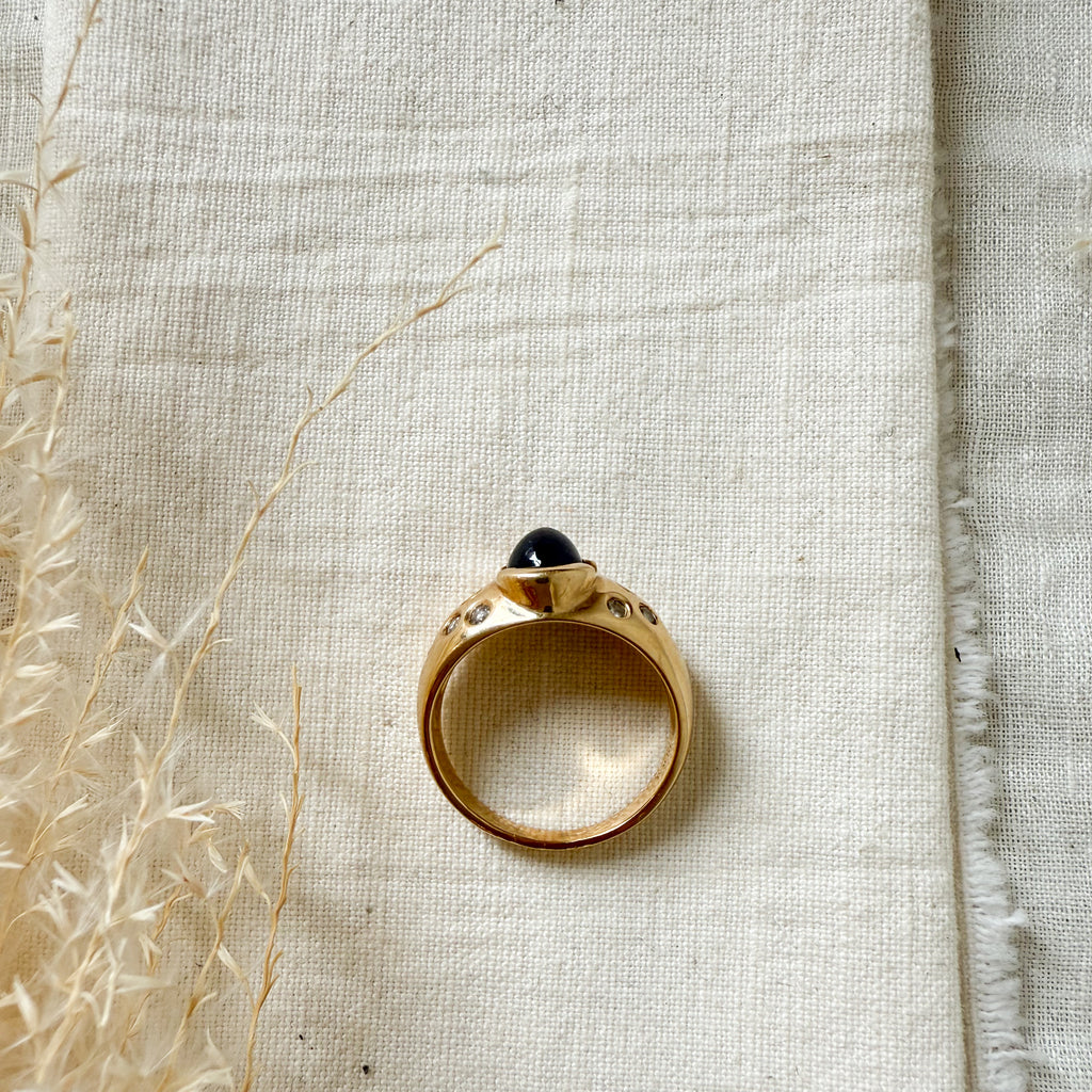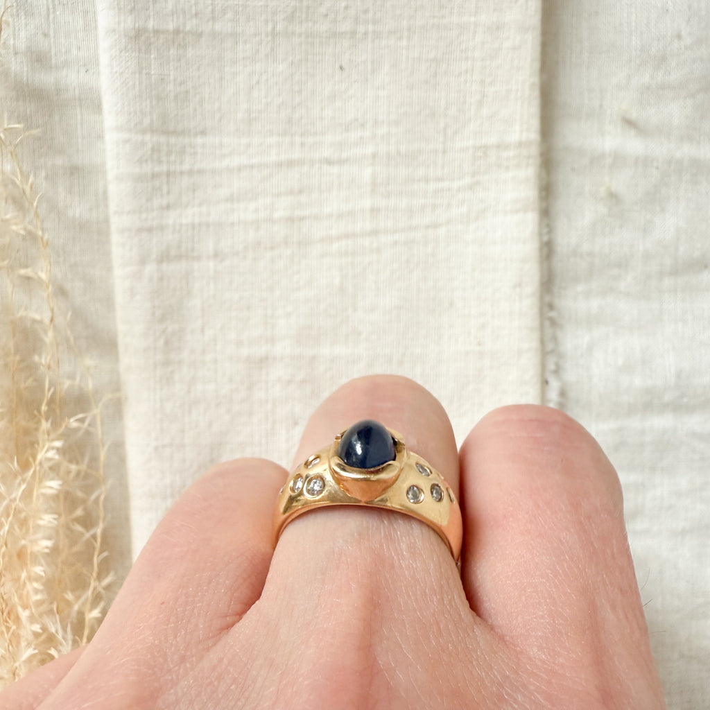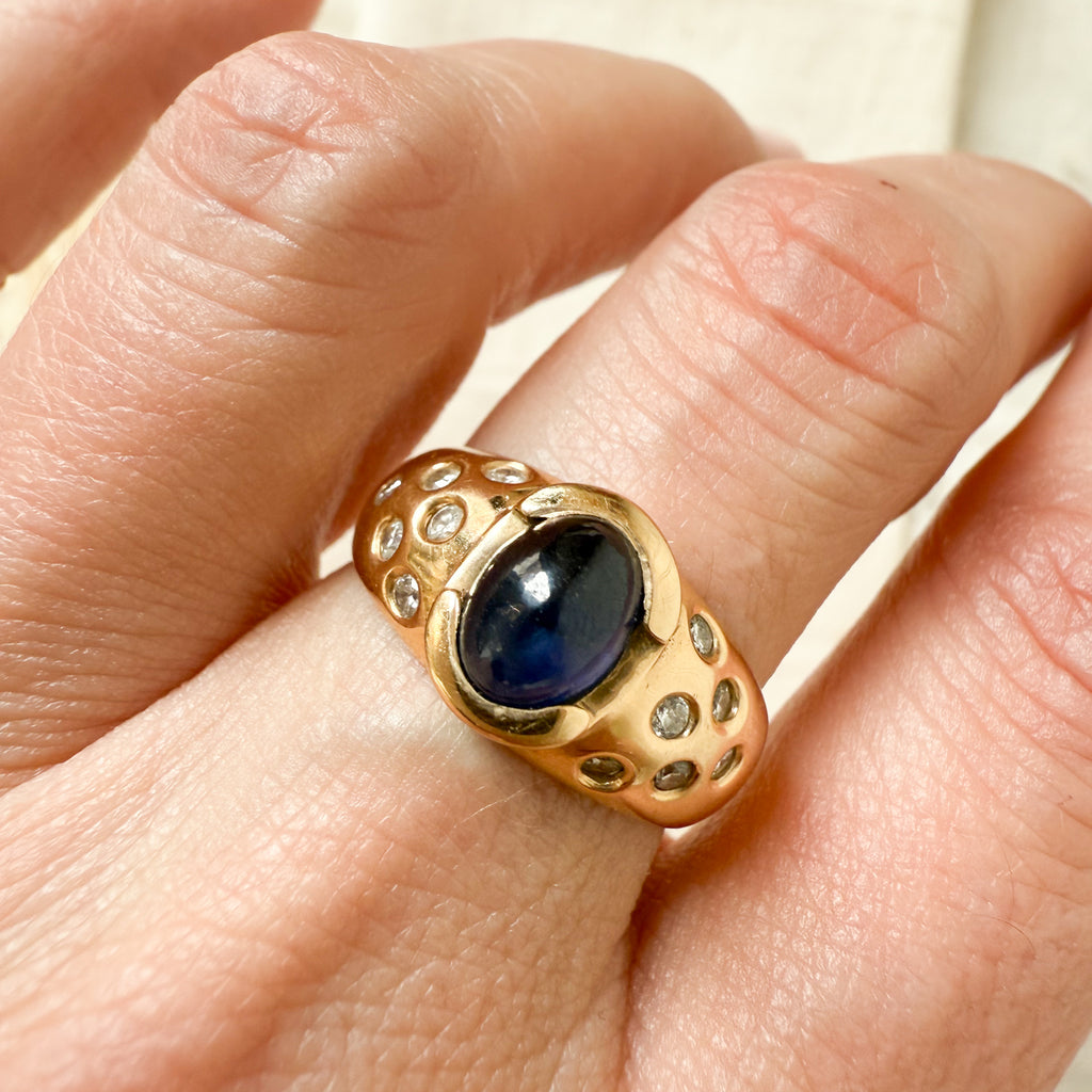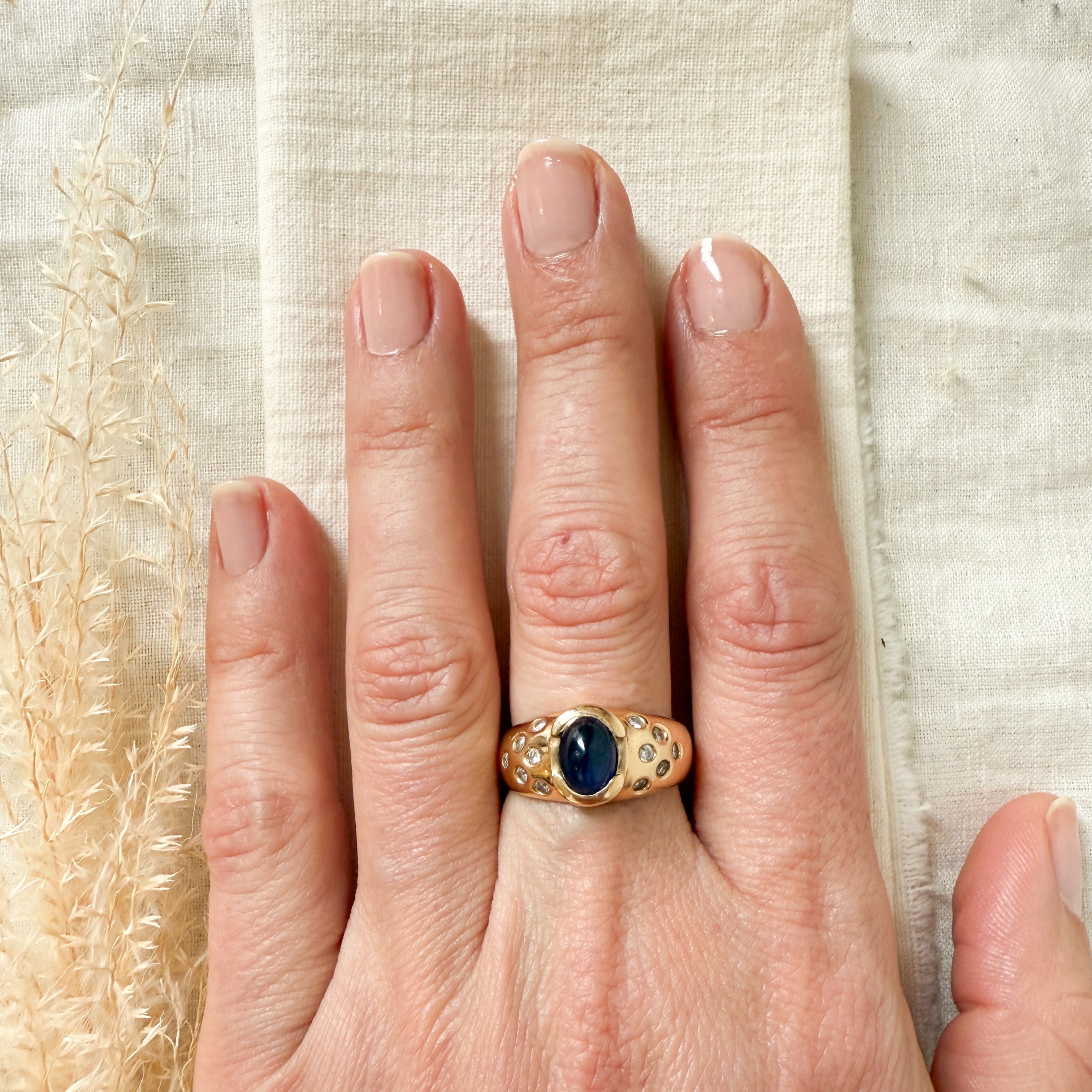 Centre set with an oval cabochon natural sapphire 1.15 ct. The sapphire is dark blue. Gypsy set are 12 full cut diamonds 0.18ct. estimated total weight. The clarity/colour grade is SI-1/H-I with good proportion and finish. The ring weighs 6.2 grams. Size 7.