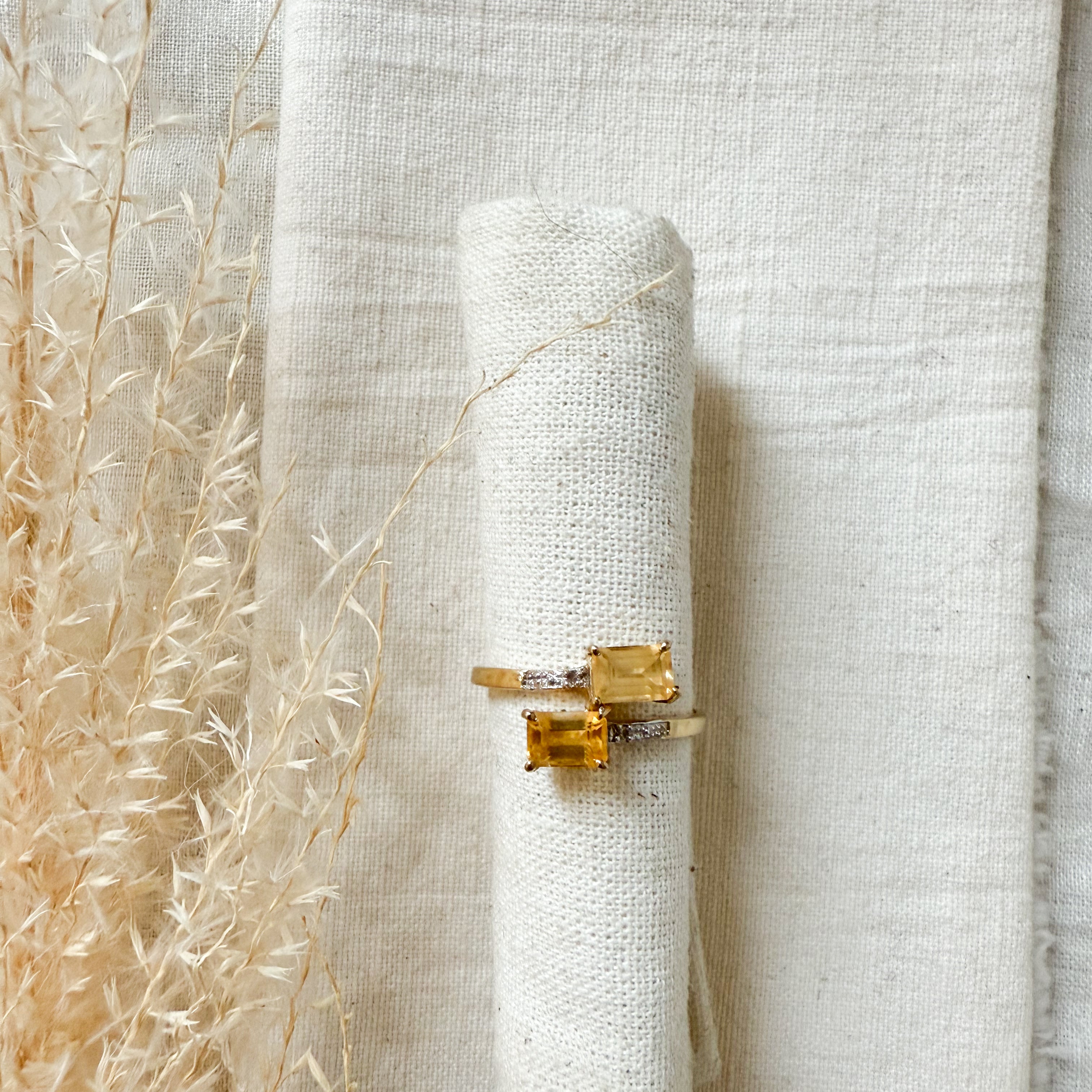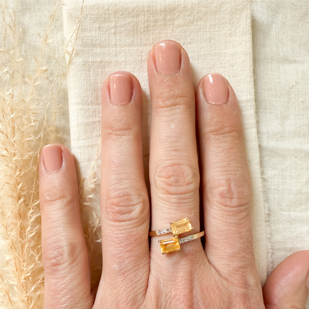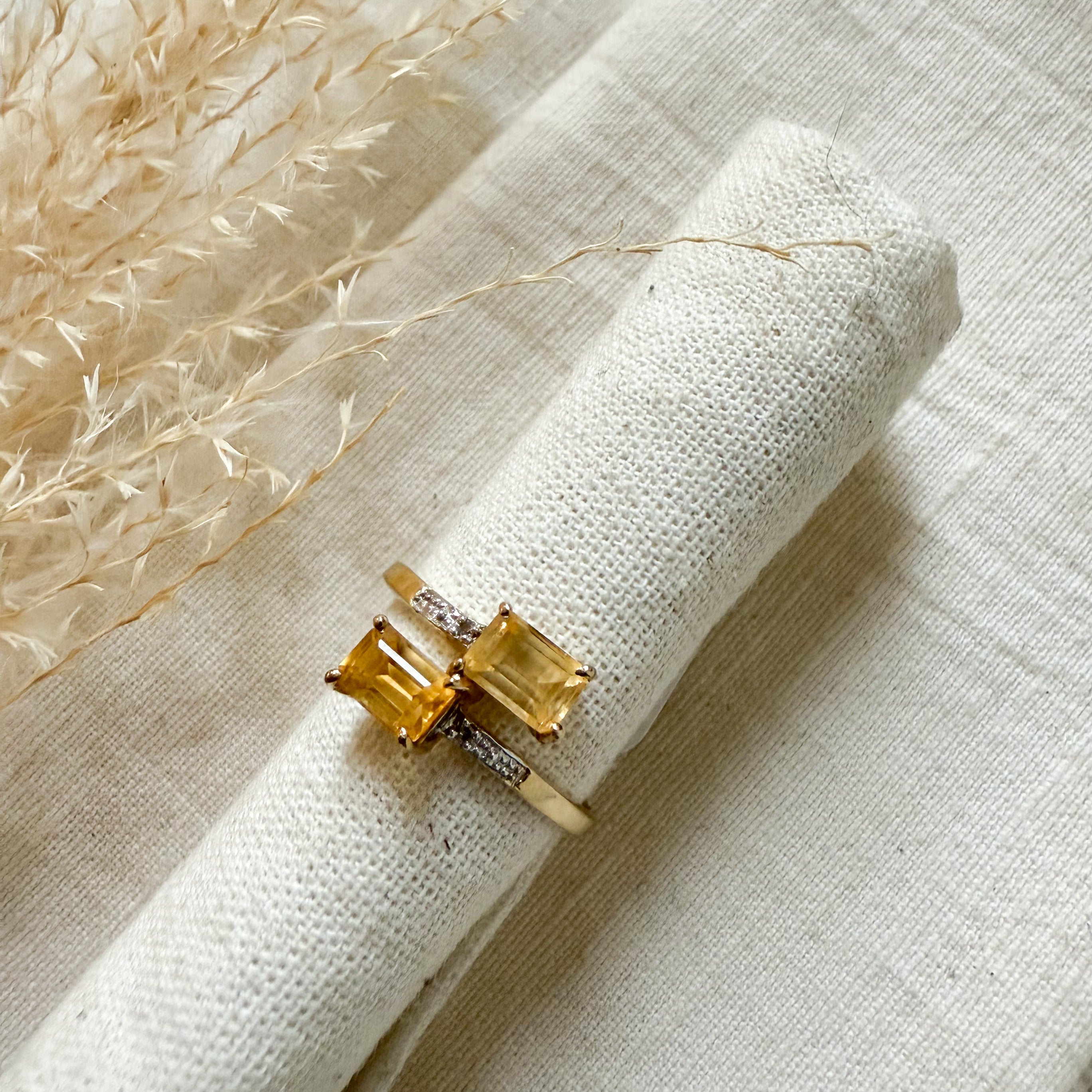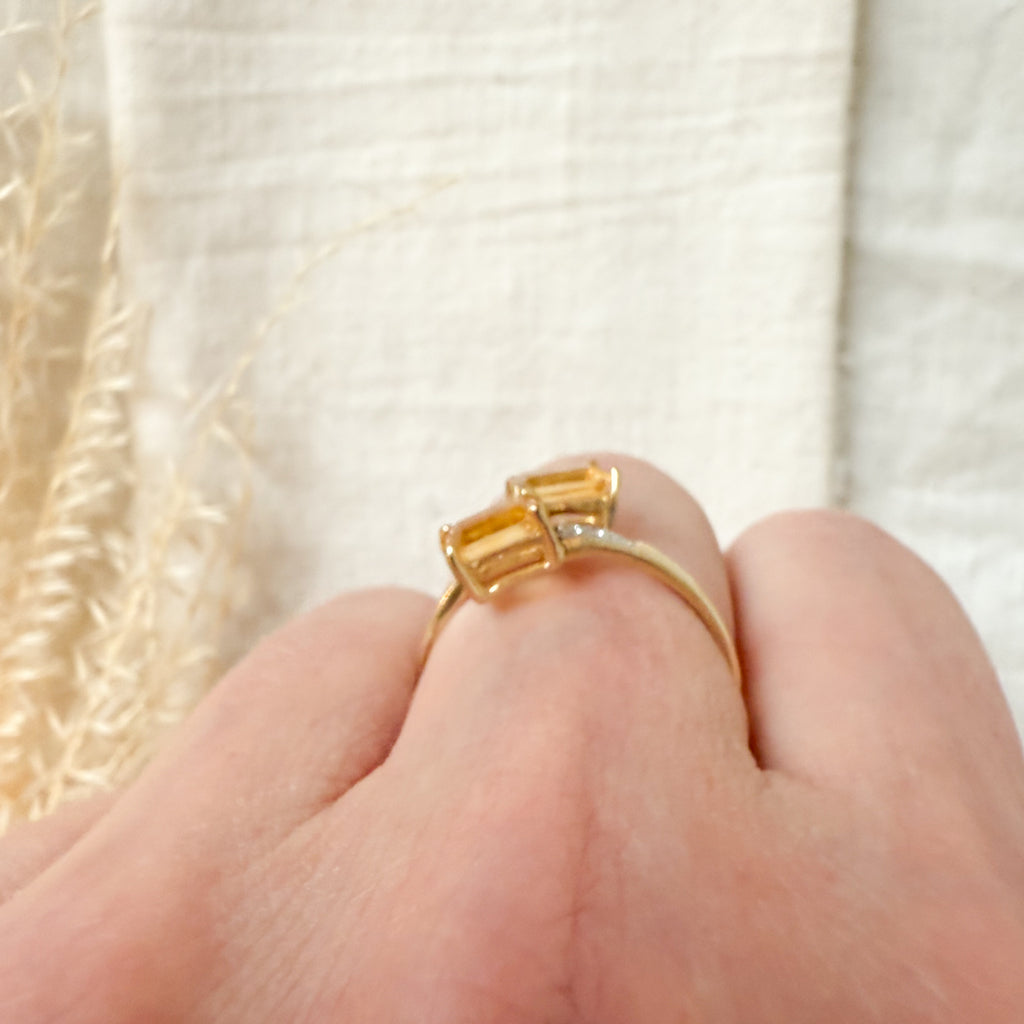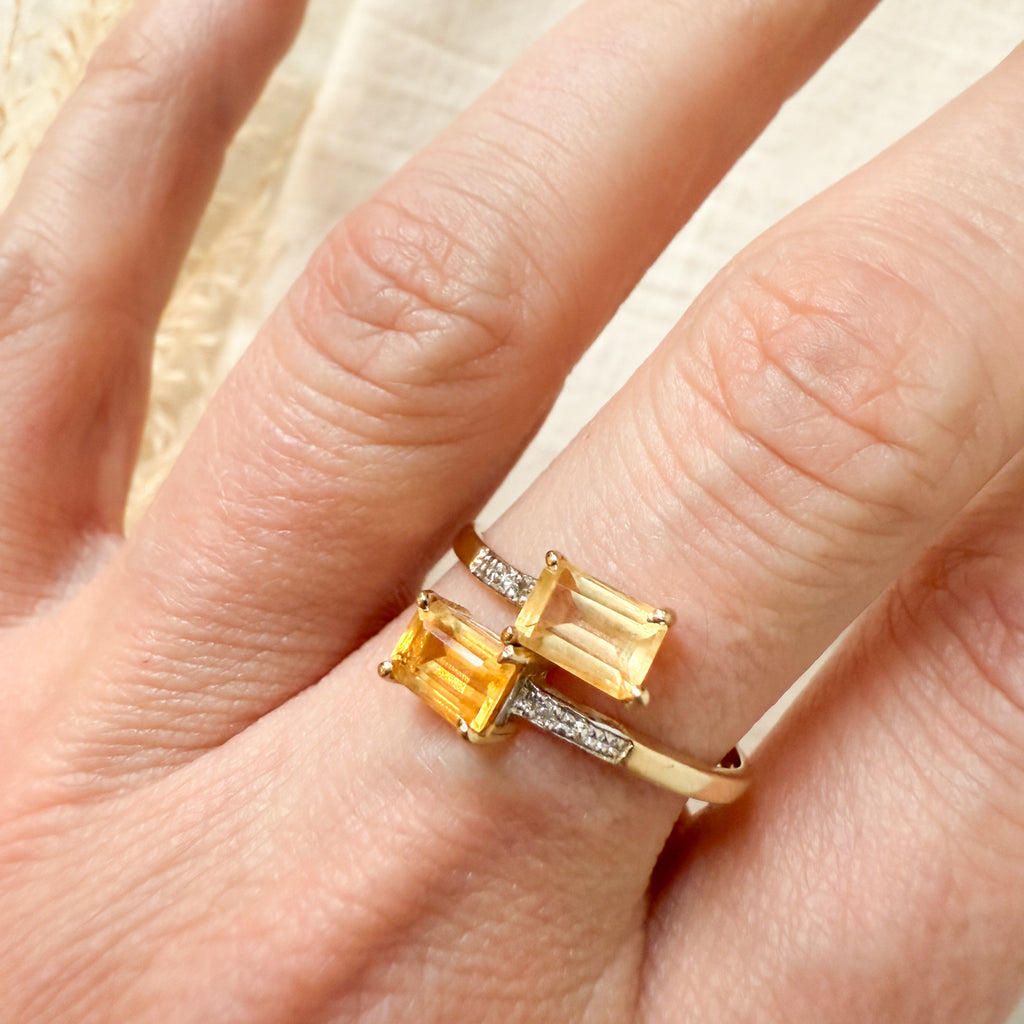 Set with two emerald cut natural gem topaz, 1.00 ct. estimated total weight. Light yellow orange in colour. The shoulders are bead set with 2 single cut diamonds 0.01 ct. The ring weighs 1.9 grams. Size 9