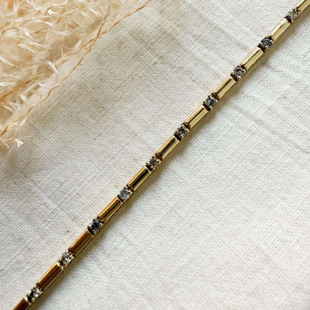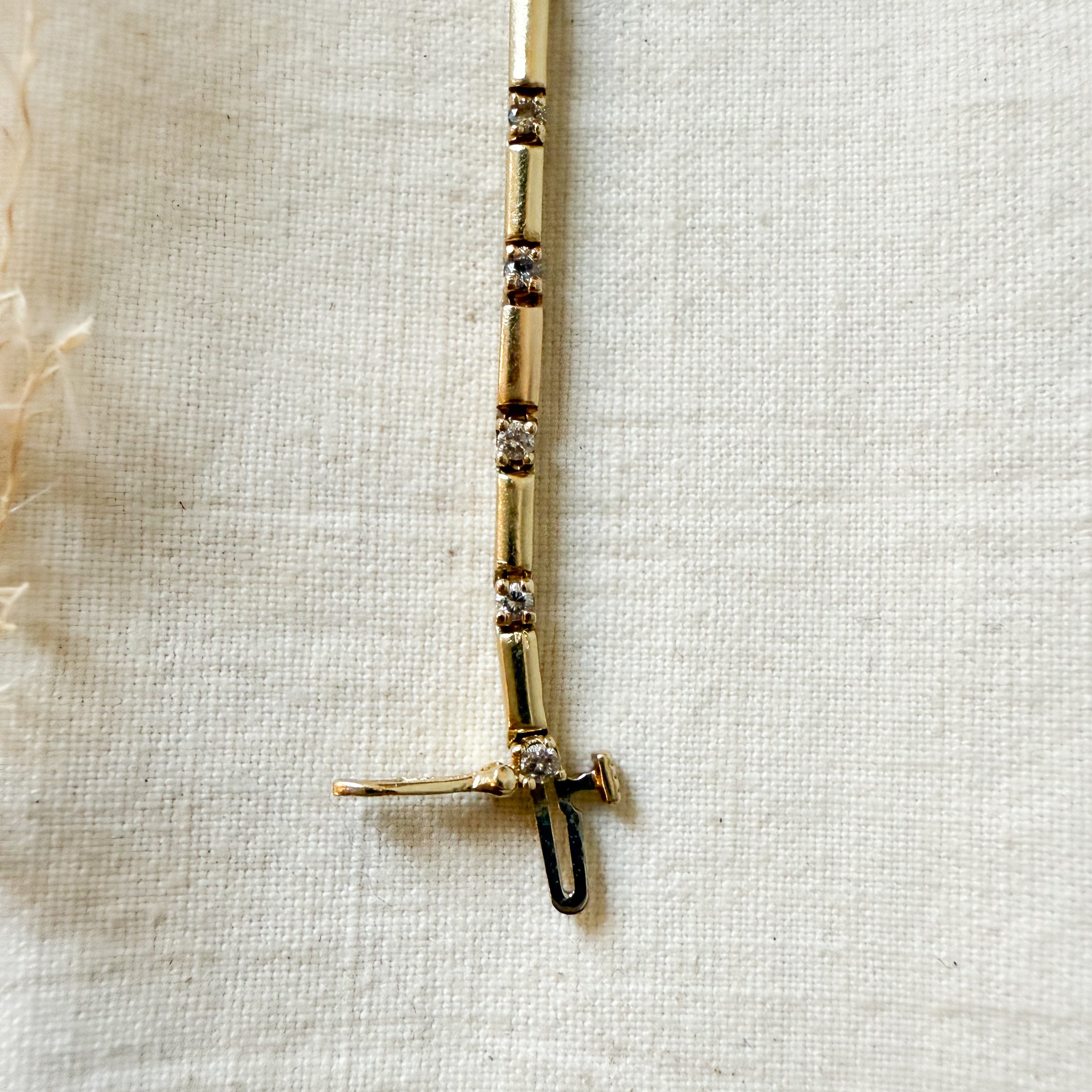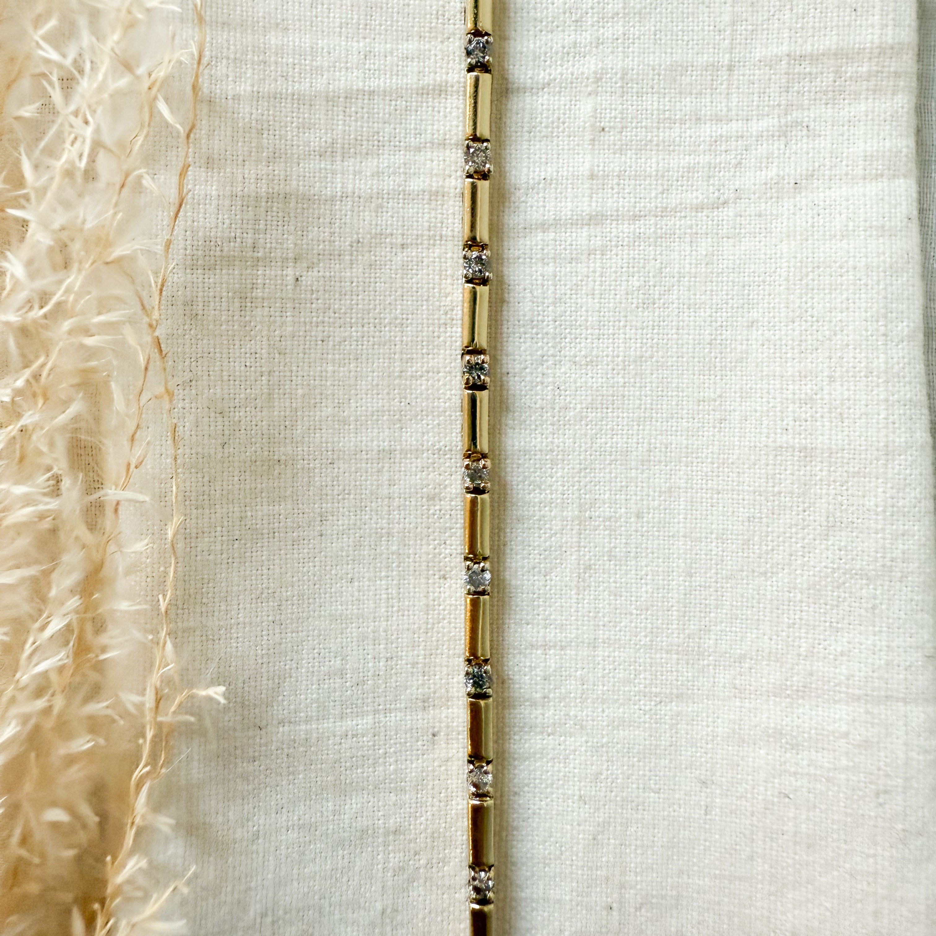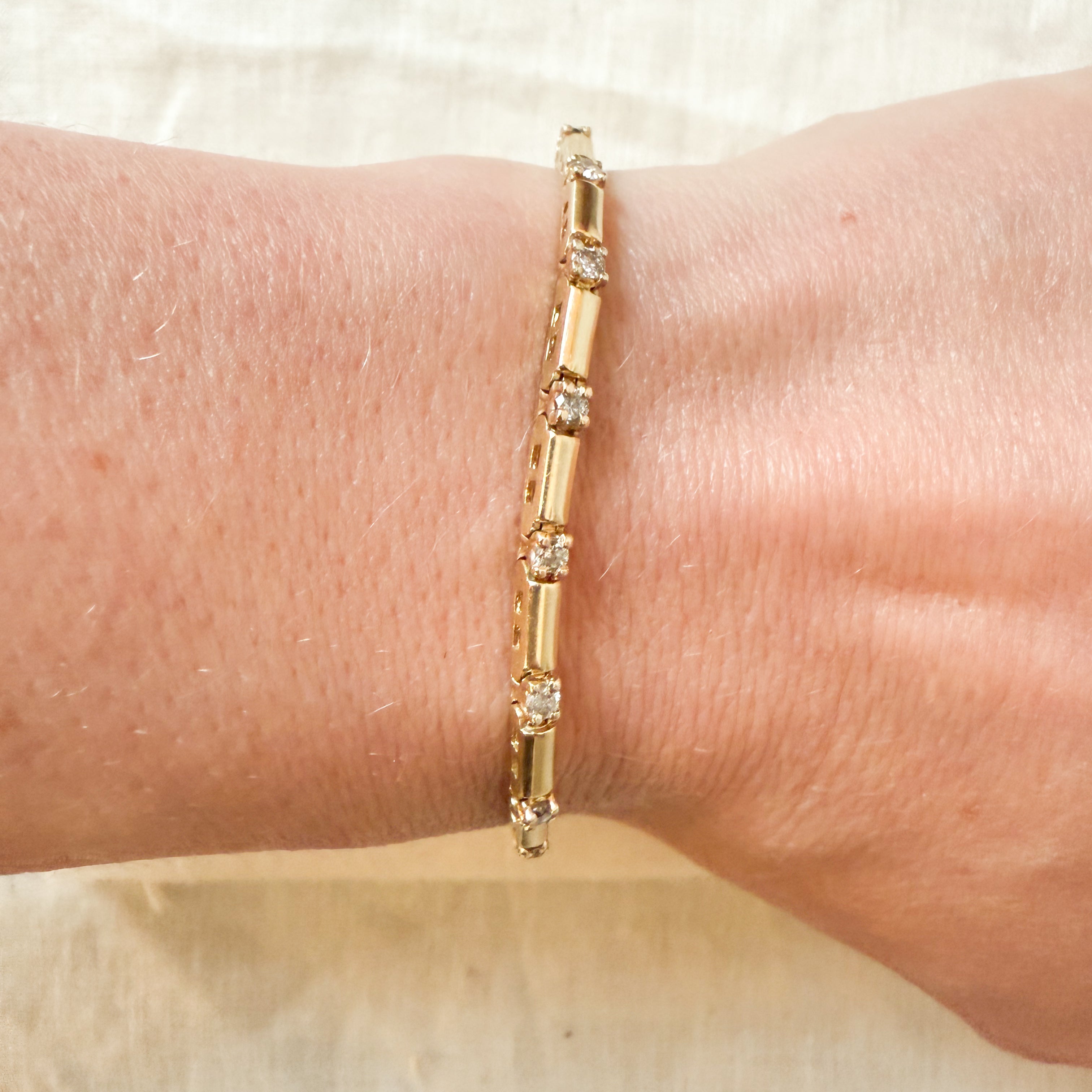 Claw set with 19 full cut diamonds 0.80 ct. estimated total weight, dividing criss cross links. The clarity/colour grade of the diamonds is SI-2-I-1/I-J. The bracelet measures 3.8 mm. wide, 7 inches long and weighing 6.5 grams. Push clasp with a figure eight safety.
