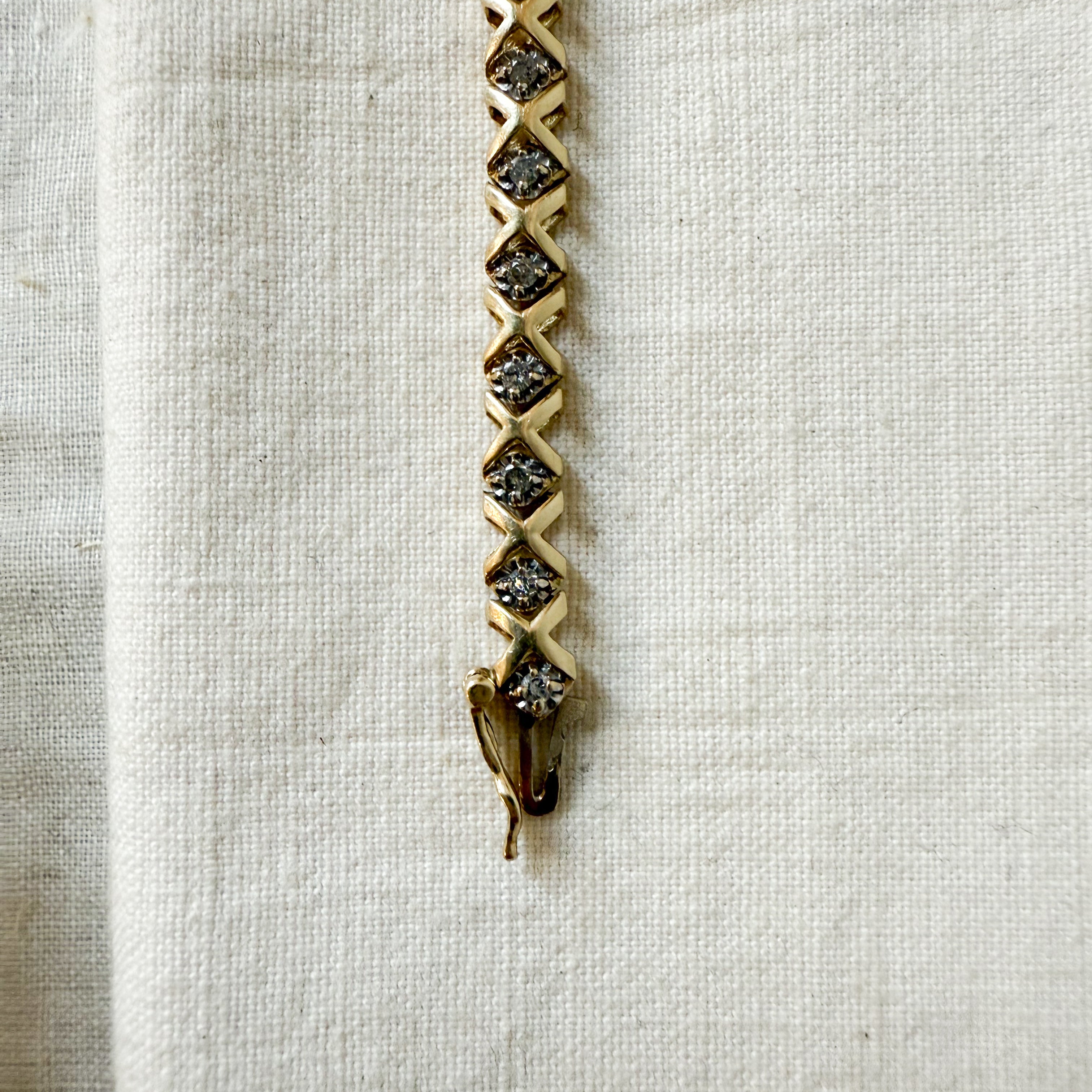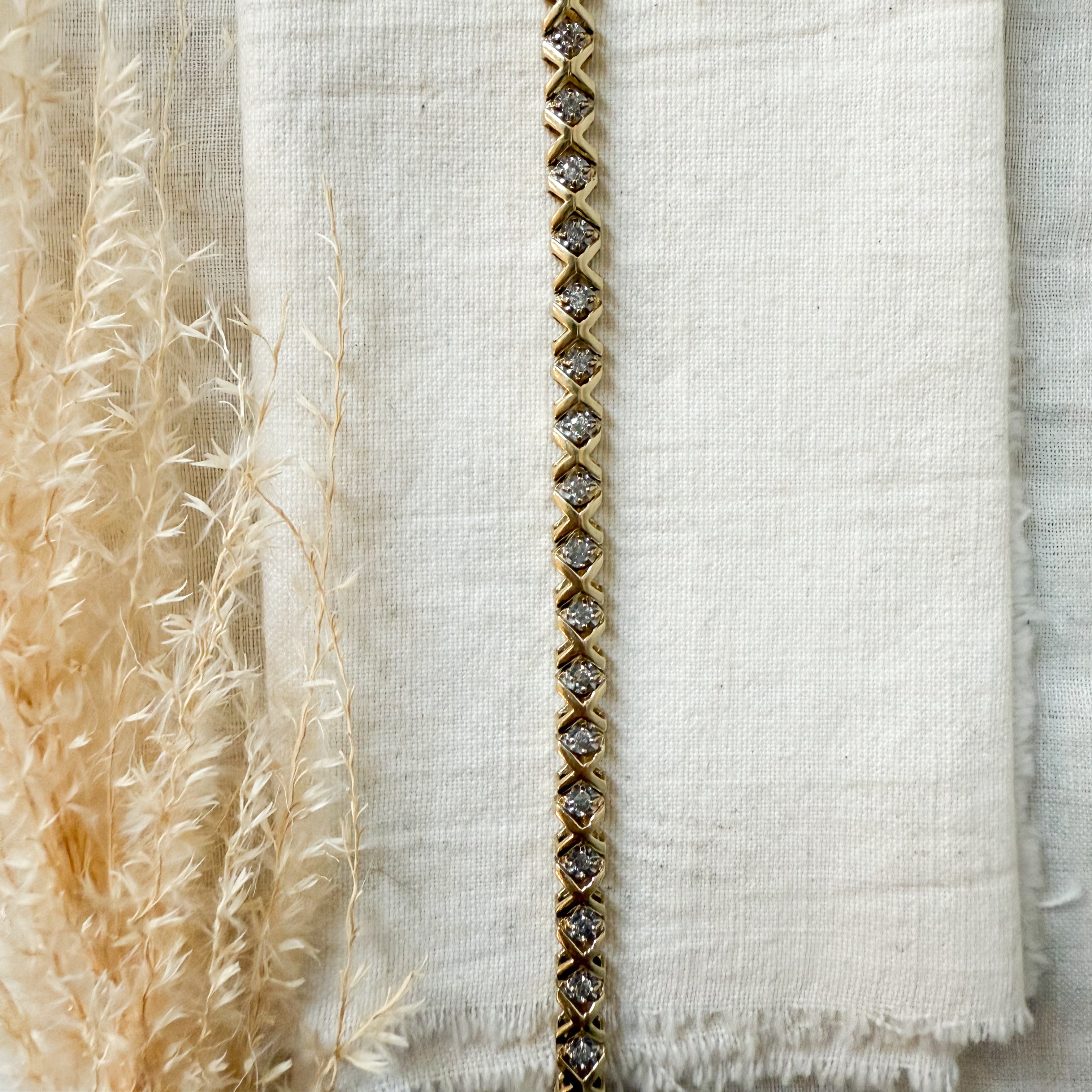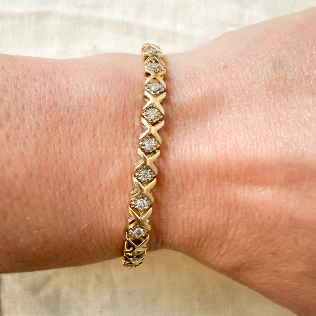 Claw set with 30 full cut diamonds 0.60 ct. estimated total weight, dividing criss cross links. The clarity/colour grade of the diamonds is SI-2-I-1/I-J. The bracelet measures 5.2 mm. wide, 7 inches long and weighing 10.6 grams. Push clasp with a figure eight safety.