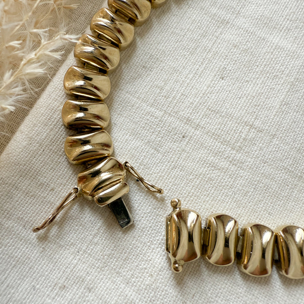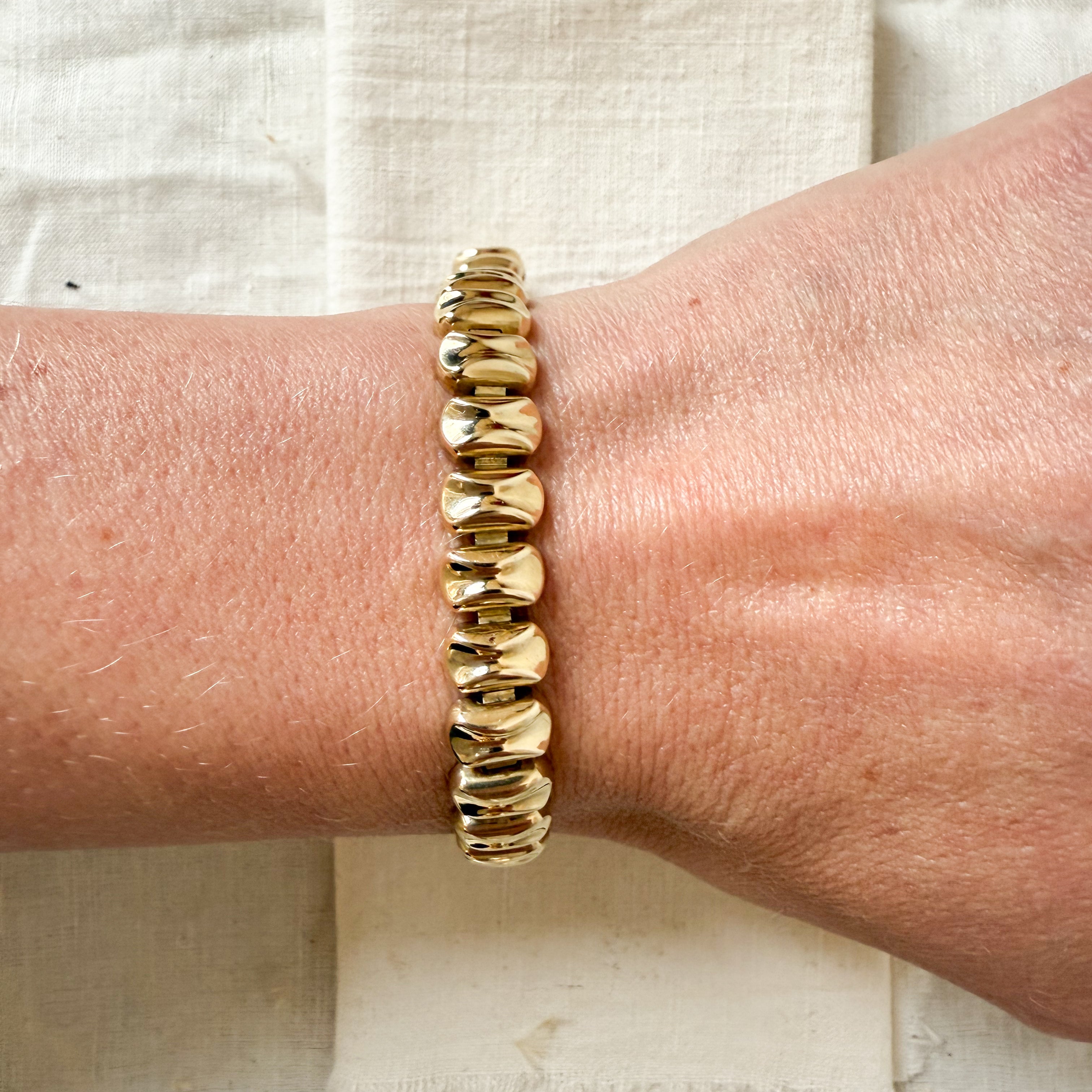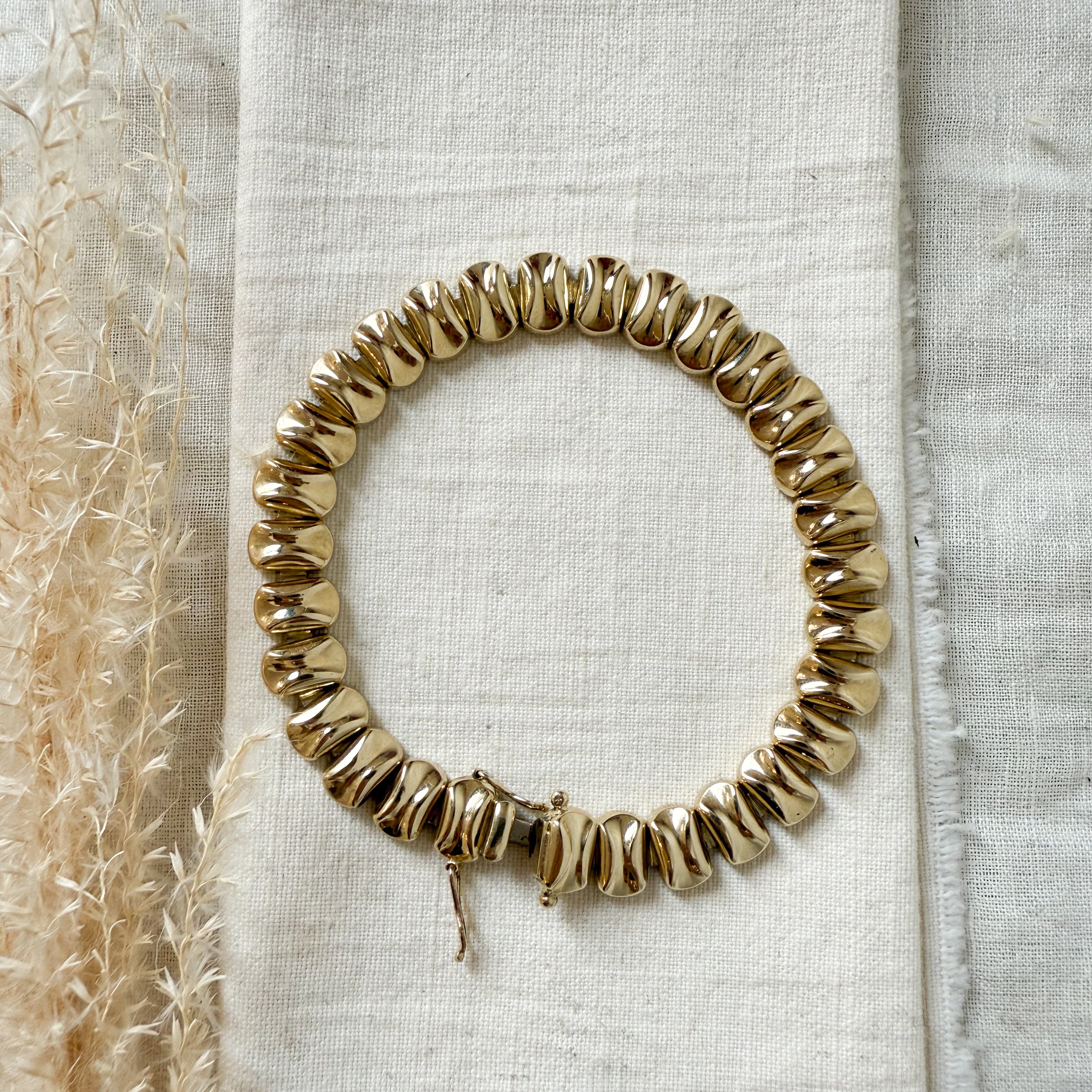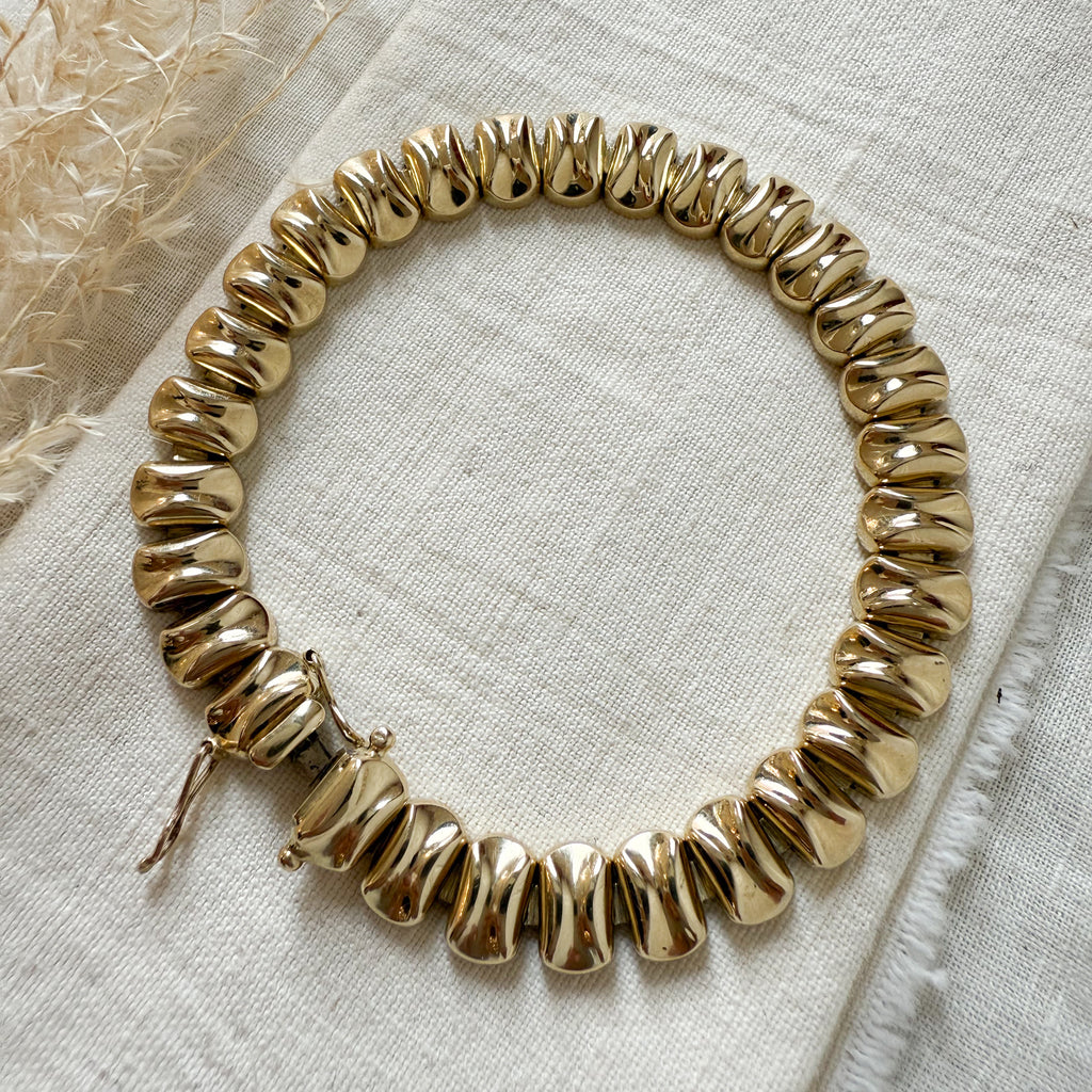 The bracelet is 1 cm. wide, hollow links. The bracelet is 7.5 inches long and weighs 15.3 grams.