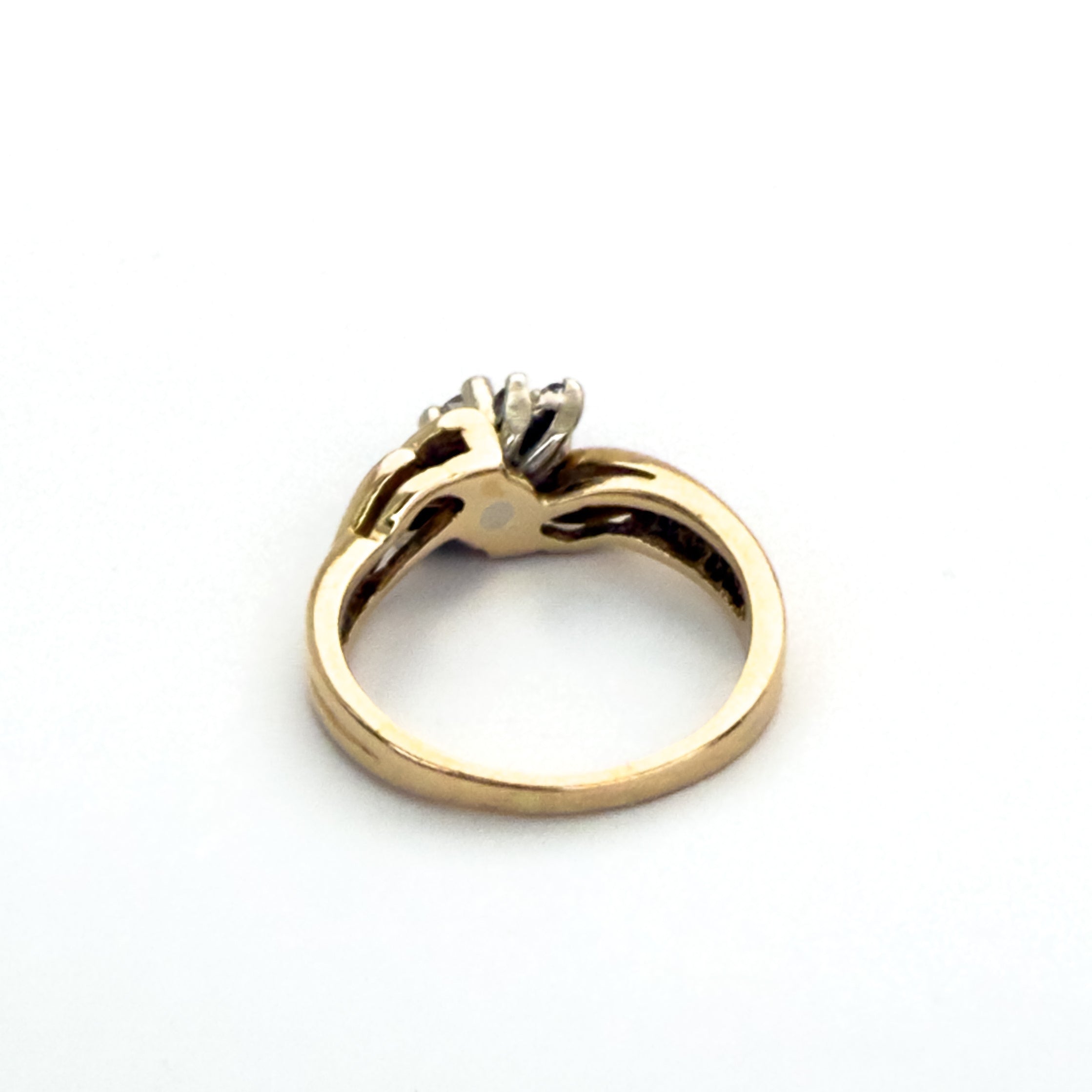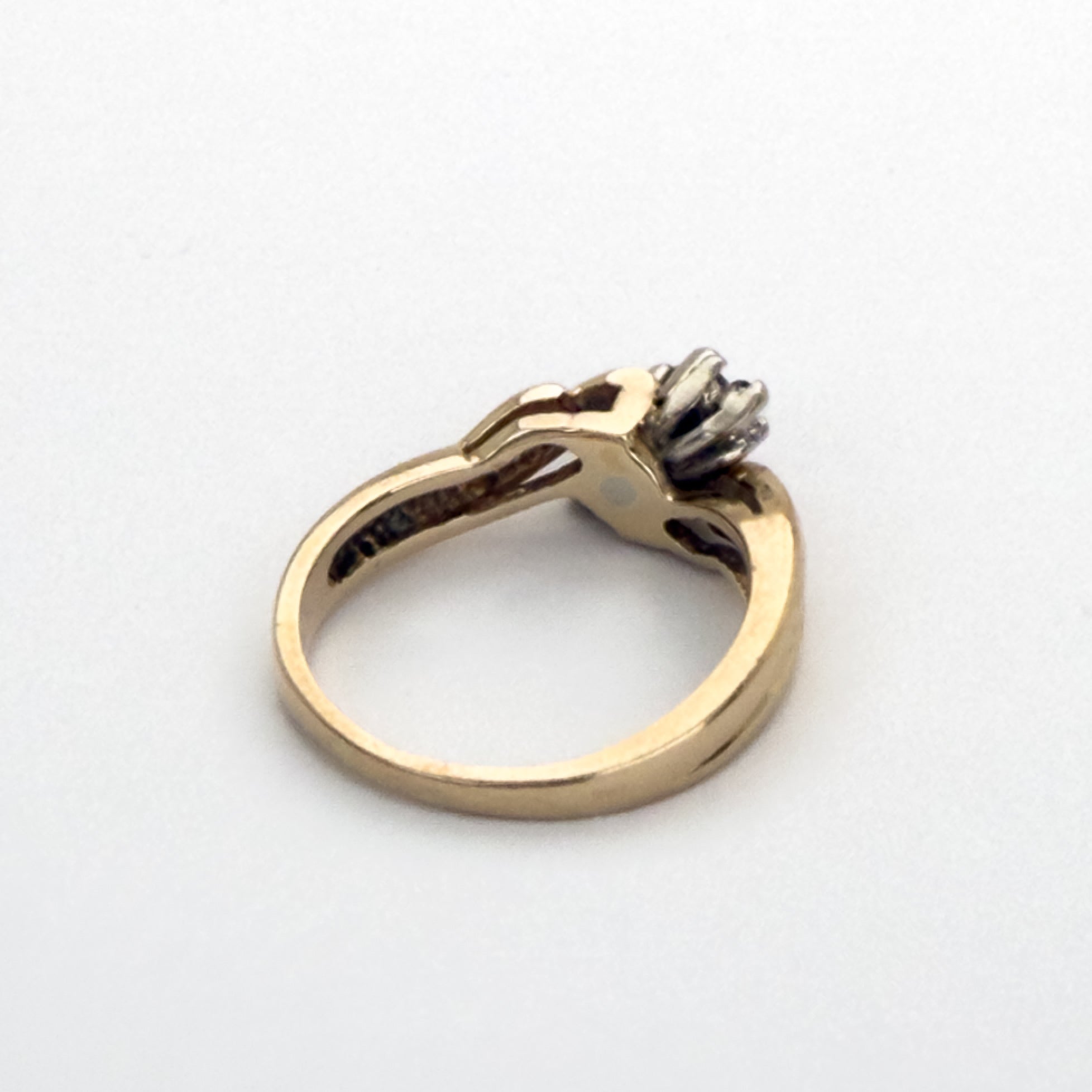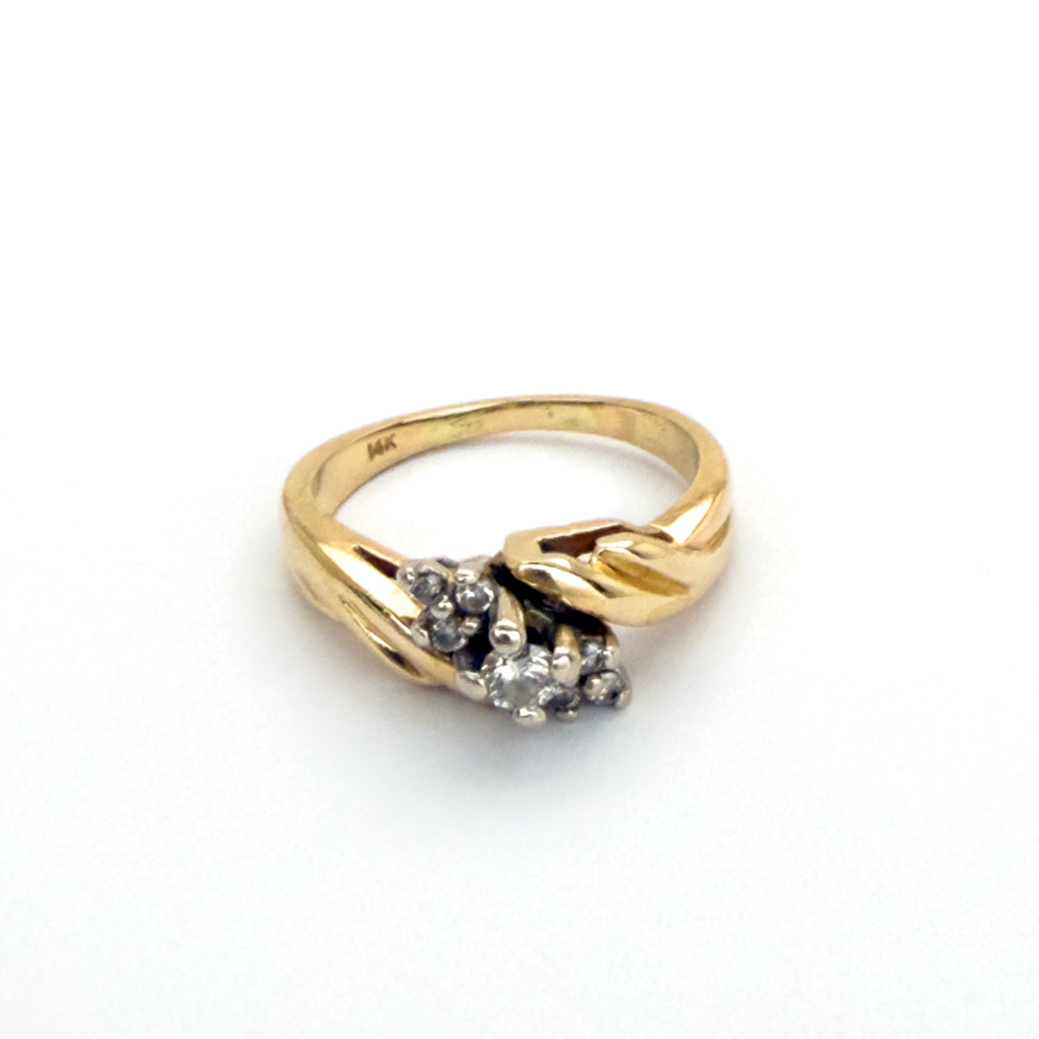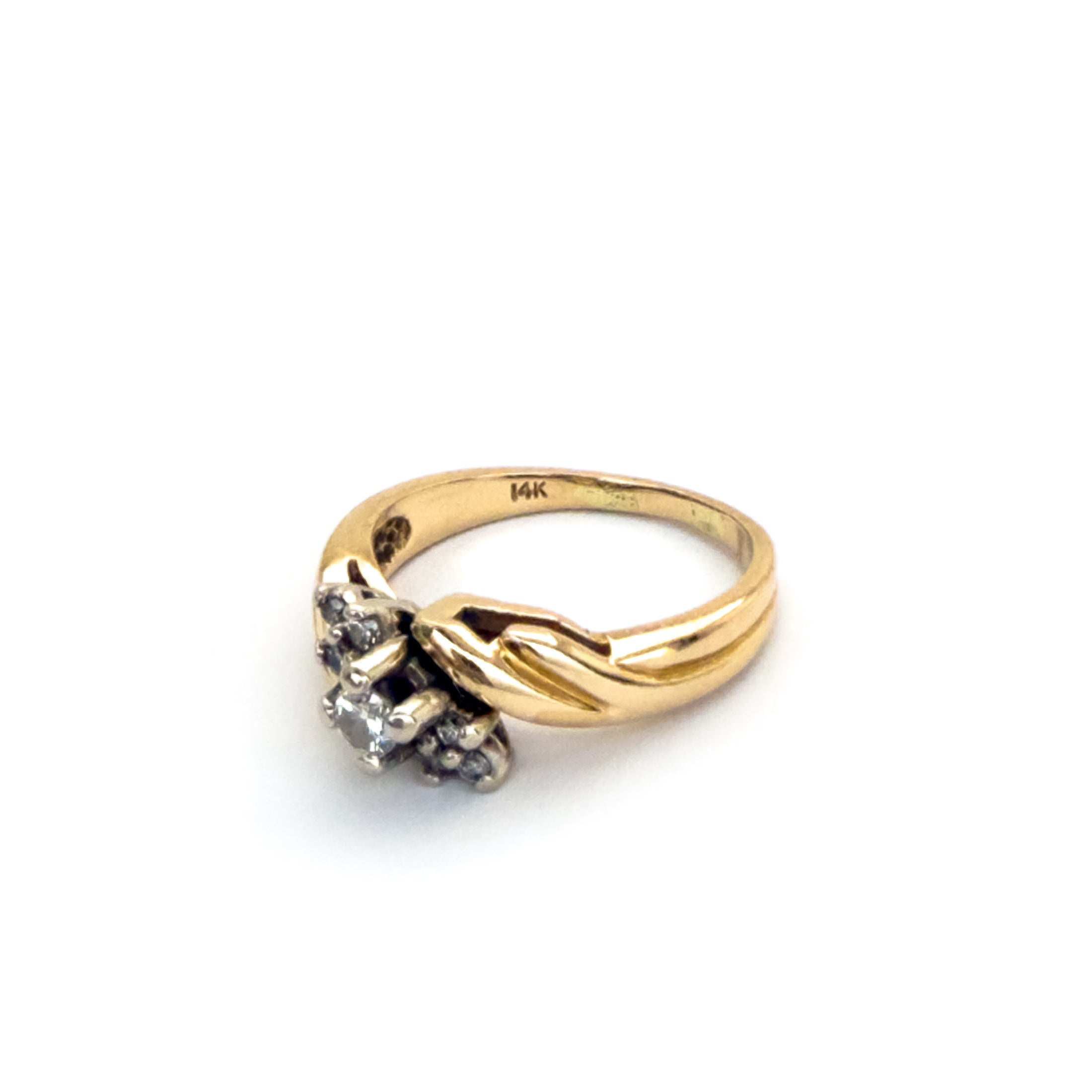 • The ring is off set with a round brilliant cut centre diamond 0.10 ct. and 6 full cut diamonds 0.10 ct. estimated total weight. The clarity/colour grade of the diamonds is SI-1/H-I with good proportion and finish.