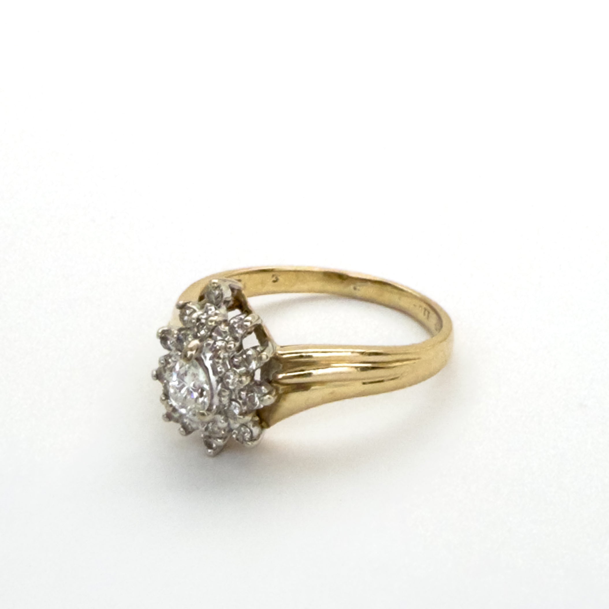 • Circa 1980, claw set with a 5 x 2.30 mm. pear shape diamond 0.23 ct. estimated weight. There are 19 full cut diamonds 0.015 ct. each, 0.28 ct. total estimated weight. The clarity/colour grade is VS-2-SI-2-I-1/G-H-I.