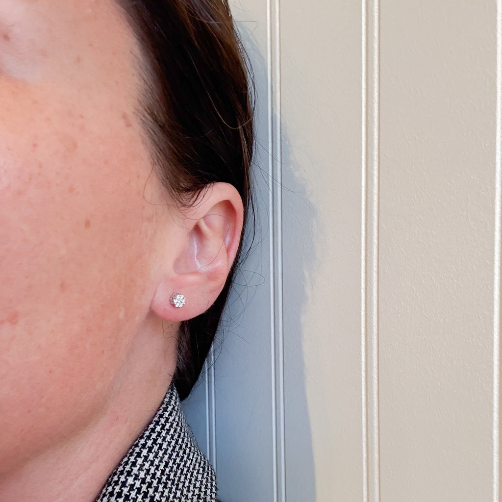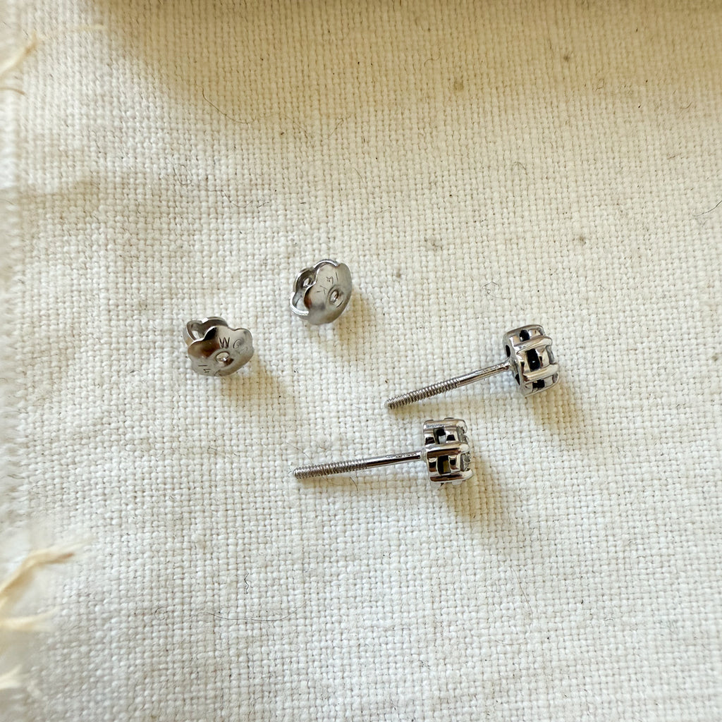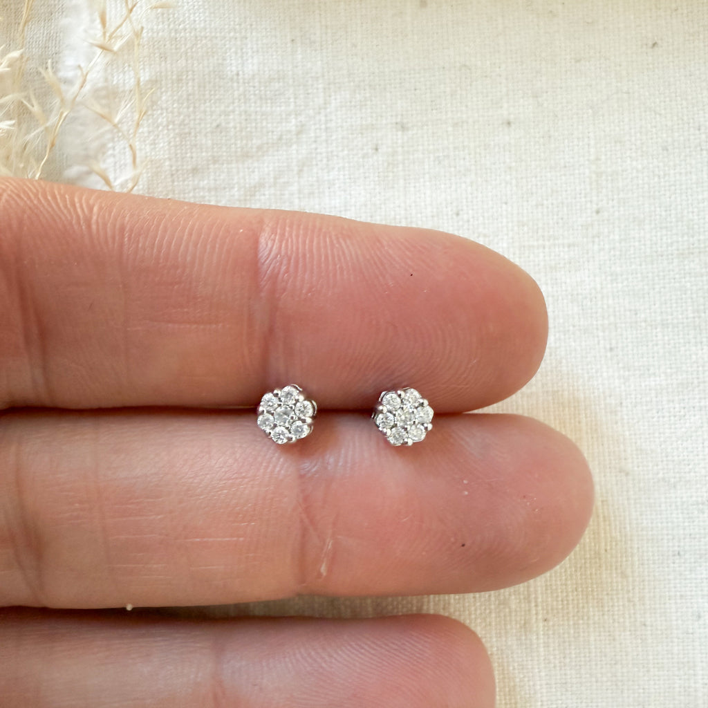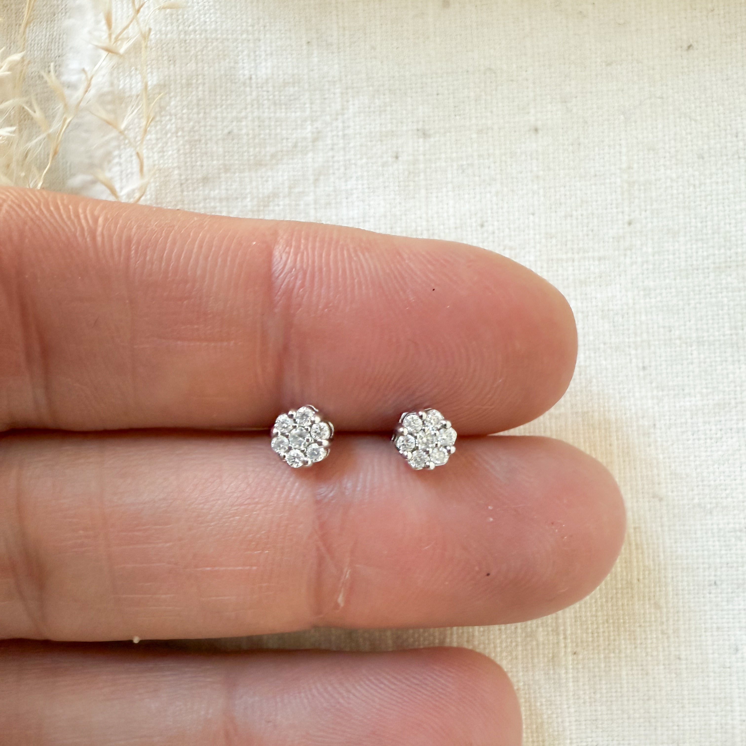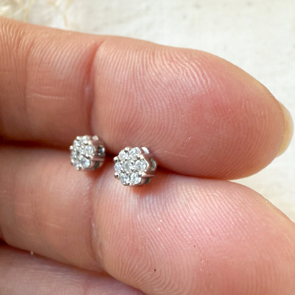 Each earring is claw set with 7 full cut diamonds 0.22 ct. estimated total weight. The clarity/colour grade is I-1/H-I with medium proportion and finish. The earrings measure 5 mm on top. Pierced screw backs weighing 1 gram.