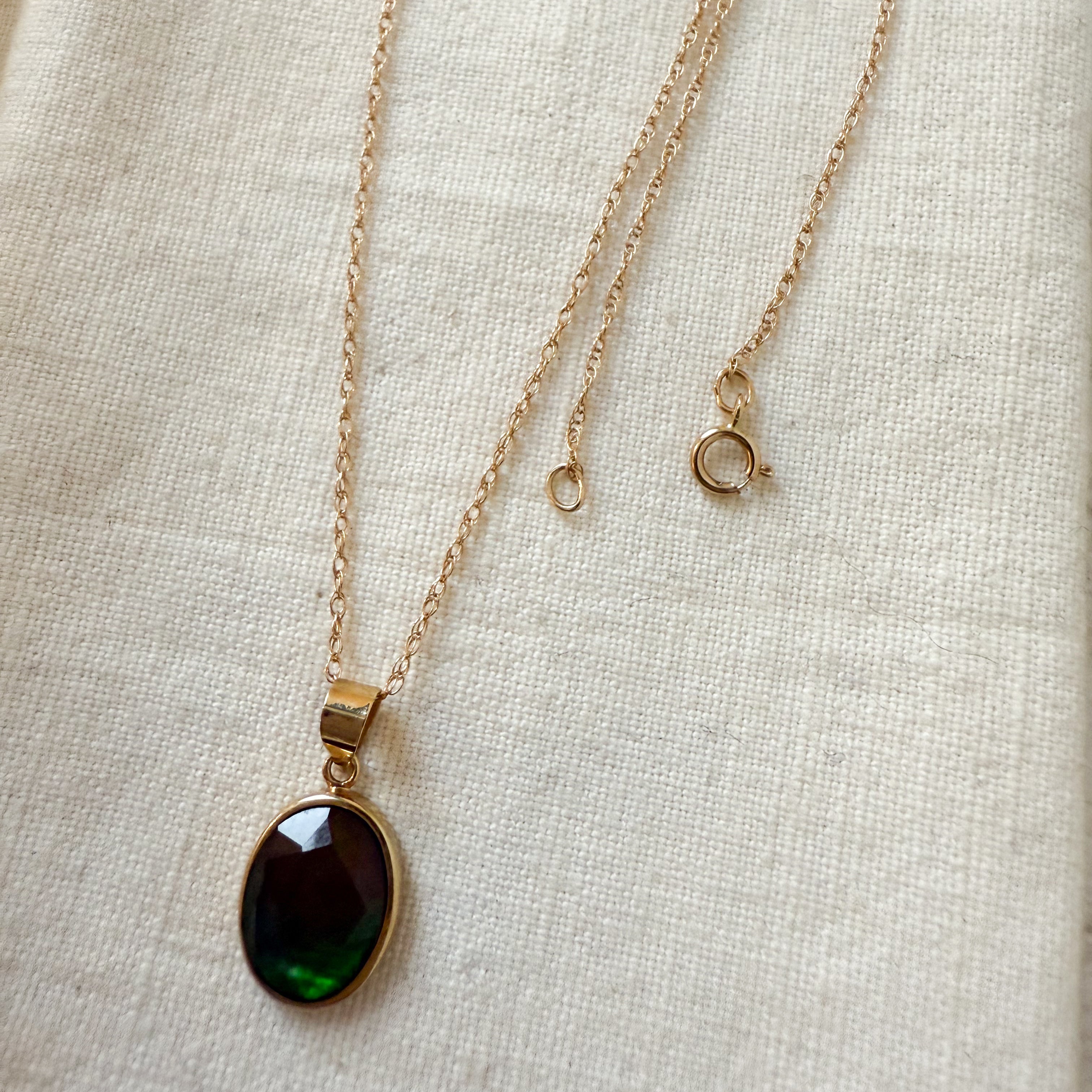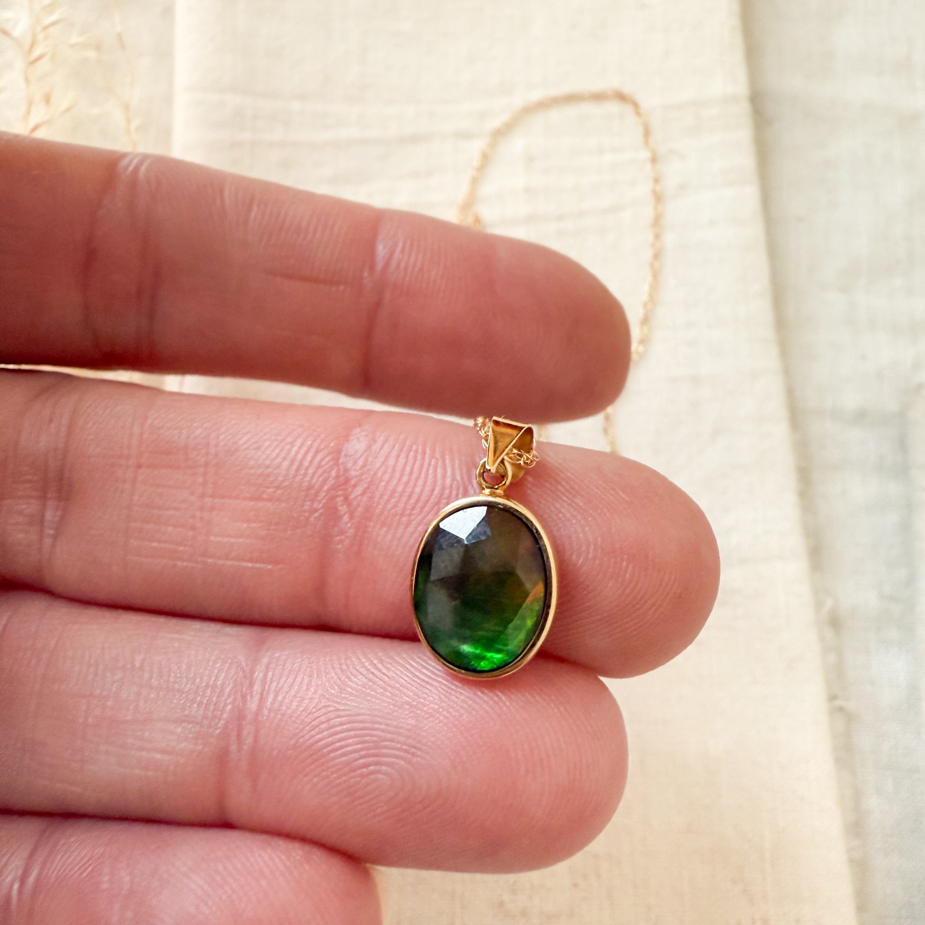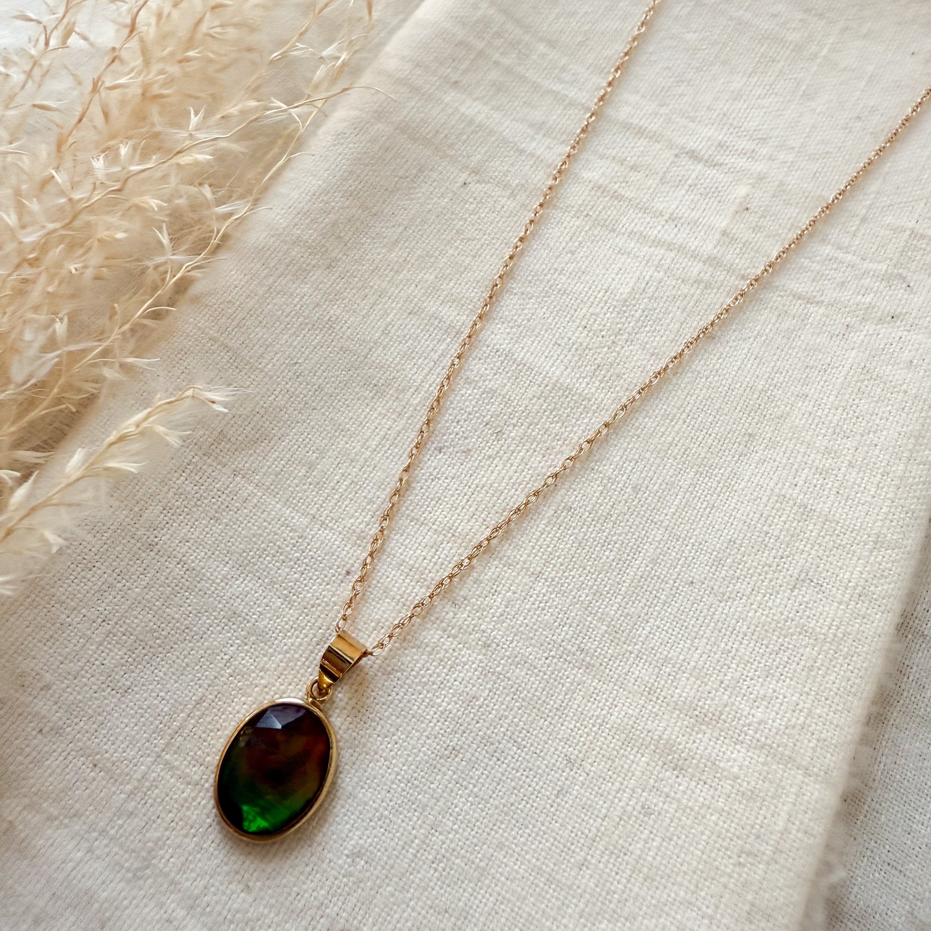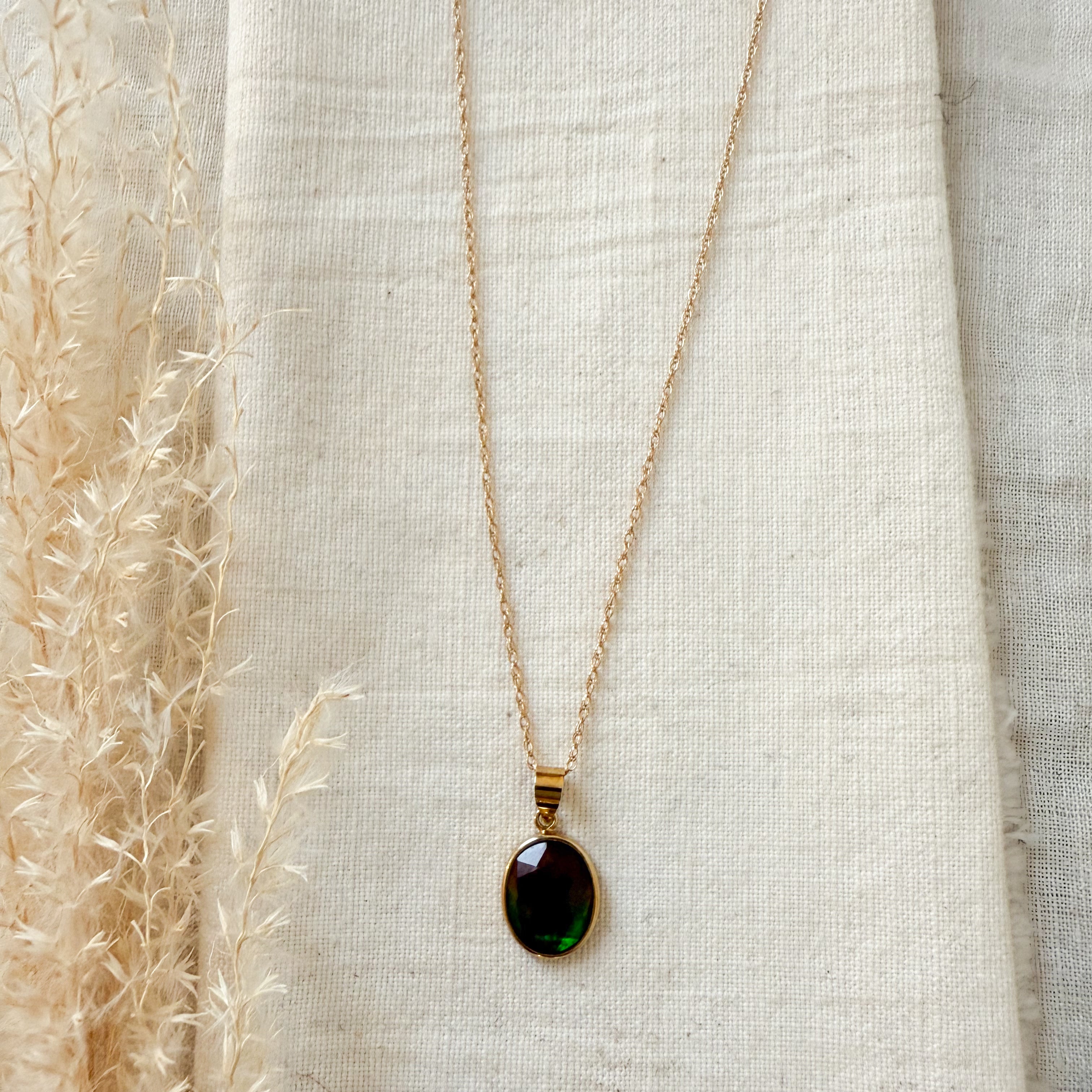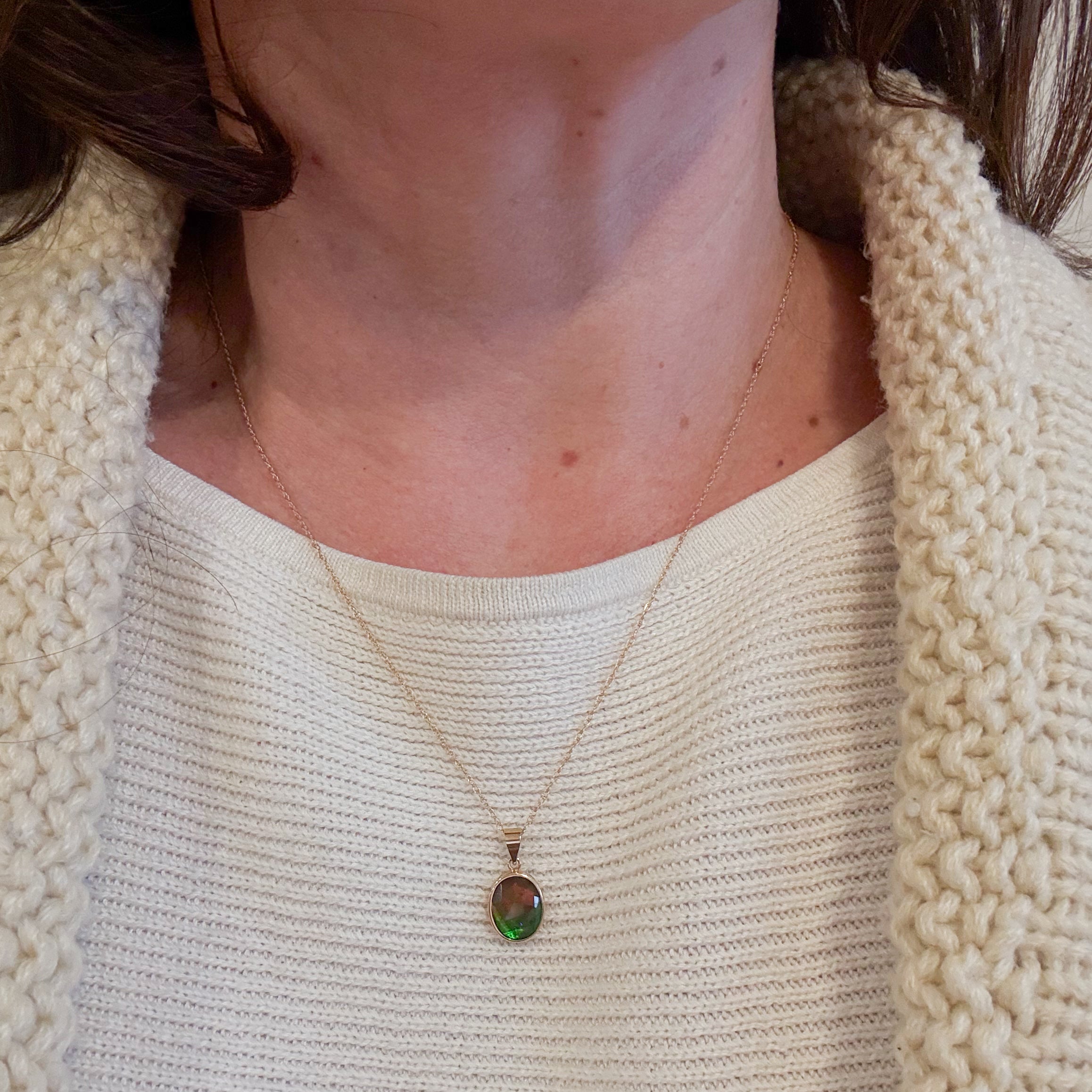 Bezel set with an oval faceted top ammolite measuring 10 x 8 mm. included with an 18 inch fine rope chain weighing 1.5 grams.