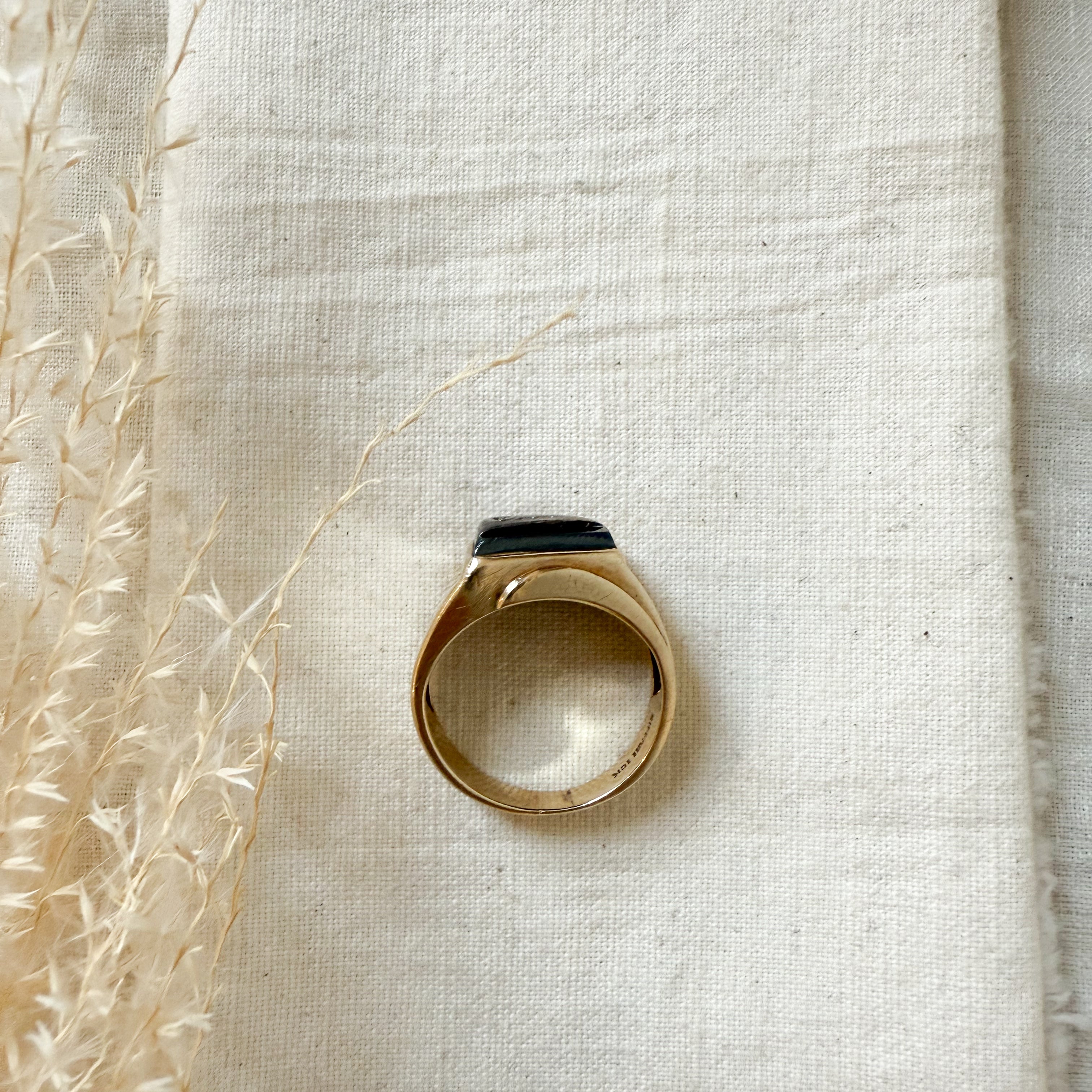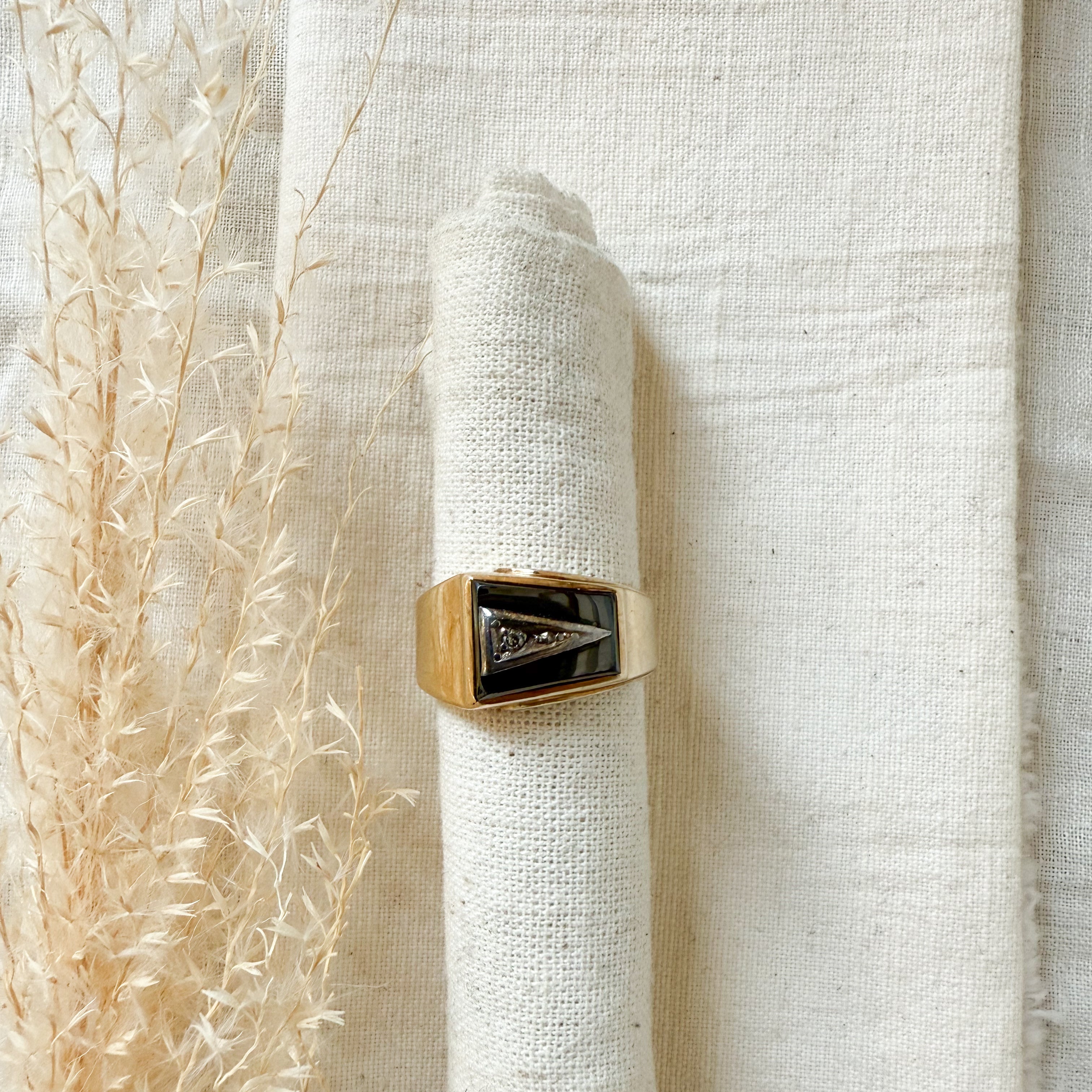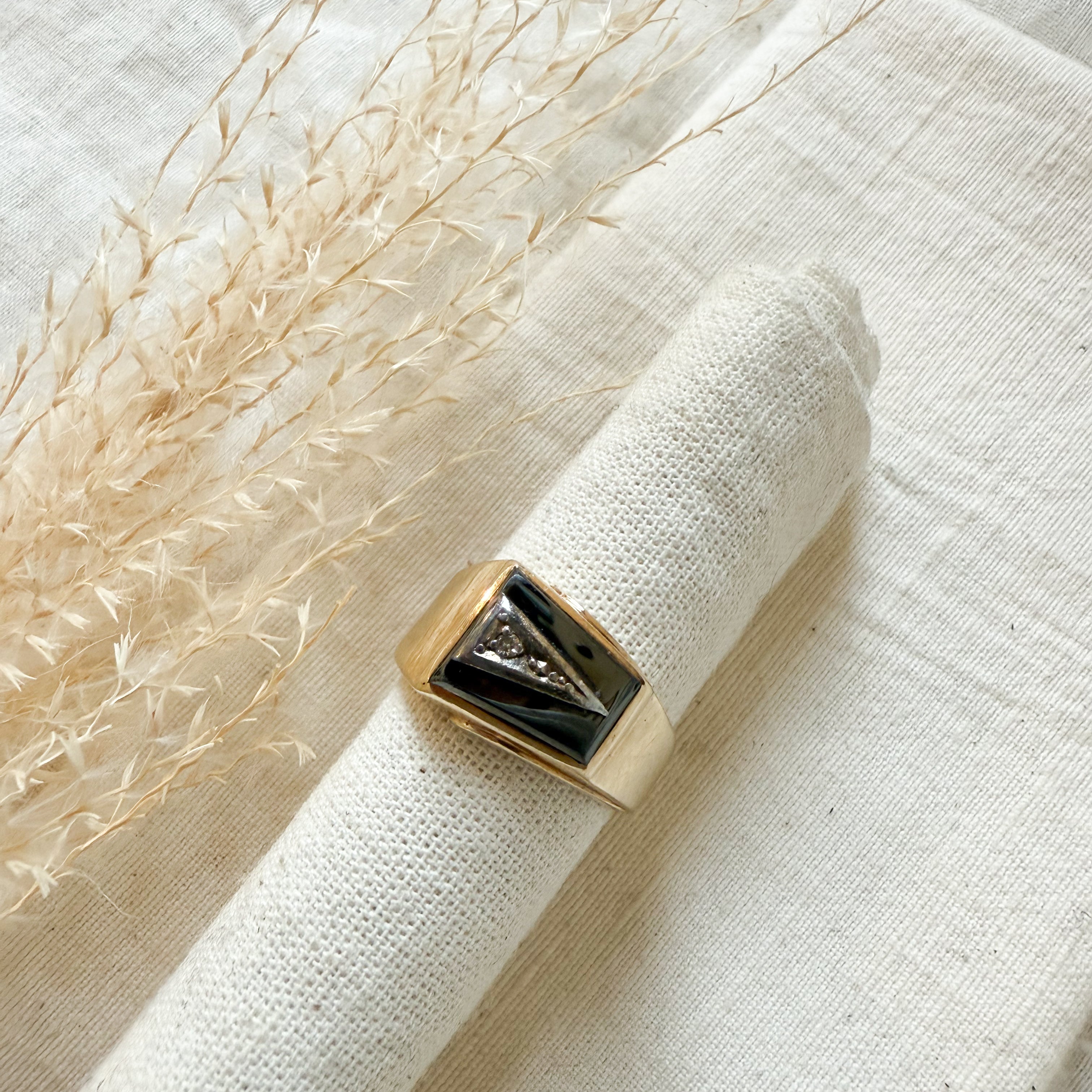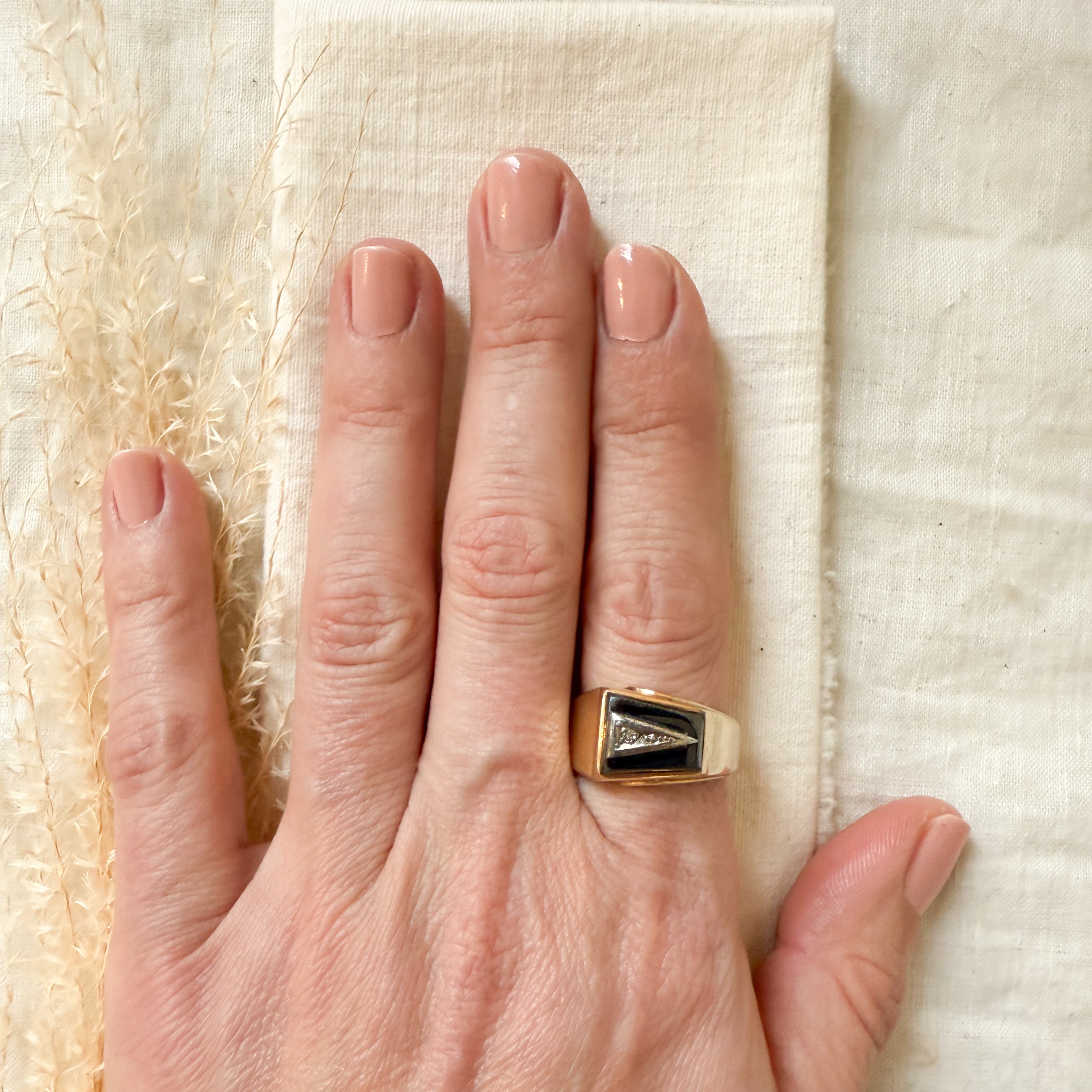 Bead set with angled black onyx and diamond ring, set with a 10 x 8 mm. black onyx and a 0.01 ct. single cut diamond. The ring weighs 5.8 grams. Size 8 3/4.