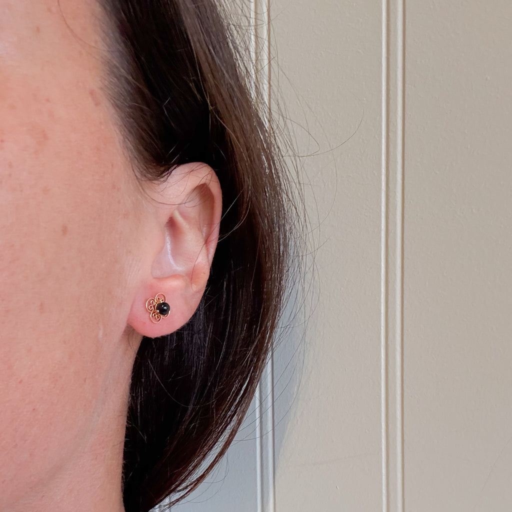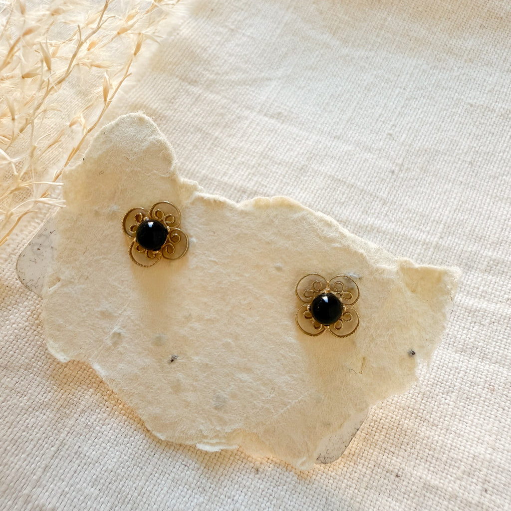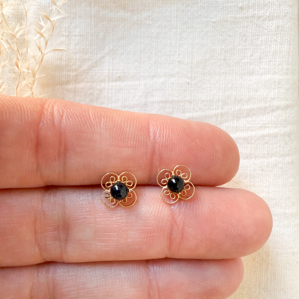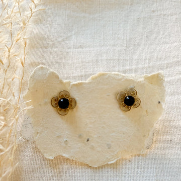 Set with a 2.6 mm. black onyx bead filigree borders 5 mm with pierced friction backs weighing .8 grams.