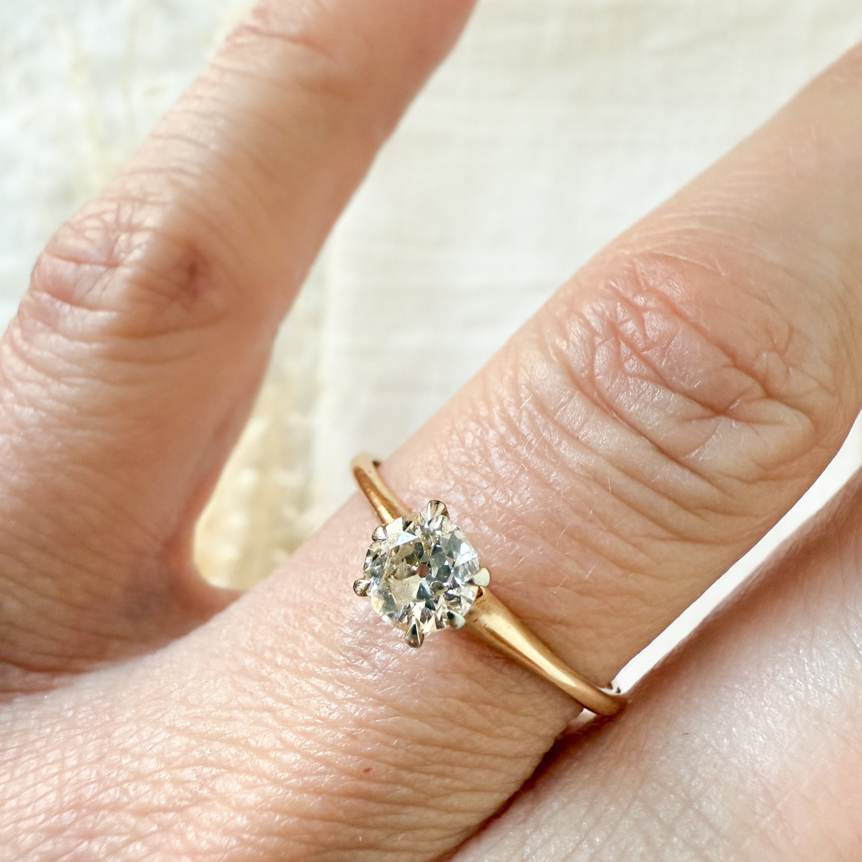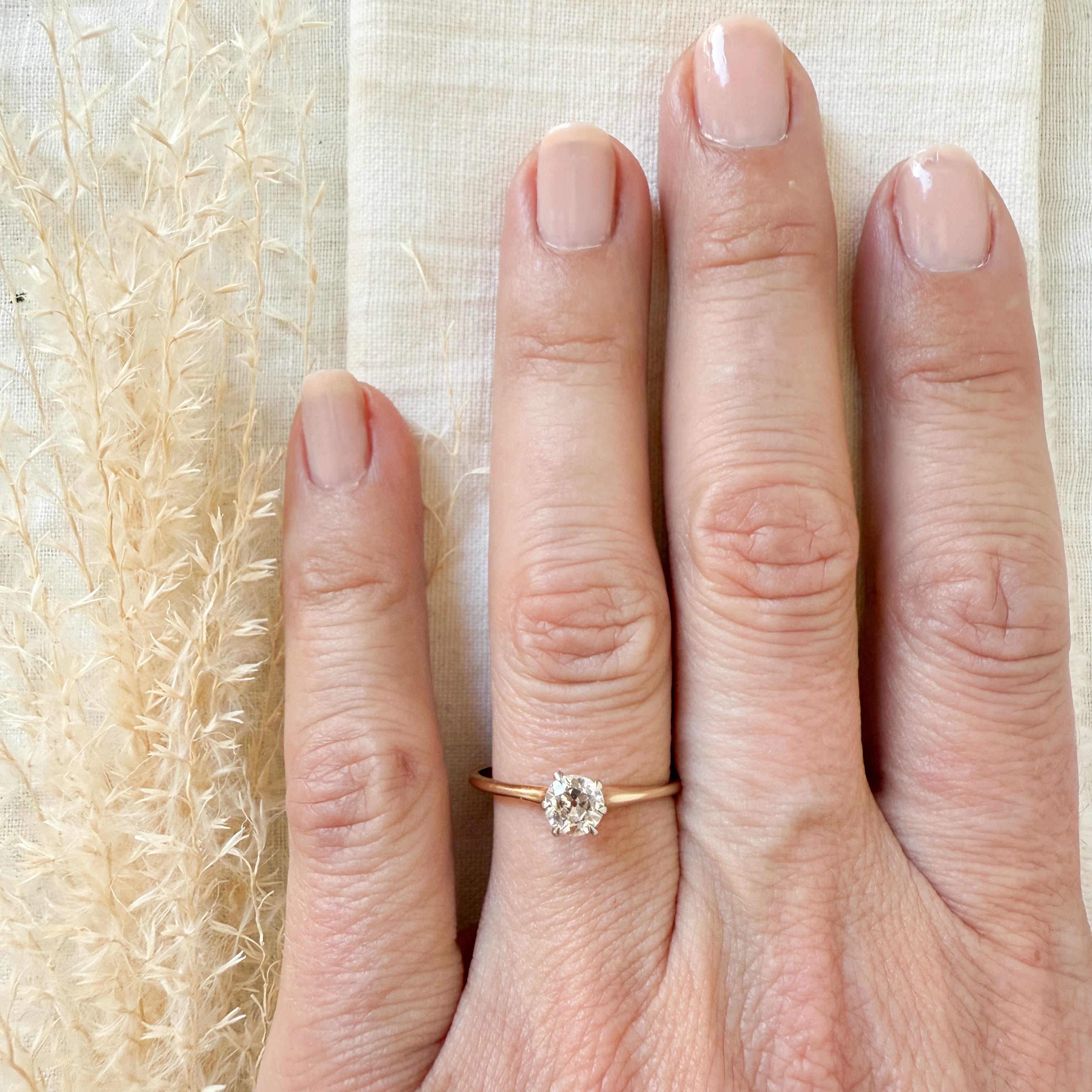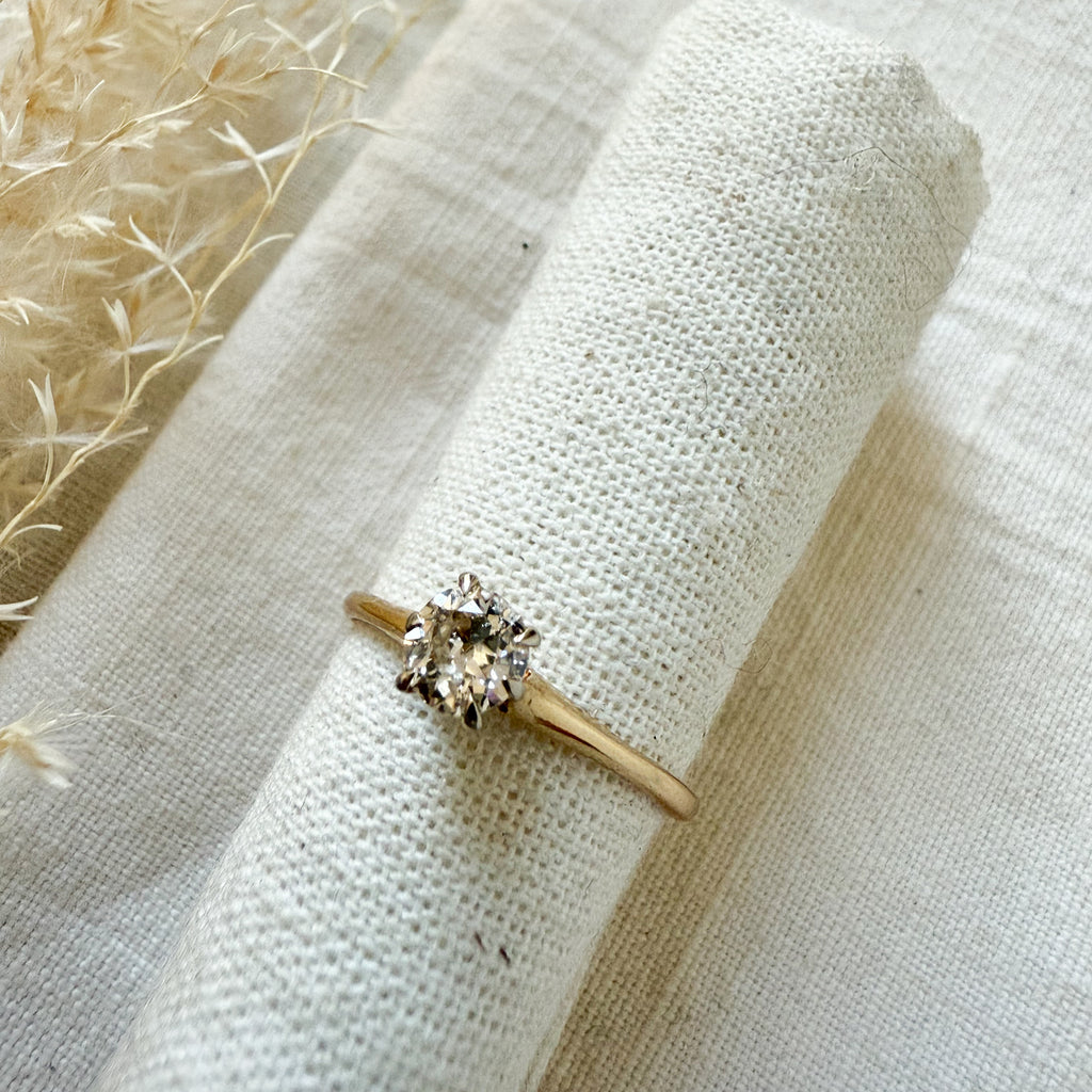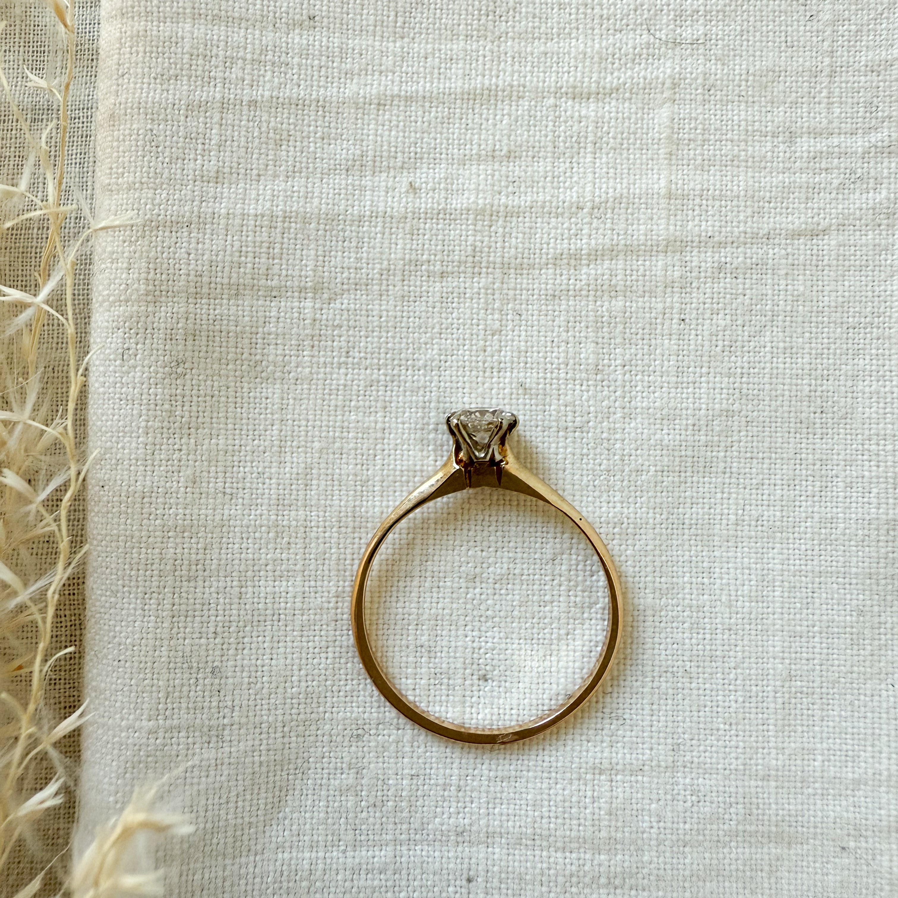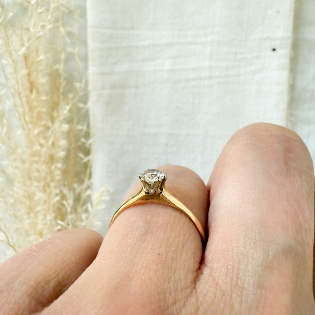 Claw set with an old European cut diamond 0.38 ct. Clarity/colour grade of the diamonds is SI-2/I-J, fair to medium proportion and finish . The diamond has some girdle chips. Size 8. The ring weighs 1.4 grams.