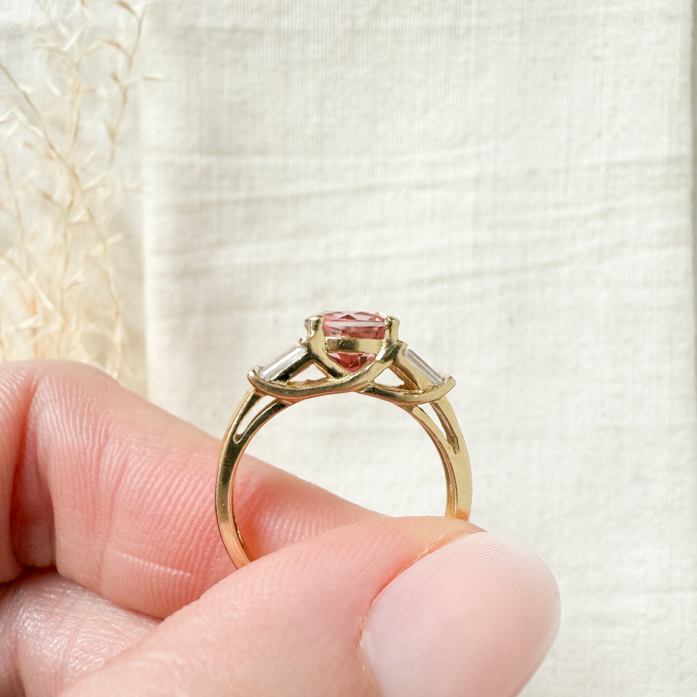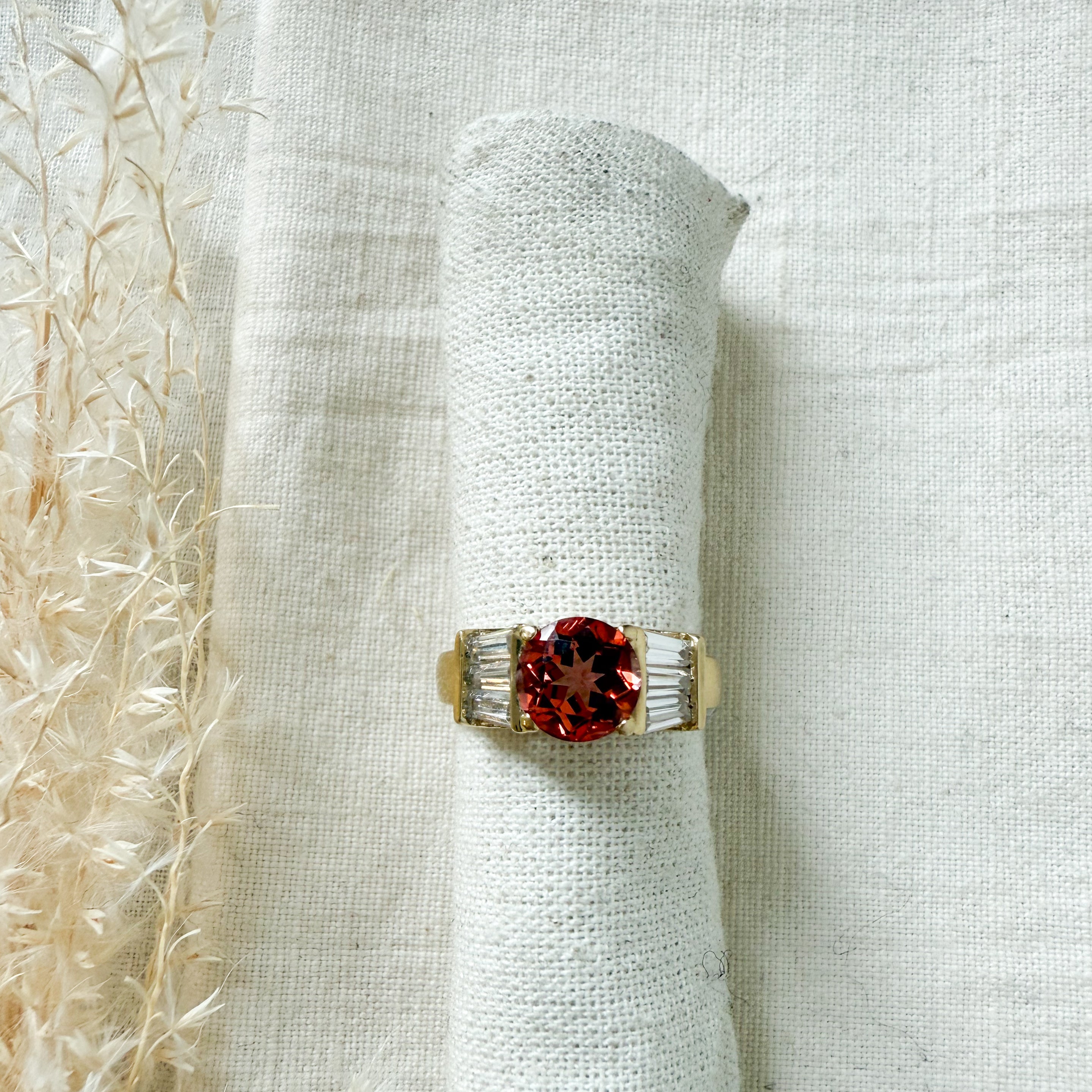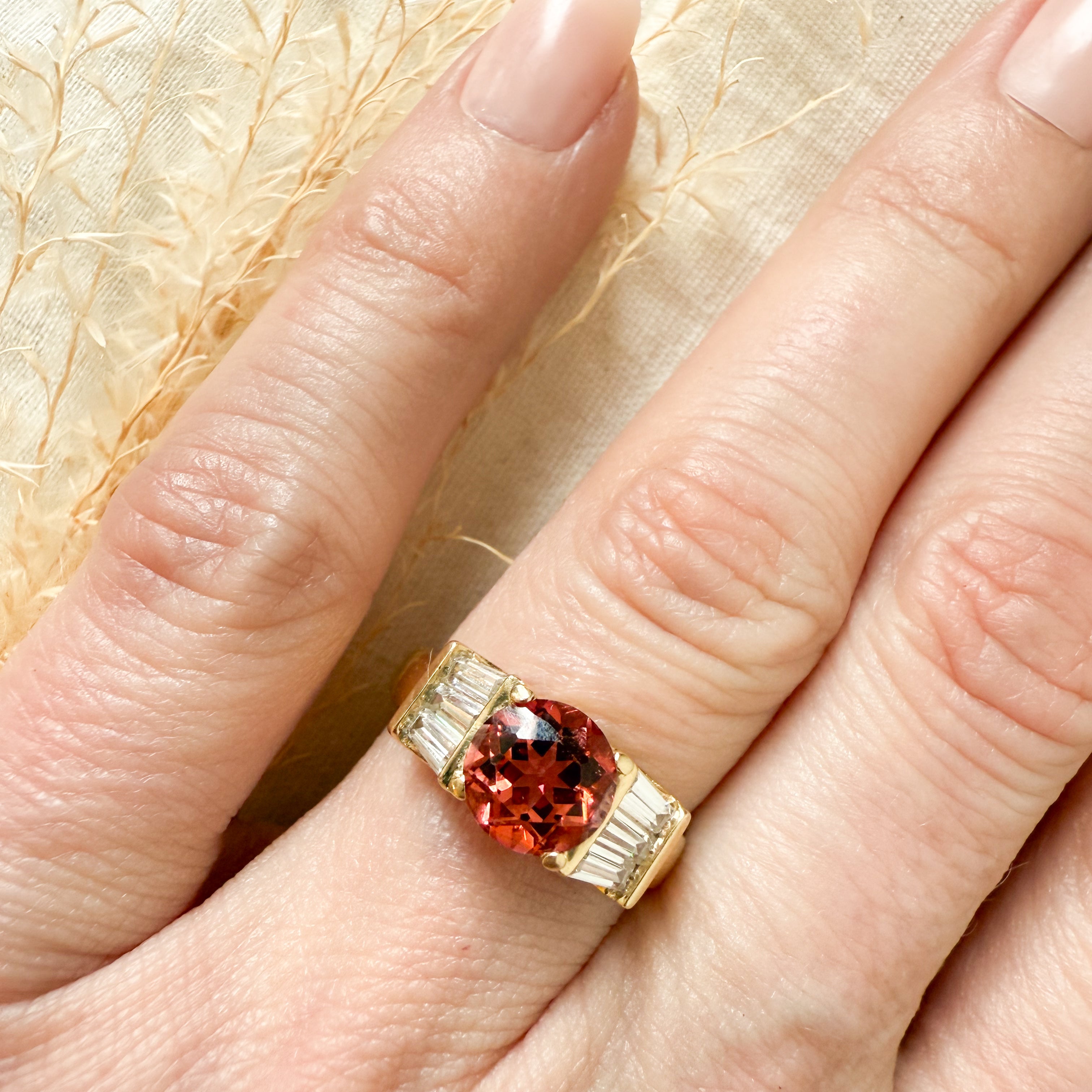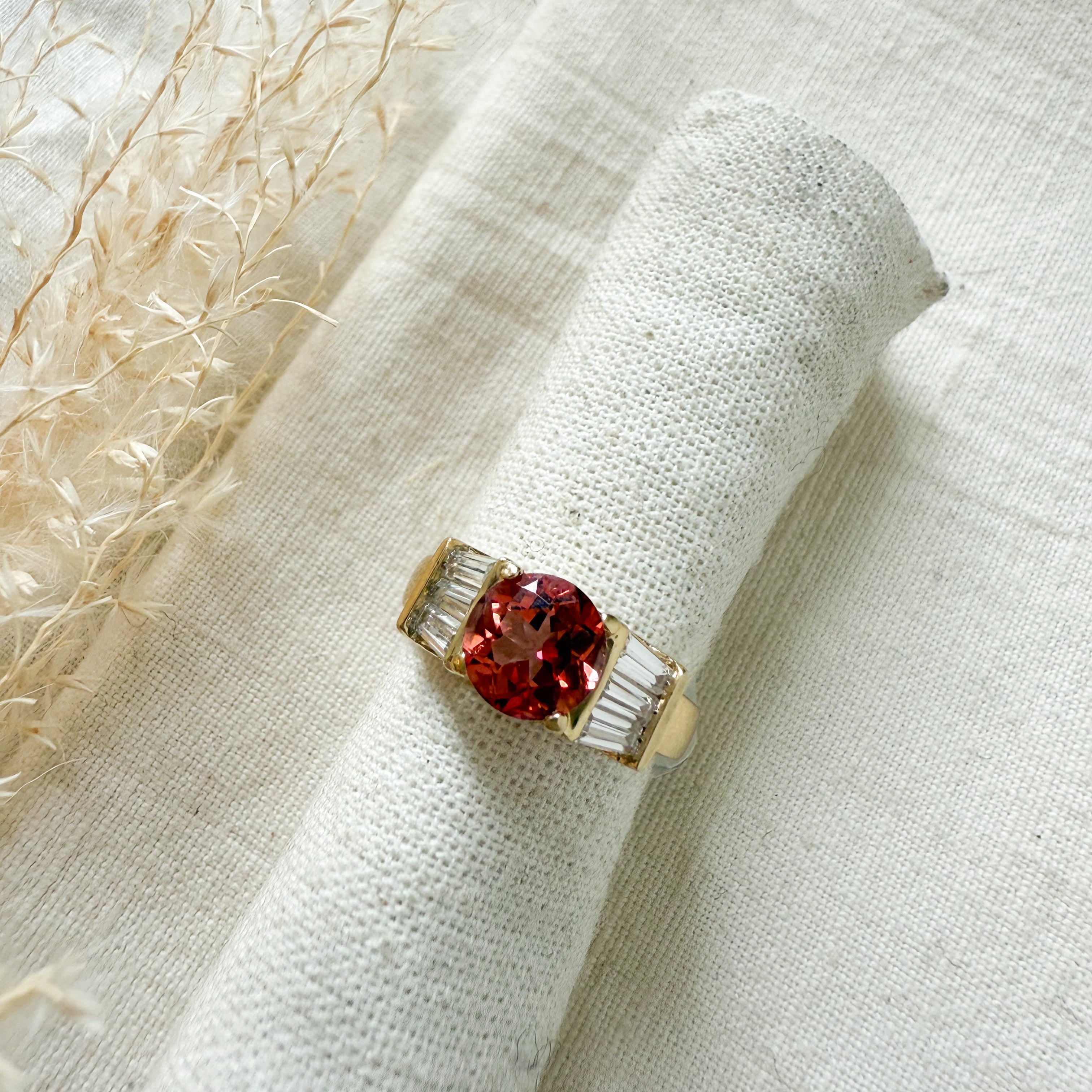 Claw set with a round faceted set natural imperial topaz 1.40 ct. estimated weight. The topaz is intense orange in colour with high intensity and minimal inclusions. There is a small culet chip. There are 6 tapered baguette diamonds 0.50 ct. estimated total weight. The clarity/colour grade is VS-2-SI-1/H-I with good proportion and finish.Size 6 1/4 weighing 3.3 grams.