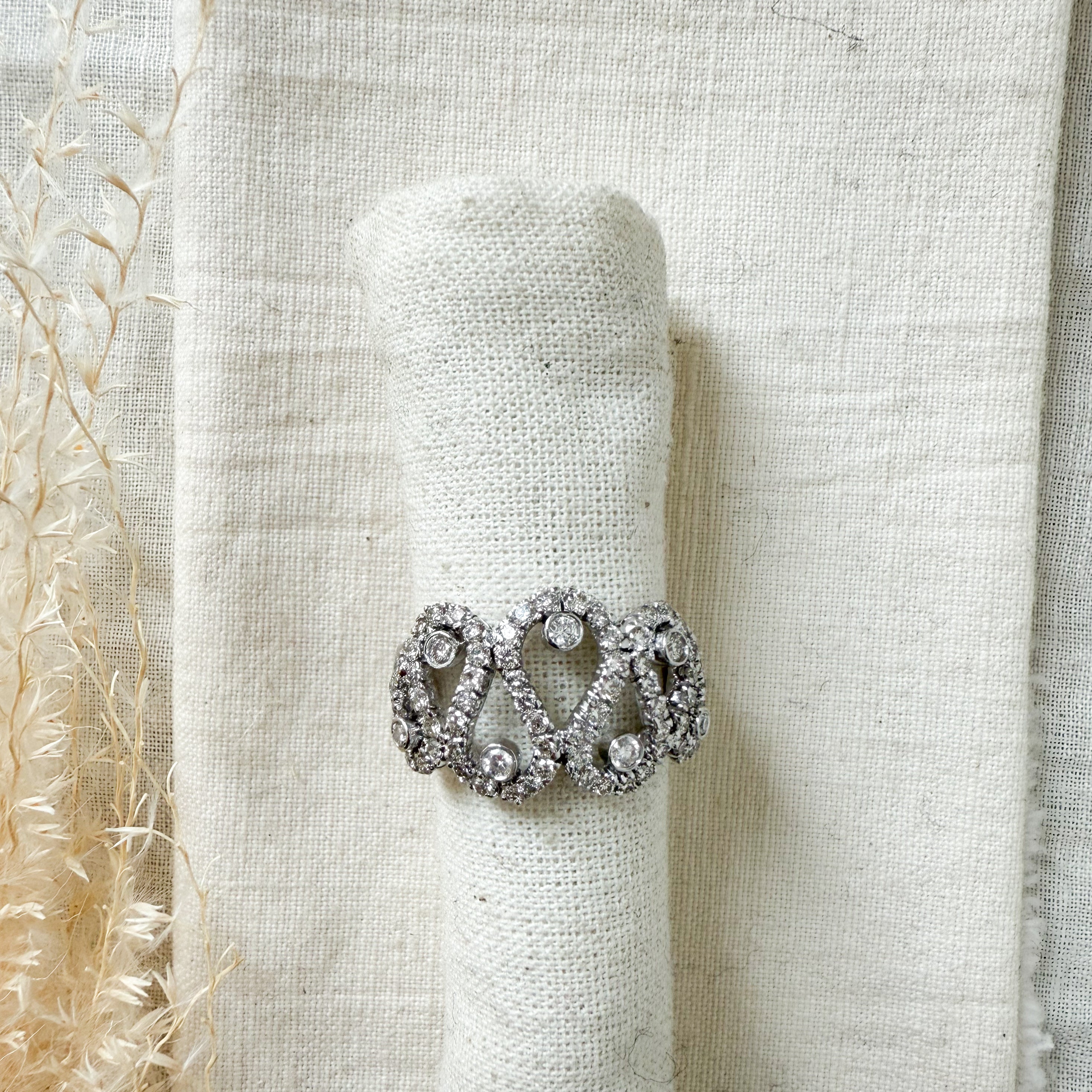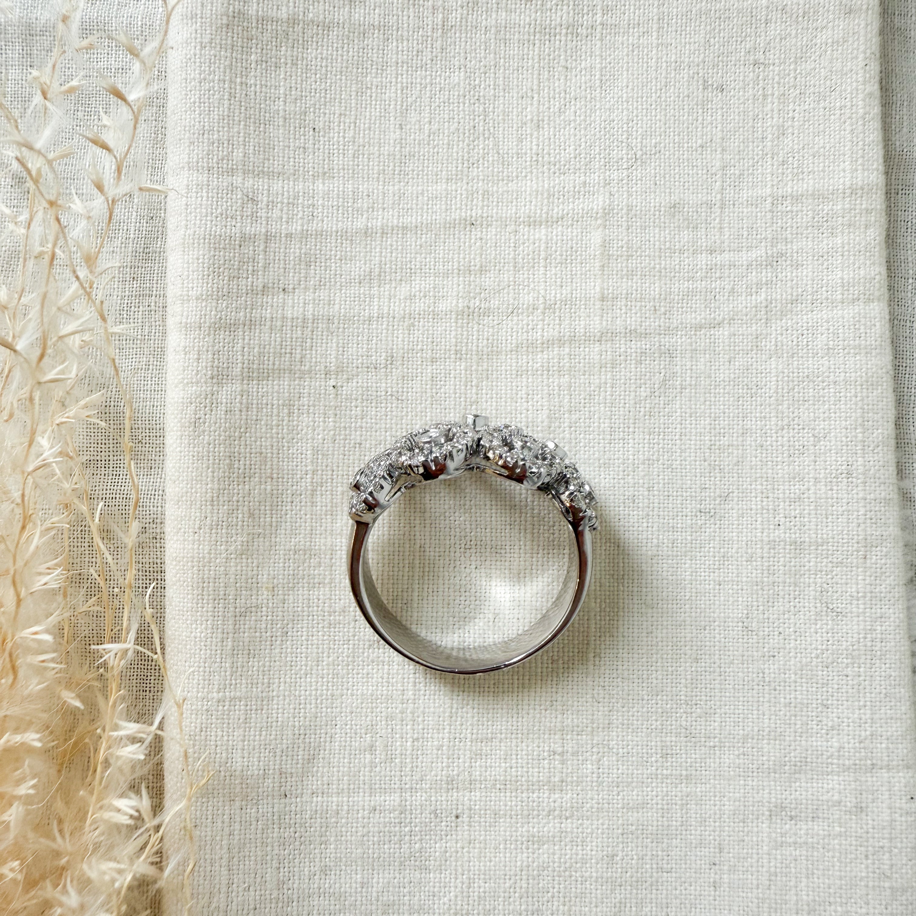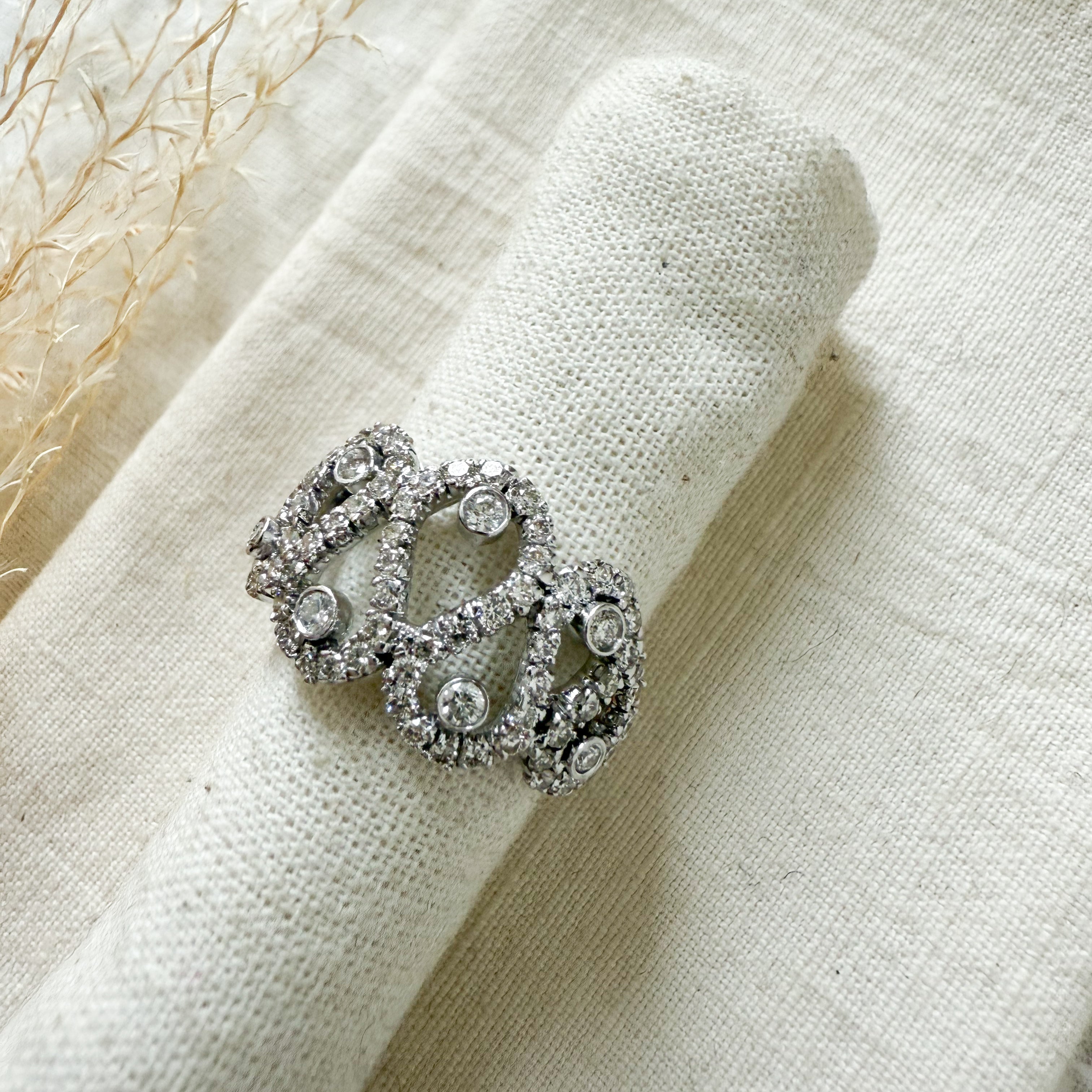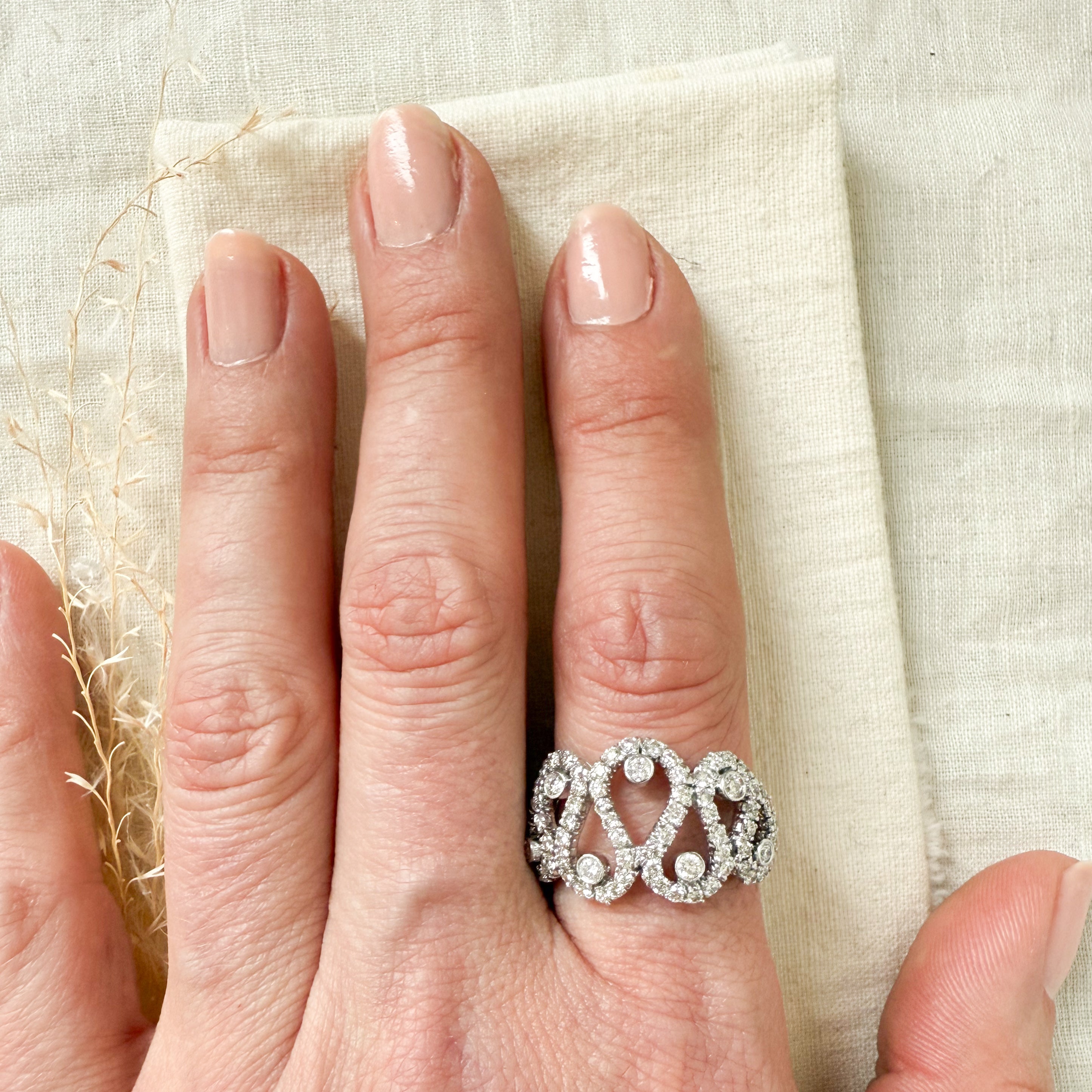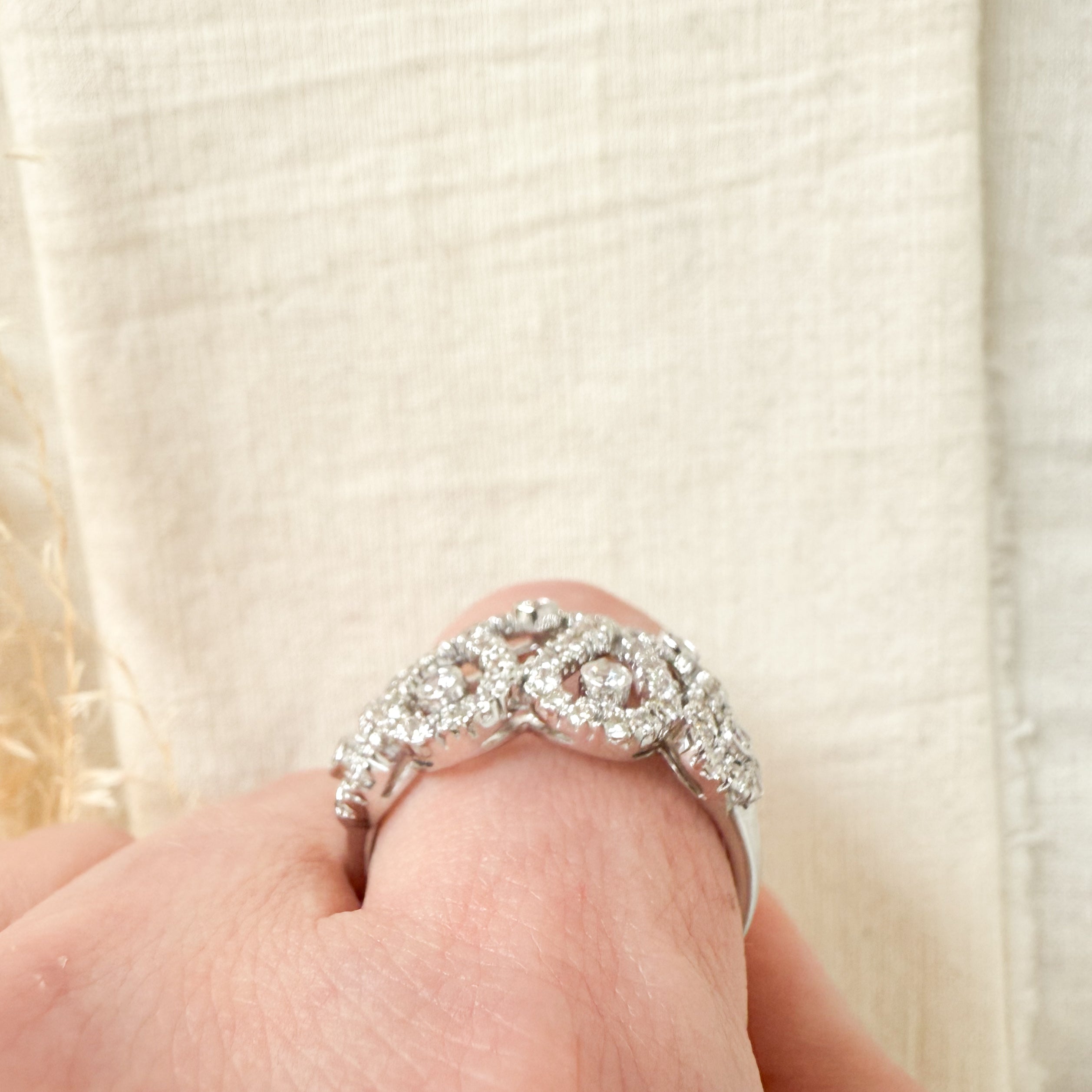 Bezel set with seven full cut diamonds and 66 claw set full cut diamond in wave design. 0.90ct. estimated total weight. The clarity/colour grade of the diamonds is SI1-2/H-I with good proportion and finish, size 9.5, weighing 9 grams.