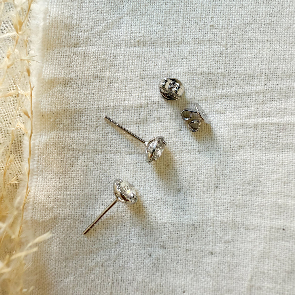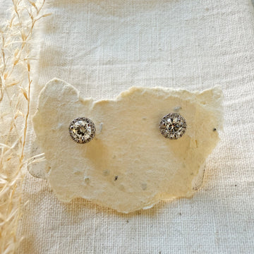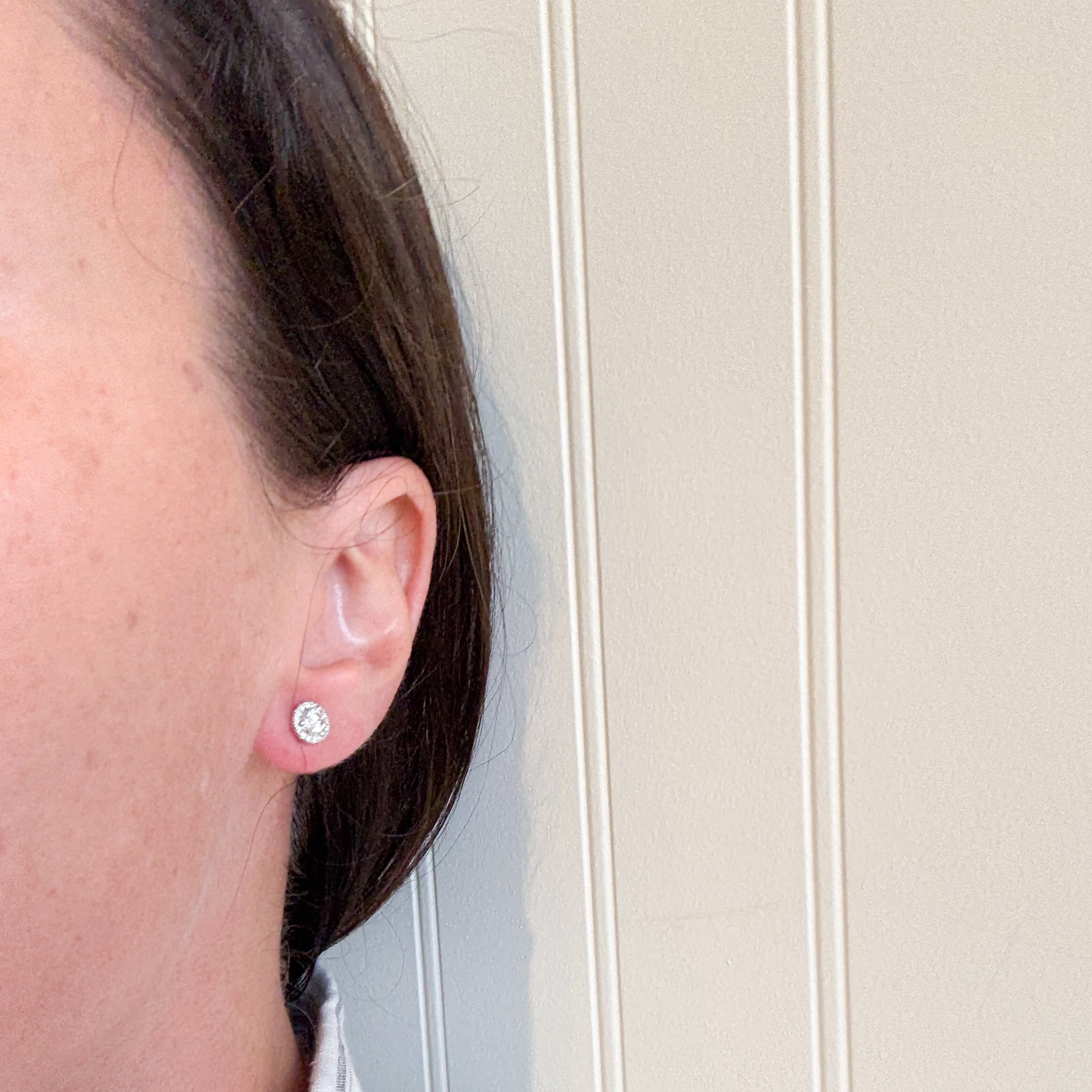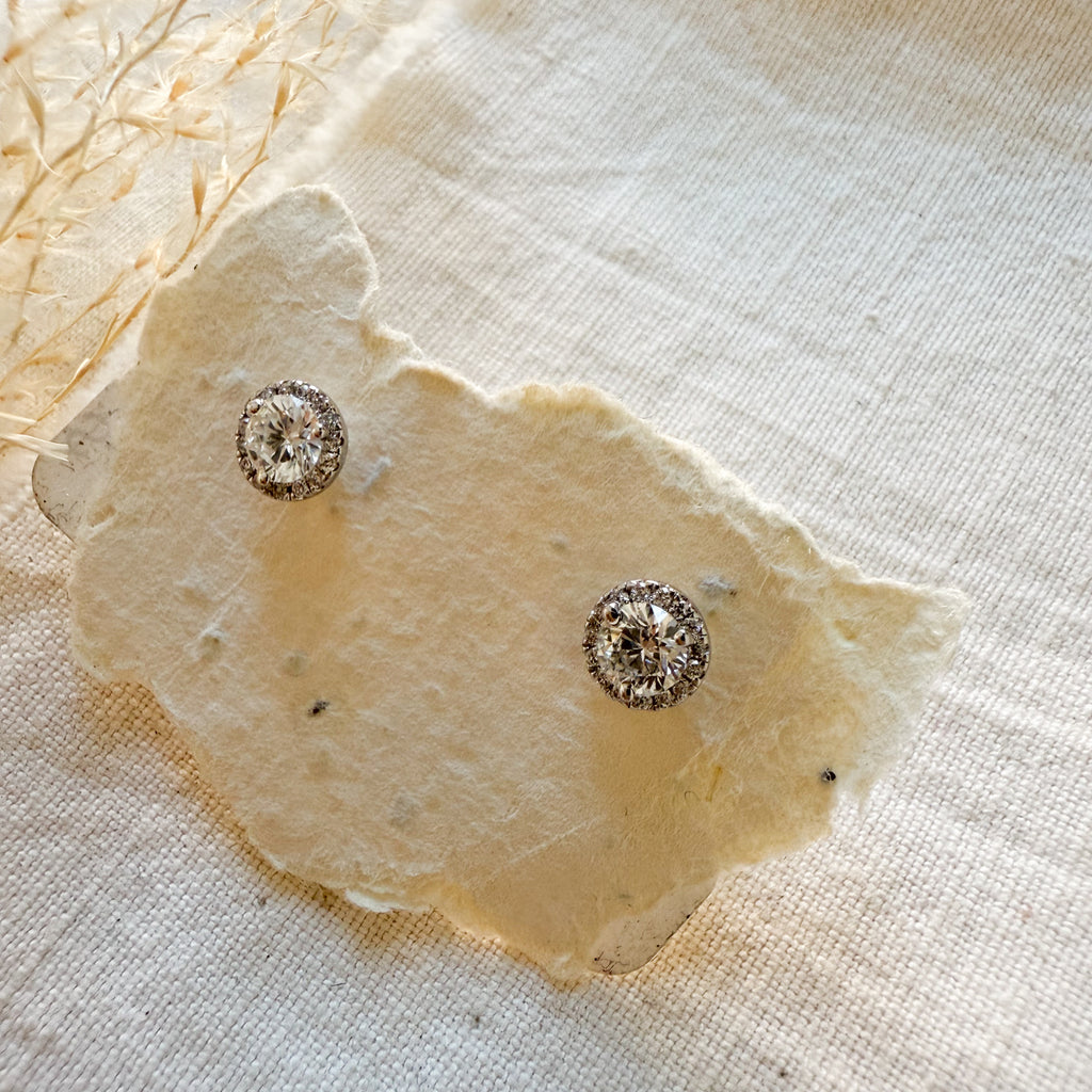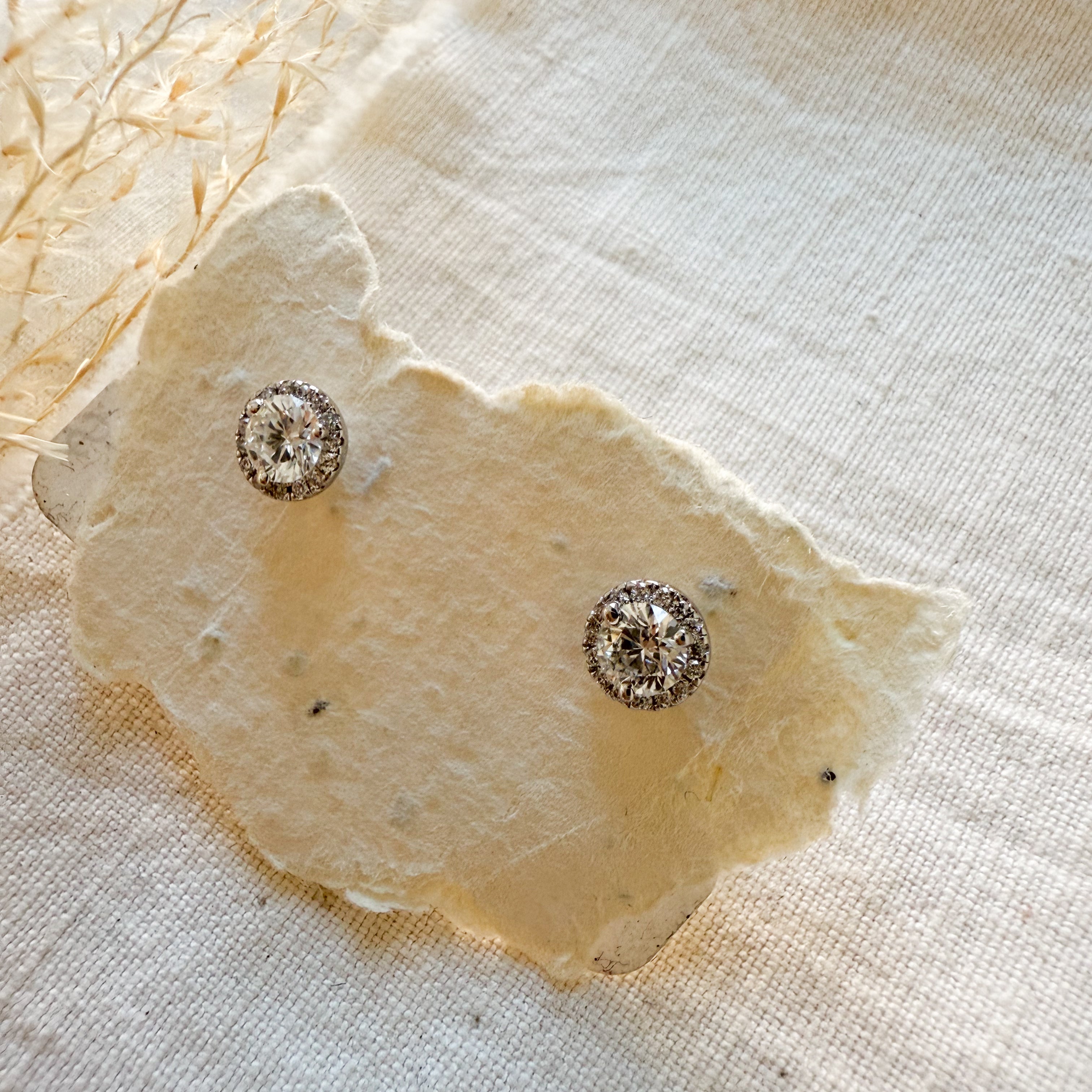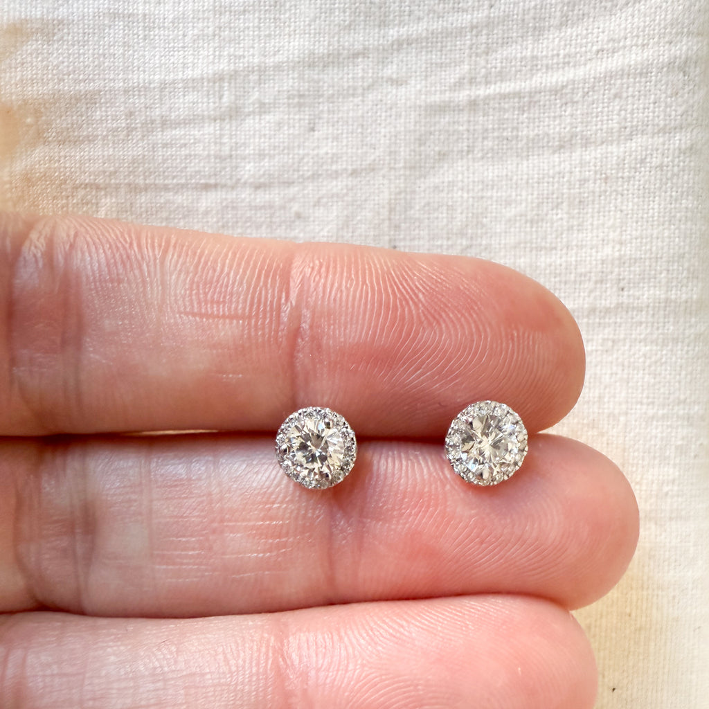 Custom made centre each set with round brilliant cut diamond measuring 4.65 x 4.60 x 2.85 mm. 0.76 ct. estimated total weight. The clarity/colour SI-2-I-1/G-H with good proportion and finish. There are 30 full cut diamonds, 0.005 ct. each, 0.30 ct estimated total weight. The clarity/colour grade SI-1-2/G-H with good proportion and finish. The earrings are pierced with friction backs weighing 1.7 grams. .