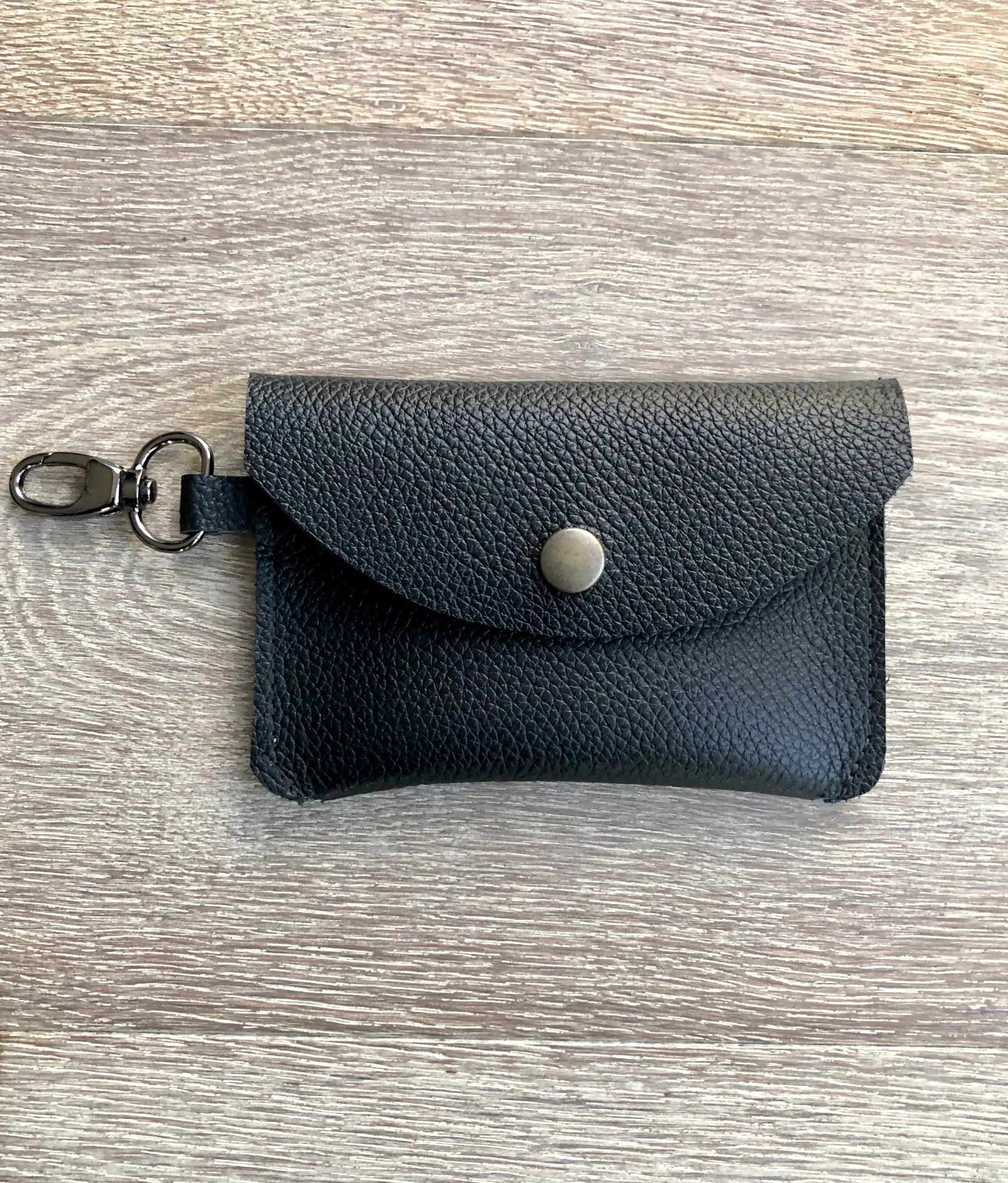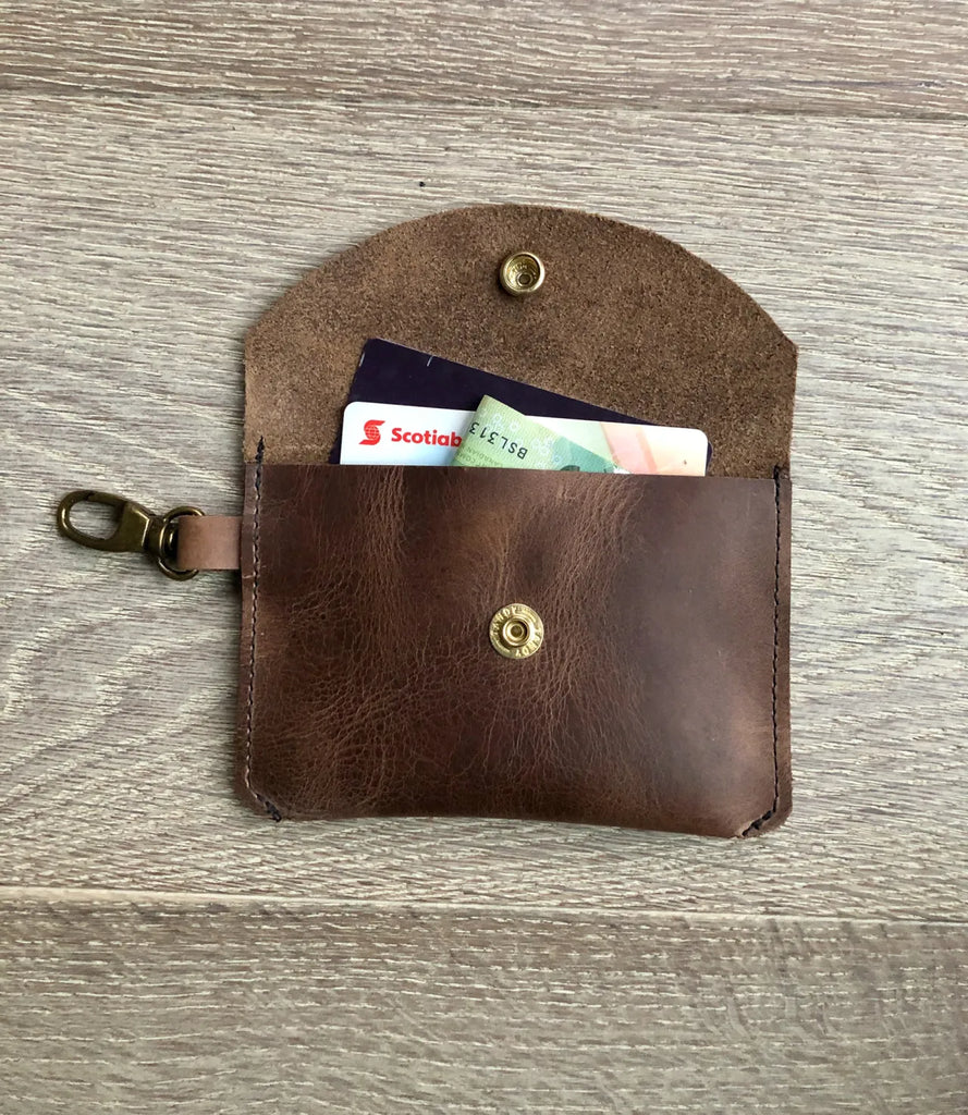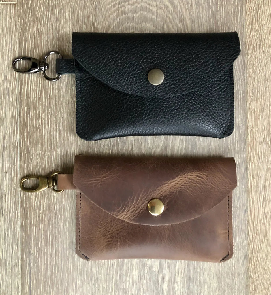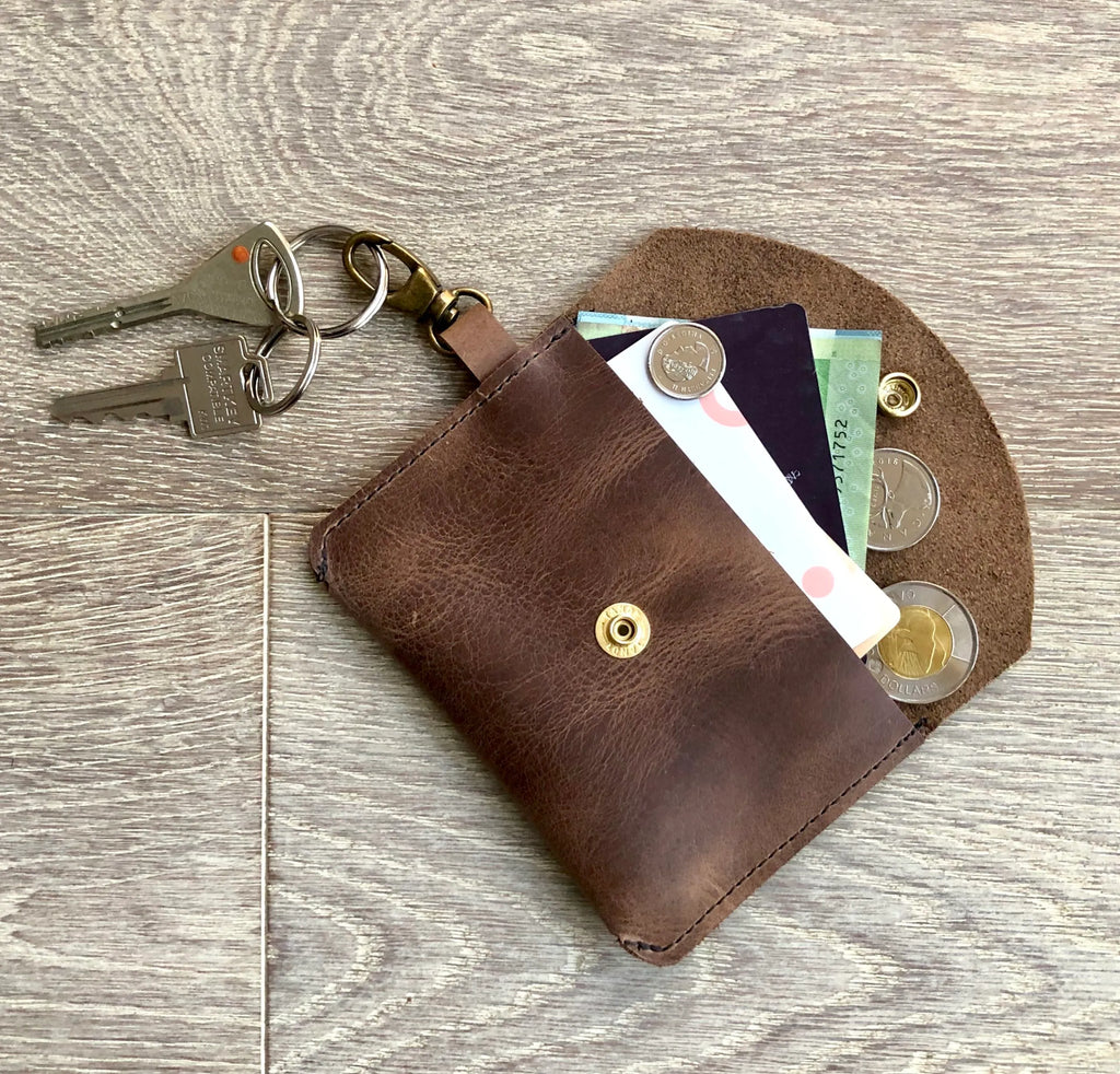 These leather keyring card holders are perfect for “get up and go”. With your essential cards – license, a credit card and a bit of cash – just clip to your keyring and you are out the door. Bonus – always makes your keys easy to find. No more digging around in your bag for your wallet, keep your most used cards with your keys or use the handy clip to attach it to your bag for easy access. These are compact but will hold several cards.