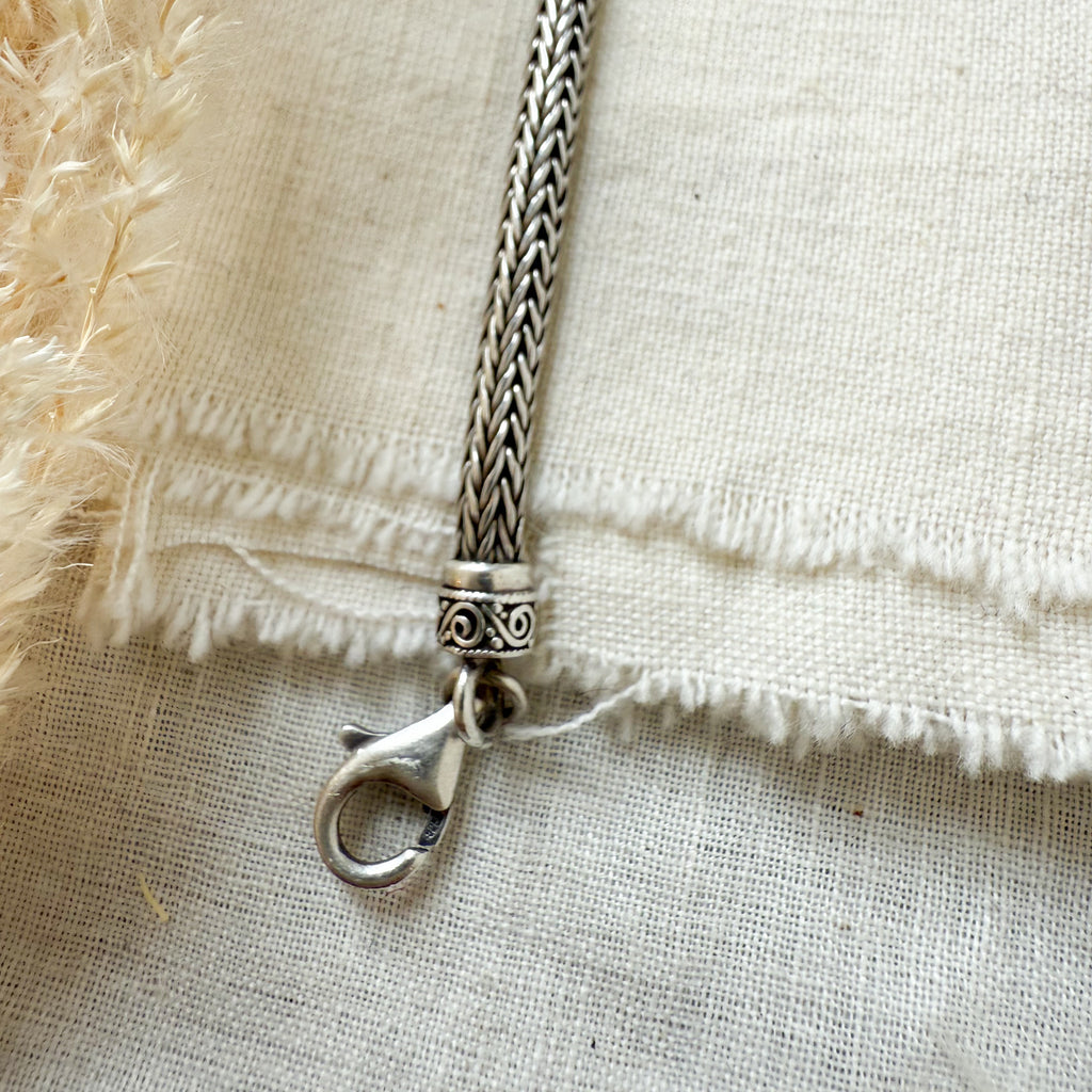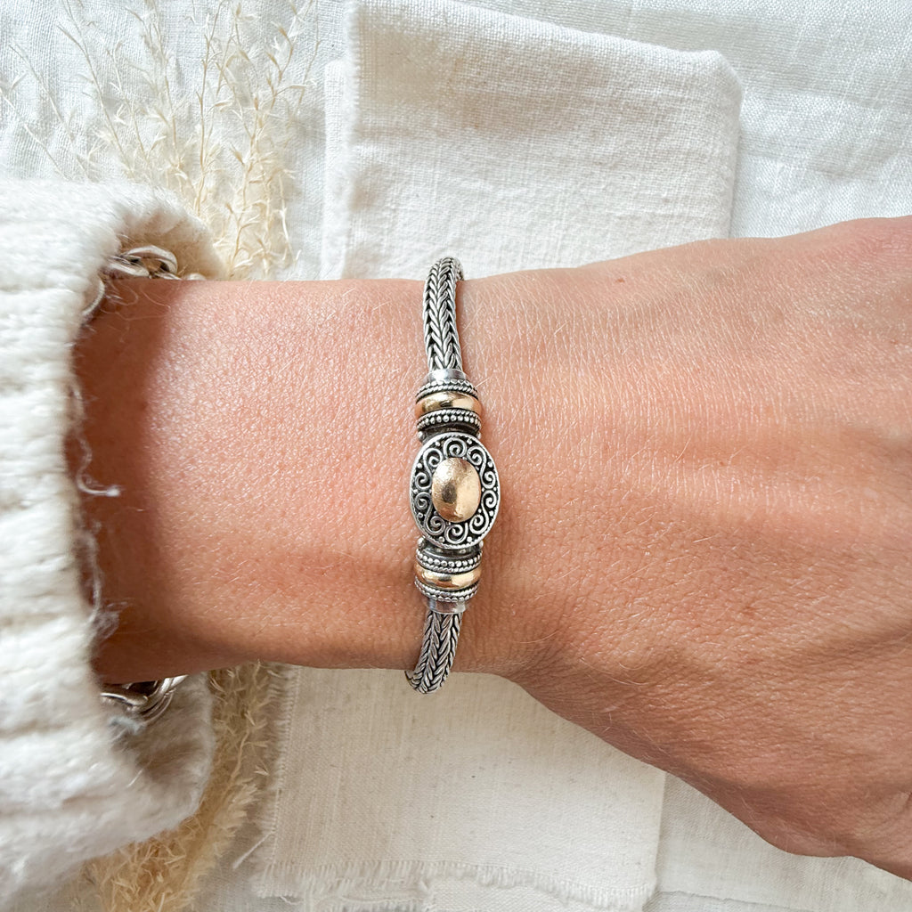 Oval centre plate 10 x 8 mm. engraved with a yellow gold centre and yellow fold side cuffs, 4 mm. woven bracelet, 7 inches long and weighing 13.8 grams. lobster clasp